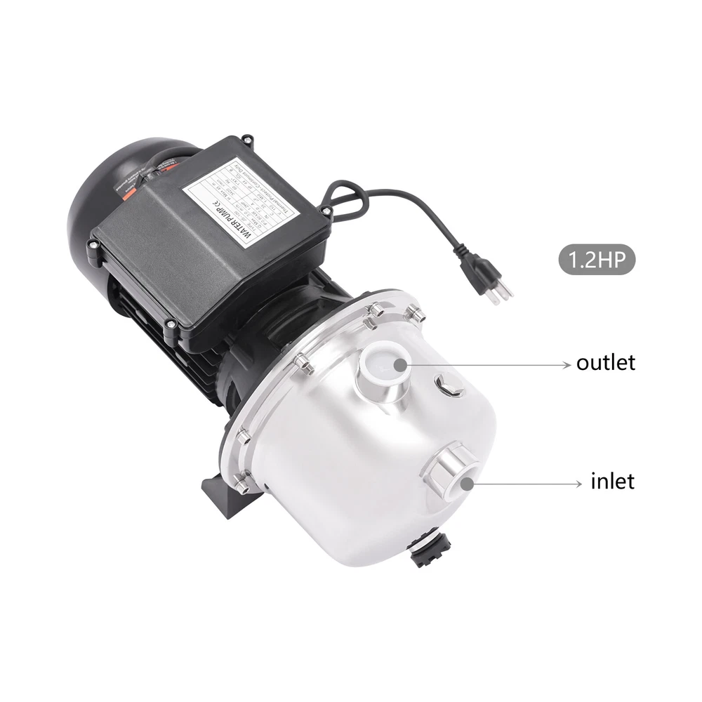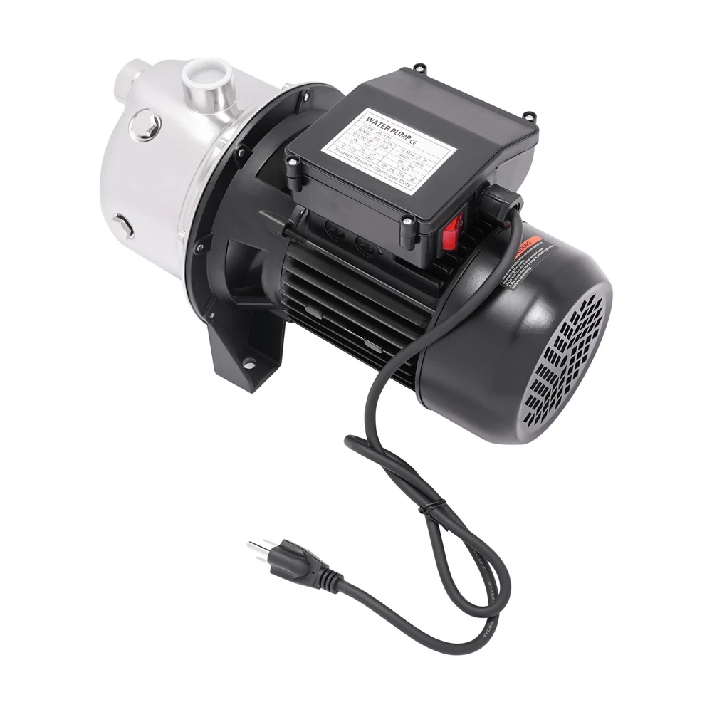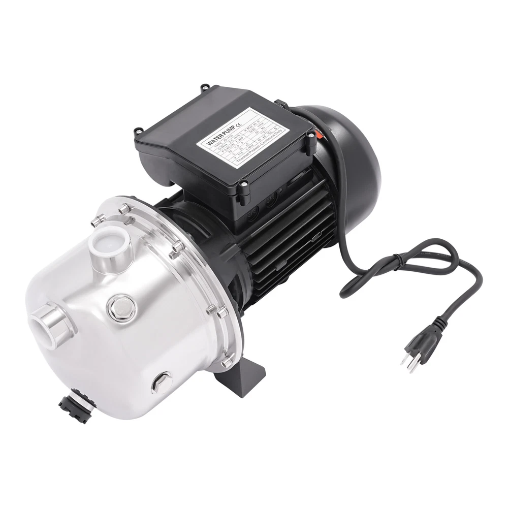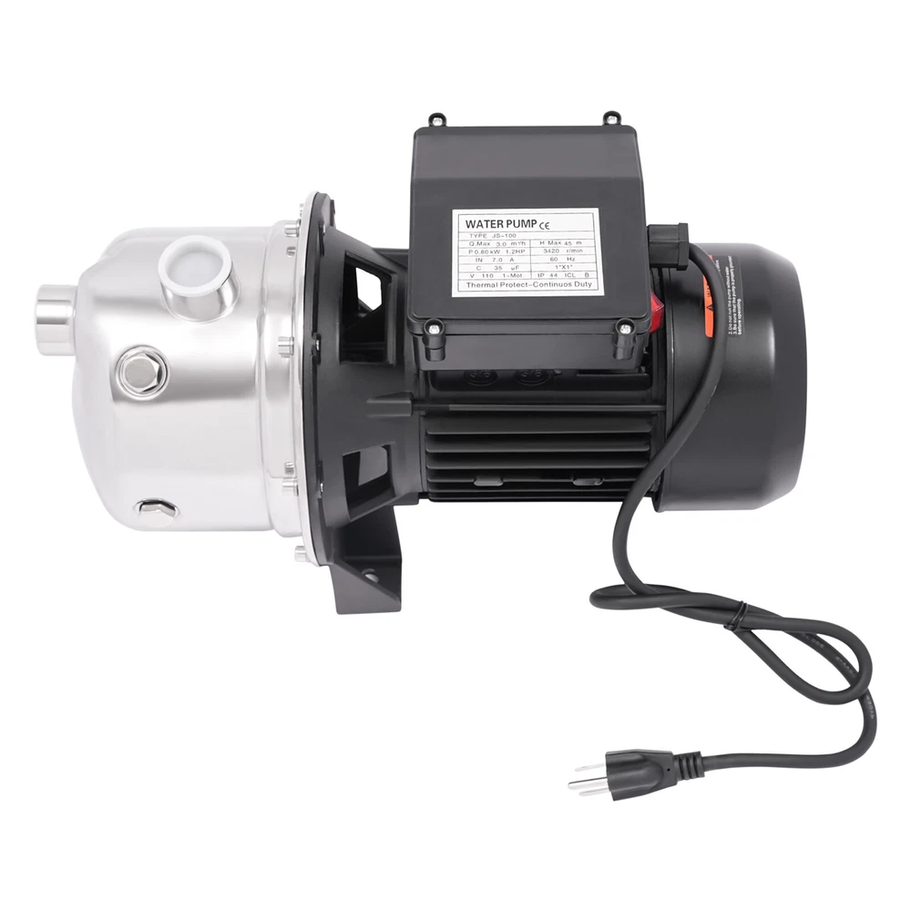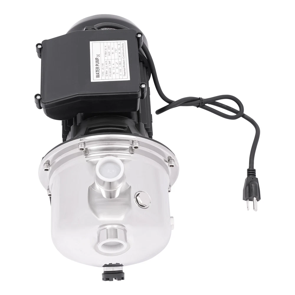 Specifications Material: Stainless Steel, Silicone Process: Painting and Polishing Motor: Pure Copper Motor Mounting Type: Floor Standing Power Source: Corded Electric IP Level: IP44 Waterproof Lever: IP68 Capacitance: 35μF Max Temperature: 55°C/131°F Voltage: 110V, 60Hz Input Current: 7.0A Power: 0.8KW(1.2hp) Rotating Speed: 3420rpm Water Pump Inlet: 2.54cm/1in Water Pump Outlet: 2.54cm/1in Max Sprinkler Volume: 3m³/h/792.52GPH Noise: 0-30db Maximum Lift Height: 45m/147.64ft Maximum Pressure: 4.5bar Maximum Suction: 8m/26.2ft Maximum Flow Rate: 3.2m³/h/845.35GPH Power Cord Length: 1m/3.28ft Gross Weight: 8.5kg/18.74lbs Product Size: 38*20*22cm/14.96*7.87*8.66in Package Included 1*Water Pump 1*Multilingual Manual 1*Sealing Tape 1.2HP 110V Shallow Well Jet Pump, Lawn Irrigation Pump for Home Farm Garden Lawn 1.2HP Portable Shallow Well Pump, Draining Irrigation Pump for Lawn, Water Pump Description If you are looking for efficient and simple irrigation methods, take a look at our water pump. Made of high-quality silicon and stainless steel with painting and polishing processes, this product provides quality assurance for your long-term use. Max 0.8kw power, 3420 rpm, and max.147.64ft lift make your work easier and more efficient. We believe it will be your assistant in agricultural production, breeding, or other work. Key Features Build to Last : The product is made of high-quality silicon and stainless steel, and adopts painting and polishing processes making it solid, and not prone to rust and corrosion, so it can remain beautiful and practical for a long time. High Efficiency: The 0.8KW pure copper motor, 3420rpm speed, 845.35GPH maximum flow rate, 26.2ft maximum suction, 4.5 bar maximum pressure, and tight bearing make your pumping and watering work faster and easier. Delivery Assistant: The maximum lift of the pump is 147.64ft, which allows you to irrigate farmland, fish ponds, and orchards for a long distance, saving the time and cost of manual transportation. Safety Guard: It has built-in thermal, IP68 waterproof level, overload protection, and is equipped with uniform heat dissipation holes and a fan, which can timely reduce the temperature during operation, and reduce potential safety hazards, thus extending the service life of the product. Good Sealing Performance: The product comes with a PTFE sealing tape, you can wrap it around the area that needs to be sealed to avoid water ingress or leakage, bringing you a better using experience. Low Noise: It runs very smoothly with little vibration and noise( 0-30db ), which can bring you a quiet working environment. Easy to Use: With a detailed instruction manual, you just need to follow the steps in the manual to pump, sprinkle, etc. Ideal Gift: Such a practical product is an ideal gift for family and friends who need garden watering and vegetable garden irrigation. Protective Package: To prevent damage to the product due to bumps in transit, we place air column bag and foam to protect the product as much as possible. Quality Service: We are honored that you have chosen our product. We have sufficient confidence in the quality of the product so that you can buy it confidently. But if you have any questions, you can contact our customer service, he will patiently answer and solve your problems . Details Standard Water Inlet and Outlet: The product adopts an NPT 1-inch large diameter water inlet and outlet, which can be matched with different types of water pipes and is very practical. Sealing Ring: The silicone sealing ring is used to avoid water leakage and reduce waste. Support Feet: They can better maintain the stability of the product and ensure smoother operation. Application It is suitable for sprinkler systems, irrigation, daily water delivery, and drawing water from shallow wells, ponds, lakes, rain barrels, tanks, and more. It can be used as a sprinkler pump, well pump, or booster pump and can pressurize your home for solar, washing machine, water heater, tap water, shower, etc. Specifications Material: Stainless Steel, Silicone Color: Black, Silver Process: Painting and Polishing Motor: Pure Copper Motor Assembly Required: Yes Mounting Type: Floor Standing Power Source: Corded Electric Plug Type: US Standard IP Level: IP44 Waterproof Lever: IP68 Capacitance: 35μF Max Temperature: 55°C/131°F Voltage: 110V, 60Hz Input Current: 7.0A Power: 0.8KW(1.2hp) Rotating Speed: 3420rpm Water Pump Inlet: 2.54cm/1in Water Pump Outlet: 2.54cm/1in Max Sprinkler Volume: 3m³/h/792.52GPH Noise: 0-30db Maximum Lift Height: 45m/147.64ft Maximum Pressure: 4.5bar Maximum Suction: 8m/26.2ft Maximum Flow Rate: 3.2m³/h/845.35GPH Power Cord Length: 1m/3.28ft Gross Weight: 8.5kg/18.74lbs Product Size: 38*20*22cm/14.96*7.87*8.66in Package Size: 46*30*26cm/18.11*11.81*10.24in Package Included 1*Water Pump 1*Multilingual Manual 1*Sealing Tape Notes Adding water to the pump head until it is full helps to speed up the inlet flow rate. The inlet pipe(not included) shall not be excessively bent and the end pipe (not included)shall be completely submerged. Please note that it is only suitable for clean water. Please read the operating manual completely before use, and pay particular attention to the safety instructions included. Please discharge the waste water if not used frequently and please do not run the pump without water. Please do not wet the motor before first use, and fill the pump head with water to wet the impeller. Please perform a water test after the installation is complete to check for leaks and other conditions. Please make sure that the air inlet joint or pipe is completely sealed and air-tight, and that hose used for the water inlet pipe is not sucked and deflated. Check the coupling to see if the internal drive is damaged. Please allow the slight color difference caused by the shooting light and 1-3cm error due to manual measurement, and make sure you do not mind before you order. Payment Delivery details Terms of sales About us Co