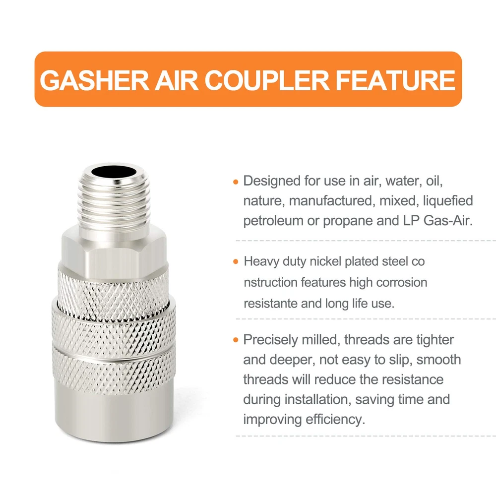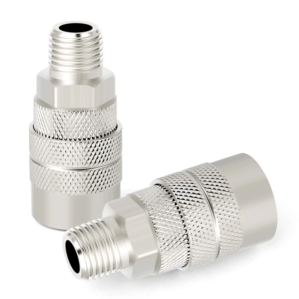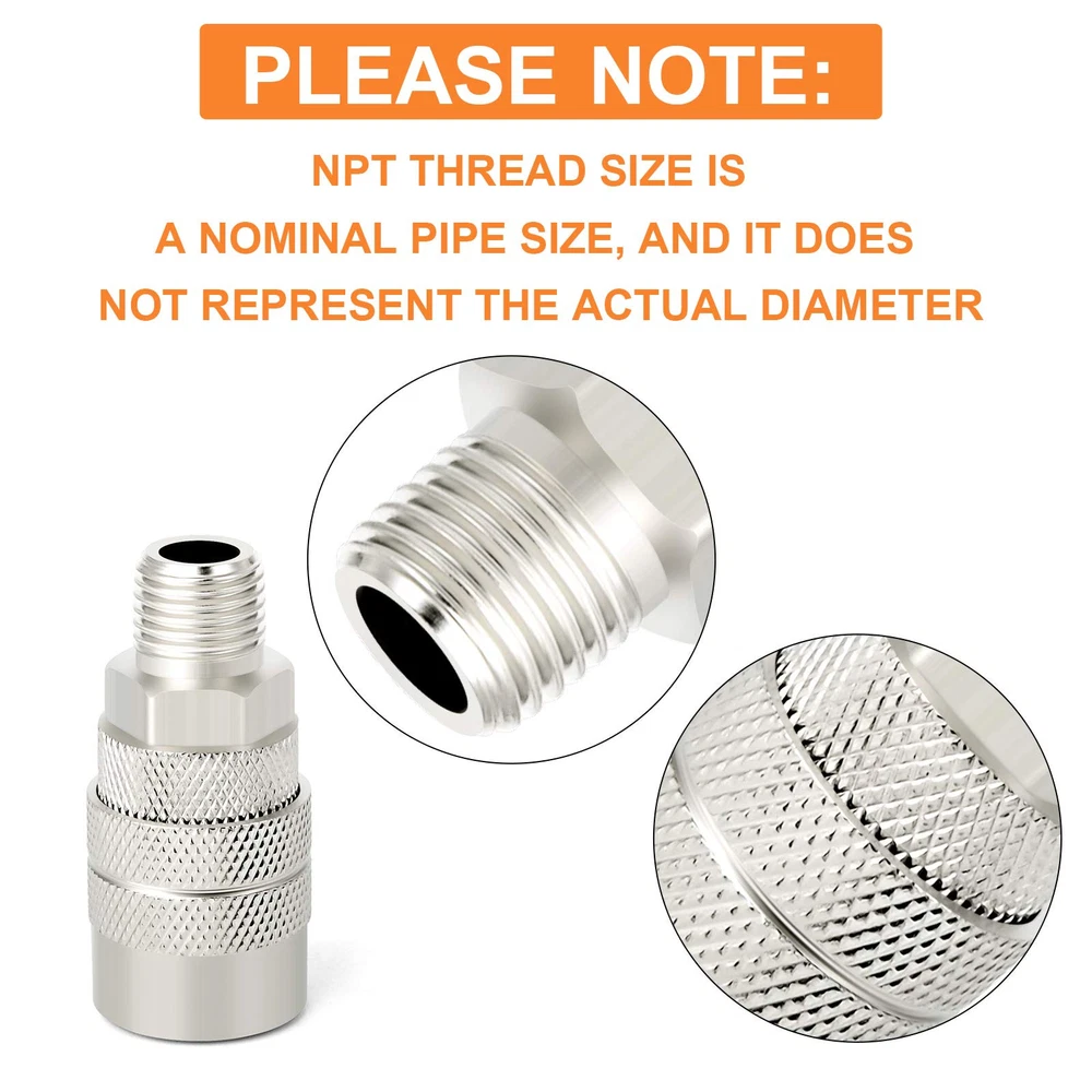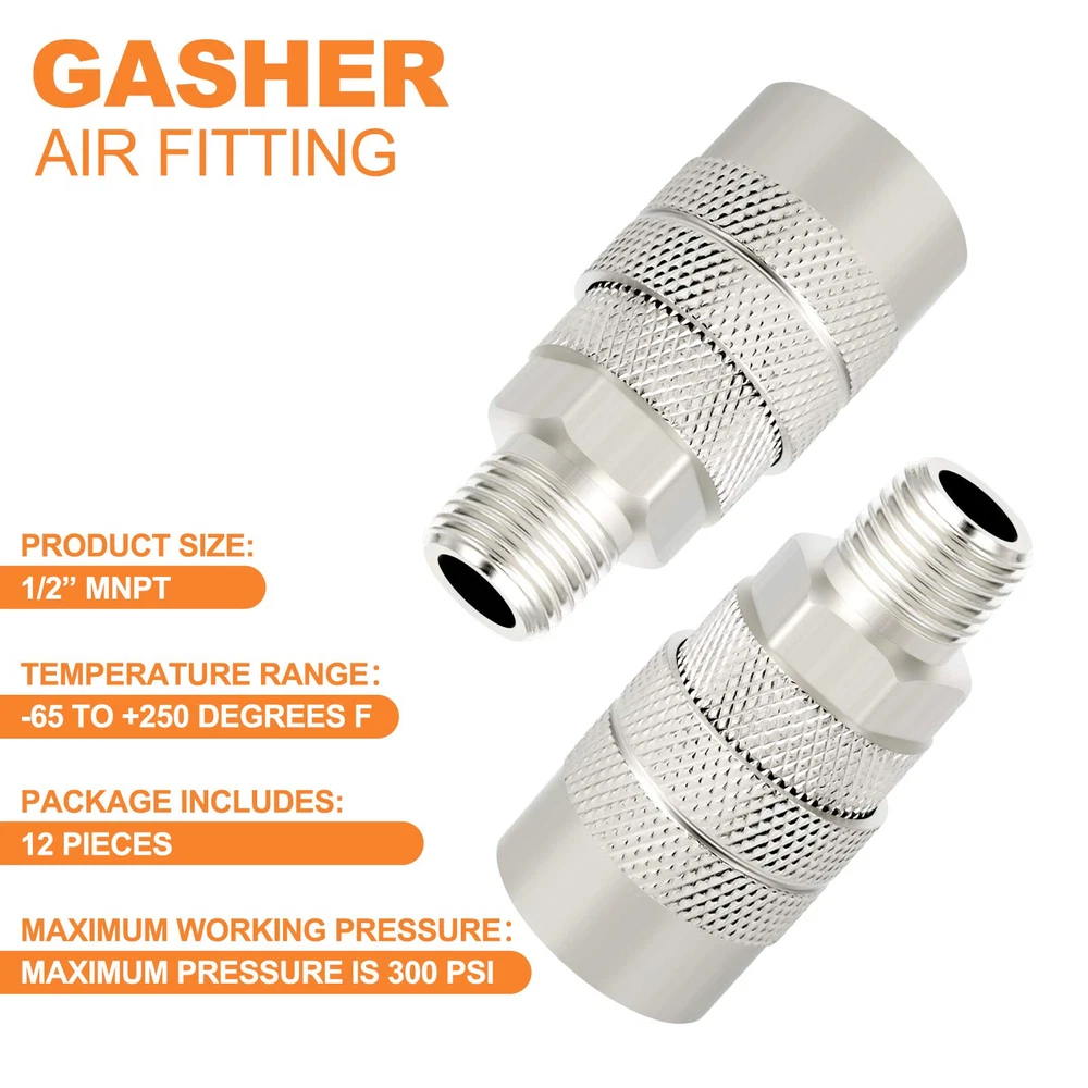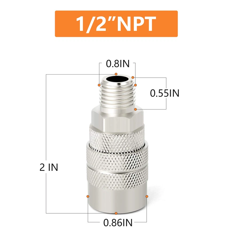 SIZE: 1/2 inch NPT male thread × 1/2 inch body size, interchangeable with most manufacturers; maximum working pressure is 300 psi.1/4'' basic flow size with Max working pressure of 300 PSI. HIGH QUALITY: High strength, high hardness premium solid brass with thick wall, more durable than iron and iron galvanized pipe fittings. MULTIFUNCTION: For switching quickly between different air tools and accessories with ease during applications. COUPLER SLEEVE:A better grip when connecting and disconnecting; sleeve guard helps reduce the risk of accidental disconnects and protects the coupler sleeve OCCASION APPLICATION: Great for professional jobsites, in automotive shops or at home in the garage for air hose, air compressor, air tools, air nailer, air blow , pressure washer