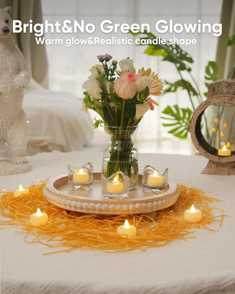DIY TEALIGHTS CANDLE: The flat tea lights candle edge is perfect for DIY. You can place your favorite decorations, write warm blessings, and draw the patterns you want. Warm white light LED tealight candles better simulate real tealight candles 12PACK SET: 1.41"W x 1.37"H battery tea lights candles(Battery pre-installed) can be the perfect replacement for traditional candles used at home, avoiding the fire hazards of traditional candles, do not worry about candles being blown out by the wind 100 HOURS LED CANDLES: Battery powered candles last 20 times as long as the traditional wax tea lights, you can also replace the battery of the flameless candle by opening the battery cover. AG10 Coin Batteries are small parts, Not for children under 3 yrs ADD ATMOSPHERE: These LED flameless tealight candles can be placed on the dining table or in the room to add a warm atmosphere, electric tealight candles can also be decorations during weddings, proposals, Halloween, Christmas, Holidays, or important occasions SIMPLICITY DESIGN: You only need to gently flip the switch at the bottom to control the working state of flameless candles. Flameless tea light candles are now available in different quantities of 12/24/50/100/150 packaging, which can be selected according to your needs
