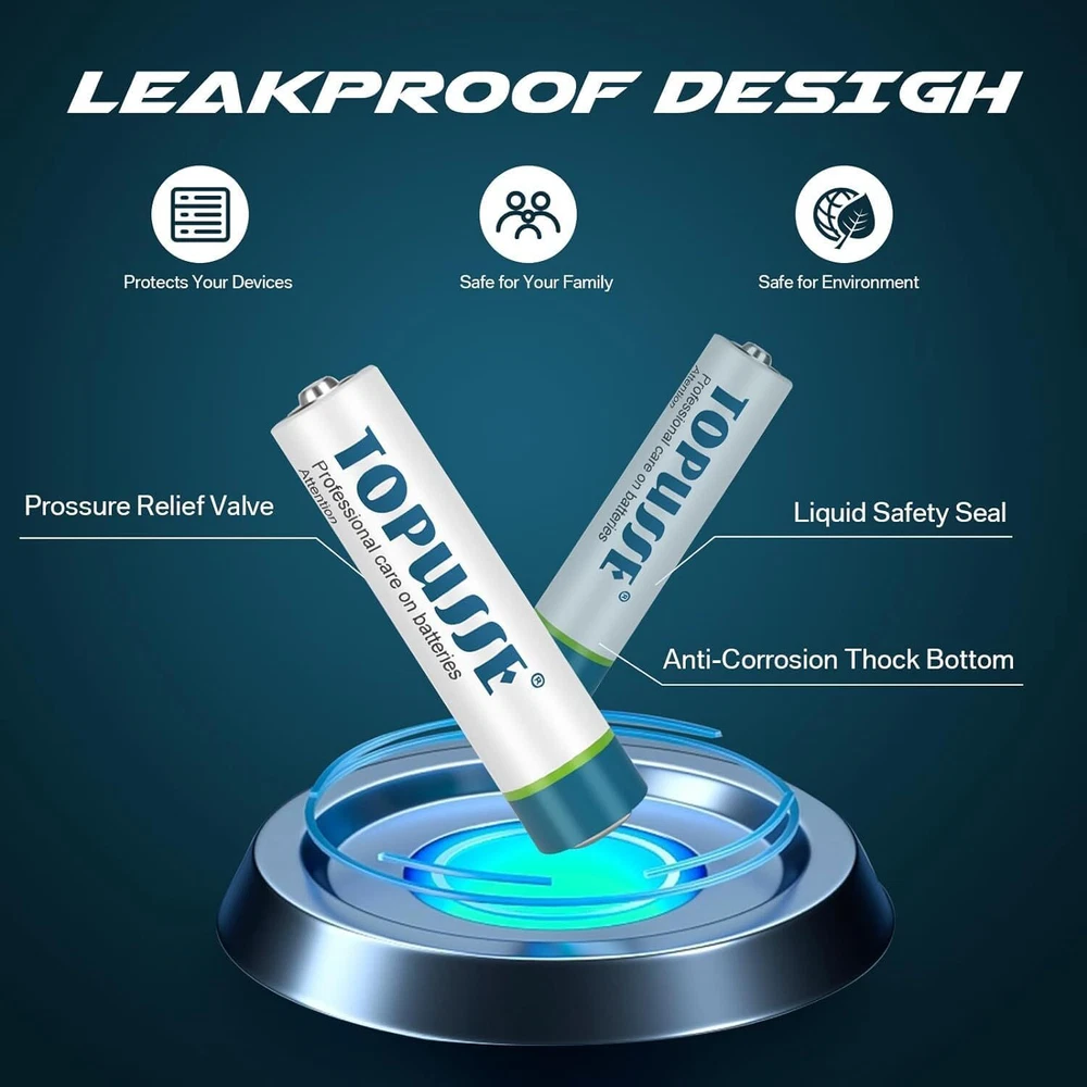 ✅【Long LASTING POWER】Topusse ultra alkaline batteries deliver long lasting power and performance,that is consistent and reliable for everyday use and emergency situations ✅【10-YEAR SHELF LIFE】 All alkaline batteries are always fresh and maintain power with an impressive ten-year shelf life in proper storage, Providing power in everything from emergency situations to playtime ✅【LEAKPROOF DESIGN】AA batteries are designed with a double layer internal structure housed within a stainless steel cover so that they are 100% leakproof. Avoid short circuits, mixing and matching old batteries with new ones. ✅【ENVIRONMENTALLY CONSIDEREDE】Our 1.5-volt alkline batteries contain no mercury or cadmium, making them a smart choice for your family and for the environment. ✅【IDEAL FOR EVERYDAY USE】These batteries are compatible with all devices that require 1.5V AA batteries for daily household devices such as blink Camera game controllers, remote controls, and children's toys, and so on. Topusse alkaline aa batteries are great to have on hand for a variety of everyday household devices, including clocks, remote controls, game controllers, digital cameras, toys and more. batteries won't leak and are designed to last ten years in storage. The 1.5-volt batteries contain no mercury or cadmium, making them a smart choice for your family and for the environment. our mission is to provide trusted and dependable power for everyday needs