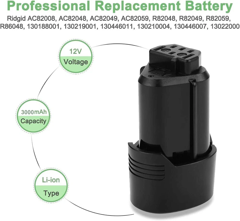 About :is specialized in designing and manufacturing high quality replacement batteries.constantly improve the products and service to satisfy buyer’s updated demand.try it best to cover the most popular brand: Bosch, Hitachi, Makita, Etc.About Li-ion battery:Li-ion battery doesn’t contain harmful substance (Cd, Pb, Hg), protect your health.Li-ion battery doesn’t contain heavy metal, make no pollution to the environment.Li-ion battery have no memory effect, it can be charged or discharged as you want.Li-ion battery’s energy density is higher than Ni-CD battery, make it smaller, lighter.Replace:Ridgid: AC82008, AC82048, AC82049, AC82059, R82048, R82049, R82059, R86048, 130188001, 130219001, 130446011, 130210004, 130446007, 13022000Fit for:Ridgid Lithium ion 12V Power Tools R82007, R82008, R82008N, R82009, R82009K, R82236, R82237K, R82237N, R82238, R82238K, R82238N, R82920N, R8223400, R8223402, R8223500K, R8223500N, R822350001, R822350002, R822350004, R9010, R9004N, ZRR82235, ZRR92009Package:1 x Replacement BatteryGuarantee:30 days full refund and return, 365 days limited warranty, 24 hours warmly service.Warm Prompt:Please use your batteries at least once a month, long-term storing is not suggested.Please clean the battery contacts using a cotton swab with alcohol when necessary.Please let the battery totally cool down and have a adequately rest before recharge.Please store your batteries in the ordinary temperature and air-drying environment.Please fully charged and discharged the battery for 3 times to reach best conditions.Please don’t use a strong power to make your tools run again when it were stucked. Professional replacement battery for Ridgid R82007, R82008, R82009, R82048, R82049,R82059, R86048 etc. For Ridgid 12v battery replacement are CE, FCC, PSE, RoHS certified. Reach or exceed OEM product criterion. 12v battery for Rigid made by high-quality core, no memory effect, low self-discharge and eco-friendly. High-capacity 12v ridgid battery, provide much longer runtime within a full charge. 30 days full refund and return, 365 days limited warranty, 24 hours warmly service,The best after-sales service,bring you the ultimate shopping experience.