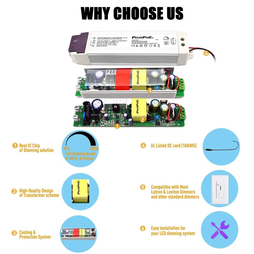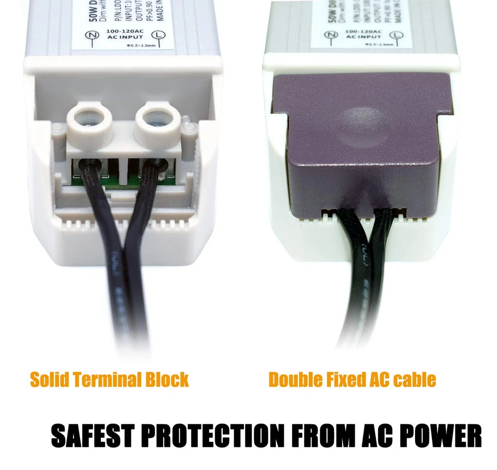 This Dimmable LED transformer is Compact, Quiet, great operating efficency, Well Compatibility, This is an 12V50W Triac dimmable power supply. with most AC wall dimmer like Lutron, Leviton and most other household dimmers. Can be used for many 12v constant voltage LED lights and other applications. Warning: Do not overload. Overload will cause the AC adapter to fail. We are not responsible for misuse of power supply. It is recommended not to exceed the AC power supply's capacity. Please calculate your load before connecting the power. Specification: Output Current: 4.15A ; Output Voltage: 12V Input Voltage: 100V-130V 50/60HZ Size dimension: 195x45x33mm NON-waterproof use for indoor dry location only. Quiet, Smooth, Full range flicker-free dimming for 12 volt LED Lighting such as LED strips, modules, light bars, puck and other LED accent lights with most wall dimmers like Lutron, Leviton, ABB and higher end Lighting control systems, also with 12 volt, low-voltage LED dimmers and Color controllers No minimum Lighting load required for wide range dimming, no de-rating is required; load up to 100% of the model’s 50 watt capacity Easy to Install, Mount, and Wire. Comes with10inch DC cord ( 2.1x5.5mm DC Jack included) can be removed for use in hard wire installations. Short-Circuit / Over Current / Over Voltage/ Low-Voltage and Auto-recovery Mode.