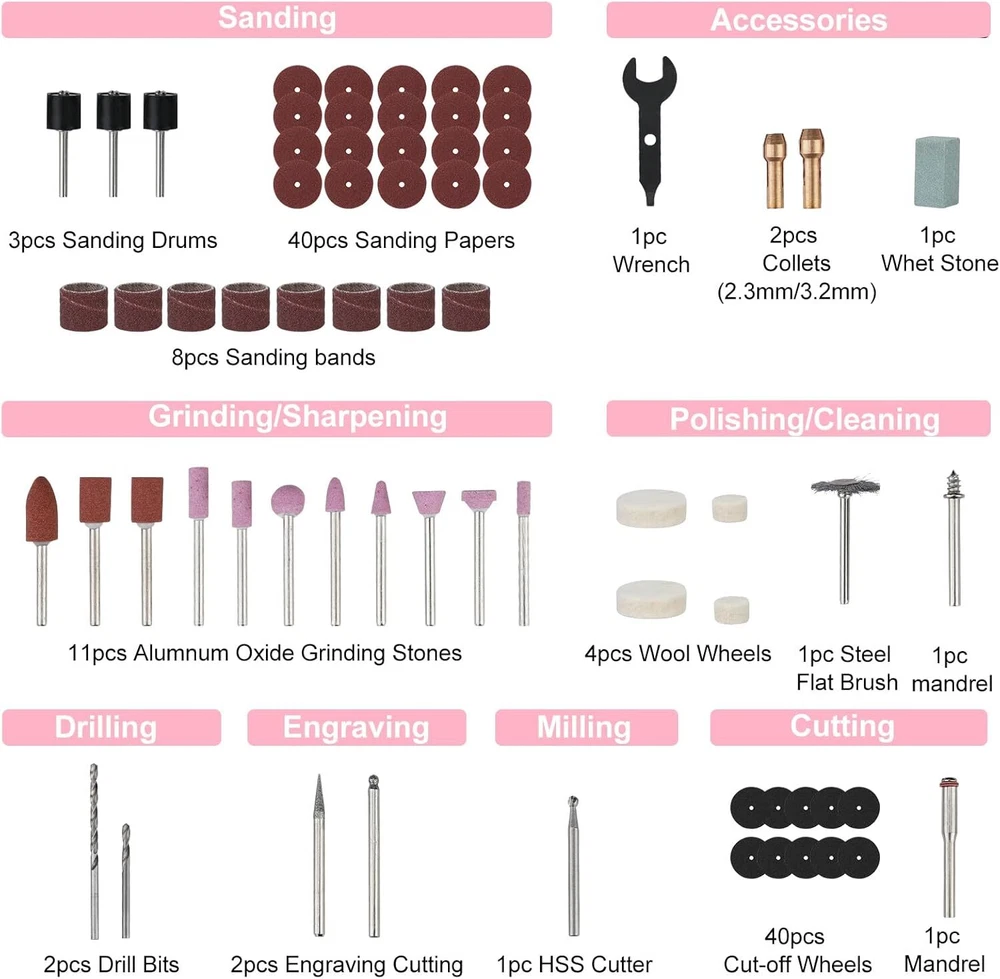 Voltage 12 Volts Power Source Battery Powered Recommended Uses For Product Grinding, Sanding, Cutting Color Pink About this item 12 V Powerful Wireless Rotary Tool: This pink rotary tool delivers significant power despite being cordless. The 2.0 Ah lithium-ion battery powers the 12-volt motor and allows users to sand, grind, and cut quickly without issue. The rotary tool boasts a significant speed range, with five convenient speeds: 7500, 15000, 20000, 25000, and 32000 rpm. This allows you to choose the best speed for the job at hand. Perfect for Kinds of Materials: The cordless rotary Tool kit includes 114 accessories in total with grinding stones, sanding pads, felt wheels, mandrels, and much more. It comes with a tow size (3/32" & 1/8" ) universal chuck, allowing you to change accessories on the rotary tool freely. The number and variety of accessories make this tool perfect for crafters working with a lot of materials. All accessories can easily be stored in a plastic case Compact & lightweight: The entire rotary tool only weighs 1.38 pounds and is just 10 inches in length, is an excellent choice for those who don't want a cumbersome cord attached to their tool. The rotary tool has equipped with a hook, hanging in the air with a rope, saving effort for long hours of work. The tool has very little vibration or sound, so you won't have that buzzed hand feeling either Amazing Gift for DIY Enthusiasts: All rotary kits are packed in a light carrying bag, suitable for sanding, engraving, polishing/cleaning, and drilling. The tool bag is made of high-quality polyester fabric, wear-resistant, scratch-resistant, and tear-resistant. Double-pull zipper design for easy organization and access High-Performance Craft Tool: WORKPRO rotary tools are small handheld devices with rapidly spinning motor tips designed to accept a wide range of bits and attachments. This makes them perfect not only for a wide range of household tasks, including repairs and maintenance but also for crafting and hobbies. There are even rotary tool attachments designed to care for pets’ toenails Attention: Recharging per 3-6 months will prolong the life of the cordless rotary tool if it is not used often Voltage 12 Volts Power Source Battery Powered Recommended Uses For Product Grinding, Sanding, Cutting Color Pink Special Feature Cordless Included Components 12V Cordless Rotary Tool with Battery and 114 Accessories Item Weight 1.38 Pounds Maximum Rotational Speed 32000 RPM Number of Batteries 1 Lithium Ion batteries required. (included) Style Tool UPC 820909777625 Item Weight 1.38 pounds Package Dimensions 17.52 x 11.42 x 4.37 inches Item model number W123016AE Batteries 1 Lithium Ion batteries required. (included) Special Features Cordless Batteries Included? Yes Batteries Required? Yes Battery Cell Type Lithium Ion
