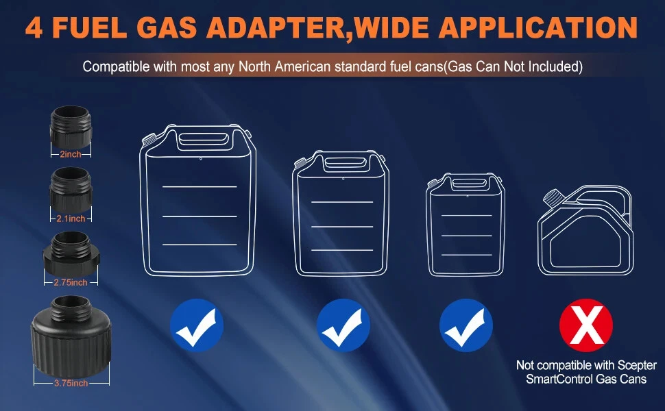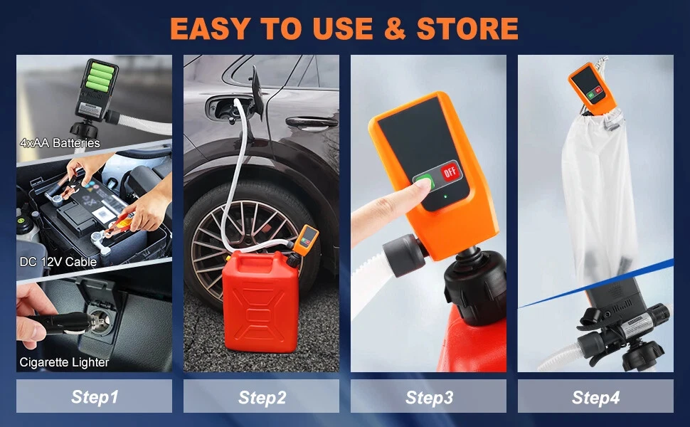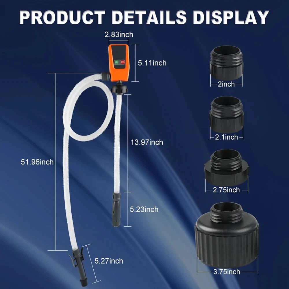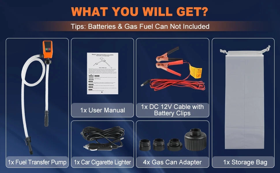 Specification: Power: 3 Different Power Supplies Delivery Volume: 3.2 Gallons per minute(12 LPM) Intake Hose: 18-22 inches Discharge Hose: 39-51 inches Operating Temperature: 41℉-113℉ Package Included: 1x Fuel Transfer Pump 4x Gas Can Adapter 1x User Manual 1x DC 12V Cable with Battery Clips 1x Car Cigarette Lighter 1x Storage Bag