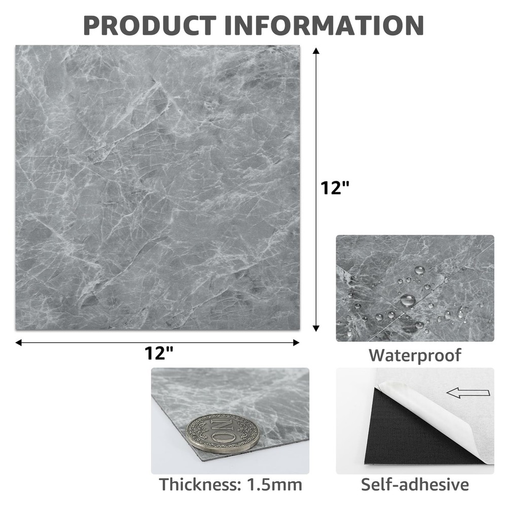 Size: 12 x 12 inches Pack: 30 tiles Covered area: 30 square feet Material: Premium vinyl tiles Waterproof, fireproof, wear-resistant, scratch-resistant, and abrasion-resistant, high strength and prevents expansion. Easy Installation: No grout or special tools are needed. Simply peel off the backing and stick the tiles to a clean, flat surface. Package Contents: Our square peel-and-stick floor tiles measure approximately 12 x 12 inches. Each package includes 30 tiles, covering a total of 30 square feet. The modern marble design adds an innovative and stylish touch to your home. Premium Material: Our peel-and-stick vinyl flooring tiles are crafted from high-quality vinyl, which is light yet sturdy, ensuring durability and longevity. Superior Performance: These tiles are 100% waterproof and fireproof. Their wear-resistant, scratch-resistant, and abrasion-resistant properties ensure long-lasting durability, while their high strength guarantees stability and prevents expansion. Easy Installation: No grout or special tools are needed. Our tiles feature an easy peel-and-stick design, allowing for a quick and effortless installation process. Simply peel off the backing and stick the tiles to a clean, flat surface. Wide Application: These self-adhesive vinyl flooring tiles are ideal replacements for laminate or linoleum floors and can be used in kitchens, laundry rooms, bedrooms, living rooms, and apartments.