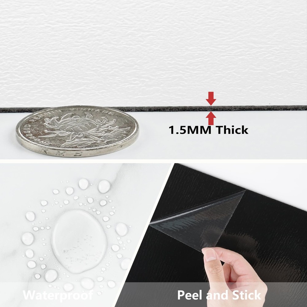 Introducing our versatile and stylish peel and stick floor tile, the perfect solution for quick and easy flooring updates! Our vinyl peel and stick flooring offers a hassle-free way to transform any space with minimal effort and maximum impact. Made with high quality materials, our vinyl flooring are durable, waterproof, and scratch-resistant, making them ideal for high-traffic areas like kitchens, bathrooms, and even garages. The white peel and stick tile design adds a touch of sophistication and modern elegance to your floors, enhancing the aesthetic appeal of any room. With the convenience of self-adhesive technology, our tile sticker can be easily installed without the need for messy glue or special tools. Simply peel off the backing and stick the tiles onto any clean, flat surface for a seamless and professional finish. These marble floor tile are perfect for renters looking for a temporary flooring solution that is easy to remove and won't damage the existing floors. The 12x12 inch size of our peel and stick vinyl flooring allows for easy customization and trimming to fit any space, making them suitable for various applications such as kitchen flooring, bathroom floors, flooring for bedroom, dance floors, and more. The kitchen tile floor can also be used to update garage waterproof flooring, creating a clean and modern look in your workspace. Not only are our floor covering practical and functional, but they are also easy to maintain and clean. The waterproof vinyl flooring is resistant to water, oil, and scratches, ensuring long-lasting durability and a beautiful finish for years to come. Say goodbye to sticky floor tiles that peel or bubble. Our self adhesive stick on flooring are designed to stay in place and withstand daily wear and tear. Convenient Size Options: Peel and stick floor tile are made of vinyl and the thickness is 1.5 mm. Available in convenient 12" x 12" tiles, we offer two versatile packs to suit your needs: A box containing 4 tiles (4 sq ft) for smaller projects or 20 tiles (20 sq ft) for larger transformations. Perfect for DIY enthusiasts seeking flexibility Premium white grey textured peel and stick flooring: Elevate your living space with our sophisticated white peel and stick tile that boast a marble texture. These vinyl flooring not only exude elegance in any room but are also remarkably durable. White brings timeless versatility and bright style Multi-Purpose: Floor tiles peel and stick waterproof is an affordable solution for a quick and stylish floor upgrade. Floor tiles is incredibly easy to install and cut to fit, allowing for seamless integration into any layout. Peel and stick tile floor can be used in kitchen flooring, bathroom, bedroom, living room, office, garage floor, kids room, camper, warehouse, hallway, gym, dance studio, laundry room, farmhouse, etc Simple Clean & Long-Lasting Durability: Say goodbye to cumbersome floor care. With bathroom floor tile water and oil resistance, heat and scratch resistance, our stick on floor tiles are a breeze to clean. Simply wipe them down with a damp cloth or mop for effortless maintenance Self Adhesive & Removable: Please clean the surface before use and make sure to apply the floor sticker on a flat, dry and clean floor. No grouting or special tools needed for install. To remove waterproof flooring, soften the glue with a hair dryer, you can easily lift it off by inserting a pry bar or chisel into the edge of the renter friendly floor peel and stick. Suitable for renters and apartments