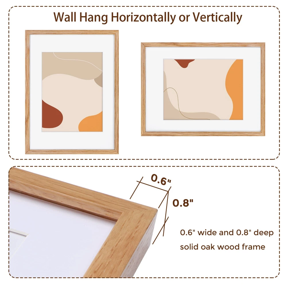 NATURAL SOLID OAK WOOD FRAME - This 12x16 picture frame is made of high-quality 100% solid oak wood, the natural wood grains on this real oak wood picture frame lends it an authentic look. This poster frame comes with 1.2mm ivory mat for visualization purposes, and 12x16 picture frame can be matted to 8.5x11. HIGH-DEFINITION TEMPERED GLASS - This oak wood picture frame comes with sturdy 2.0mm tempered glass front, which is clear and lightweight, giving your photo in a good view condition and protecting them from scratches ,fingerprints, dirt, water. What's more, our glass with edge polished that protect you from scratching by sharp glass edges. EASY TO CLIP AND HANG - These wall photo frames are not only stylish and affordable, they're durable as well as easy to clip and hang. Can be hung horizontally or vertically to fit in the space available. Hanging hardware is included so you can display your frame as soon as it arrives! WELL PACKAGED - Each 12"x16" picture frame is shrink-wrapped and secured with corner protectors, all of our 12x16 poster frames are packaged in custom-made corrugated boxes so your frames arrive in pristine condition. SLEEK & MINIMALIST HOME DECOR - The neutral oak finish of this wood picture frame set brings out all of the color in your poster, drawing attention to it like never before, you can display your artwork in the most sophisticated way possible with. The excellent craftsmanship and neutral color make it a classic addition to any room - or office!