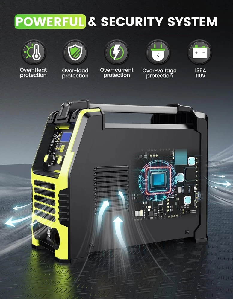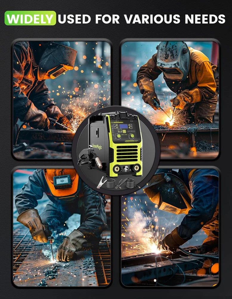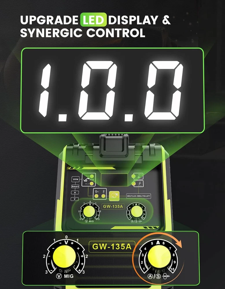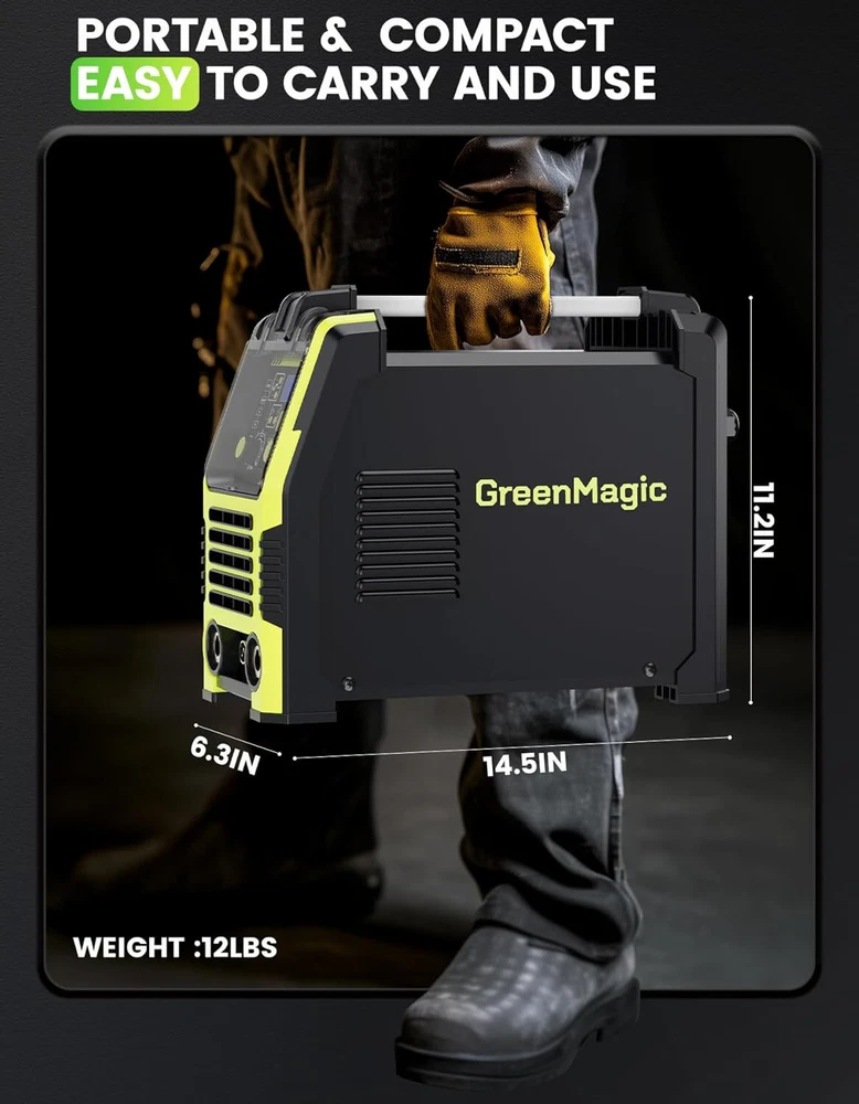 Powerful MIG Welding Machine: The versatile welder offers Three Modes, Flux Core Gasless MIG, Lift TIG, and MMA, suitable for various welding tasks. It provides a maximum output of 135 amps, supports gas-less flux-cored MIG wire, and handles wire sizes of 0.030", 0.035", and 0.040". With adjustable current and a 10-speed variable feed control, it ensures precise welding on carbon steel, stainless steel, and thicker materials. Synergic Control: The 3-in-1 MIG Welder employs advanced IGBT technology to automatically calibrate the recommended current and wire feed speed based on the selected welding wire diameter. This automatic adjustment simplifies the welding process, ideal for beginners and performing small repairs at home. Additionally, it can be fine-tune the voltage within a ±3 V range using the adjustment knob, ensuring that the MIG welder is versatile for both novices and experienced welders. Safe&Intelligent Design: Featuring overheat and overload protection, the 110V MIG welder automatically shuts down when it becomes too hot. A built-in fan continues to cool the unit for 1-2 minutes after shutdown, minimizes energy loss, ensuring efficient operation. Digital Screen Display: This 135A MIG Welding machine integrates advanced technology with an LED digital screen that displays voltage, current, and other parameters. This allows you to monitor and adjust settings in real-time without removing your helmet, enhancing efficiency and precision. Portable and Compact: The flux core welder combines high performance with a multi-application design in a compact 14 x 11 x 6 inch frame, weighing only 12 lbs, is highly portable, featuring a handle or shoulder strap for easy transportation. Wide Application: The Greenmagic wire welder is versatile, suitable for machinery manufacturing, sheet metal processing, automotive maintenance, iron processing, hardware work, and home DIY projects. It effectively welds mild steel, iron, stainless steel, and other metal materials.