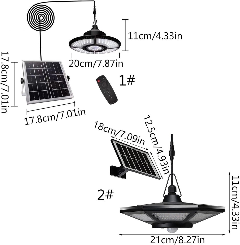 About this item Solar panel and lamp body of indoor solar lights for the house are designed separately, long cable with water-proof connector allow you to use it indoors and outdoors. It can be used indoors and outdoors such as shed, gazebo, balcony, garage, barn, home, garden, yard, patio, porch,chicken This solar gazebo light high-density ABS and IP65 waterproof materials, not easily worn by bad weather. Solar pendant light use 136 LEDs, brightness up to 1000LM when fully charged on fairly Specifications Solar panel: 6V/5W Lithium battery capacity: 3.7V2200mA PCS Operating 3.7V Working current: 1.2A Output power: 7W 1000lm 7.5m cable IP65 waterproof grade Charging time-: 8 hours Light 2H\4H\6H and time- (4 levels of dimming) About 10 hours, the lower the brightness, the longer the Remote control distance; The lamp head- right below 5-8 meters or so LED: SMD2835 0.2W- / 30 x 136 Pcs