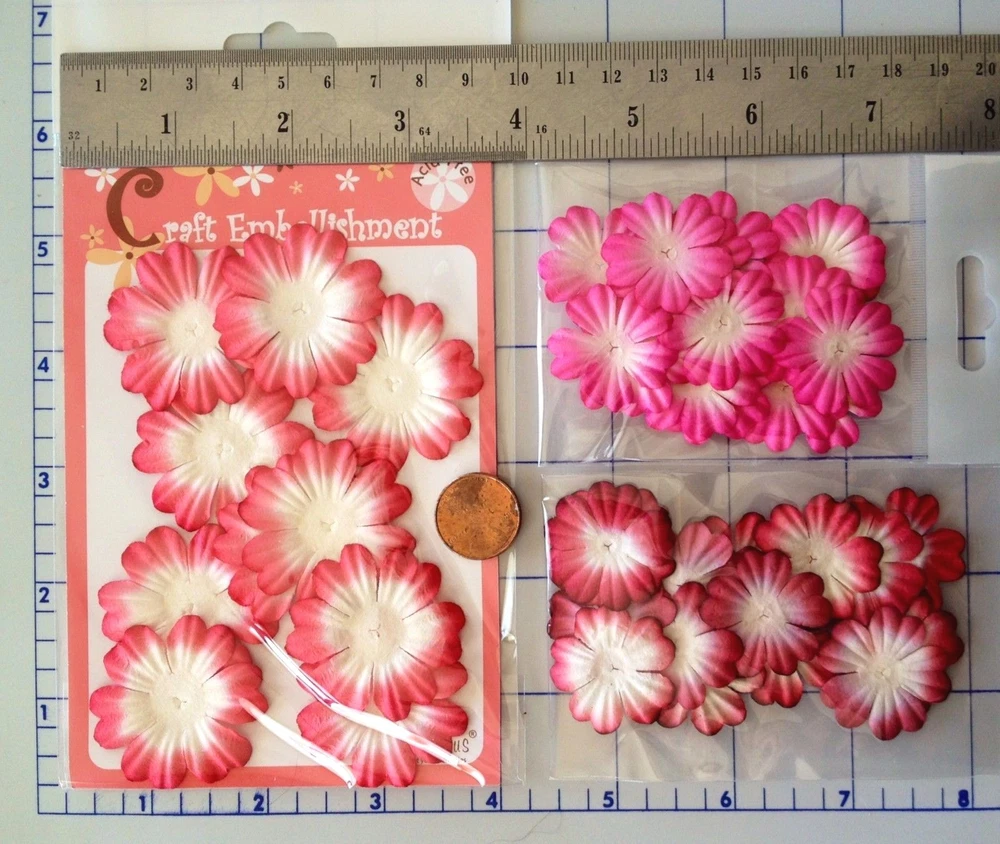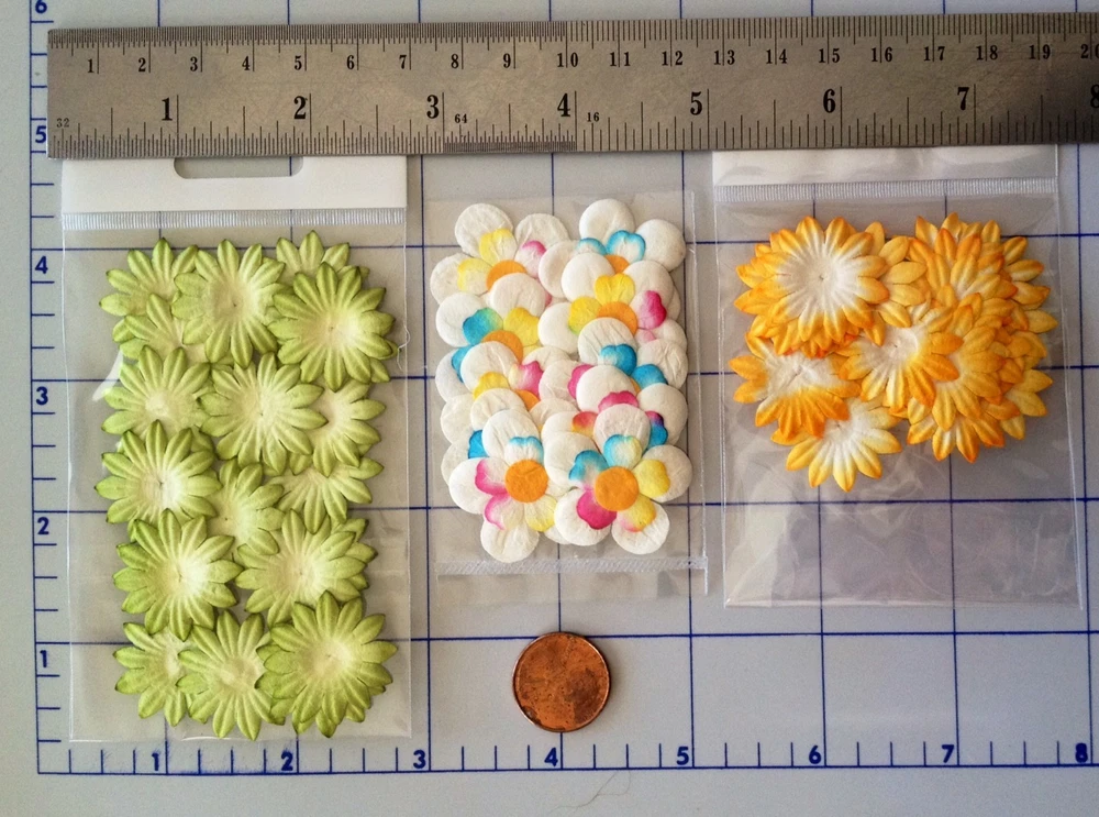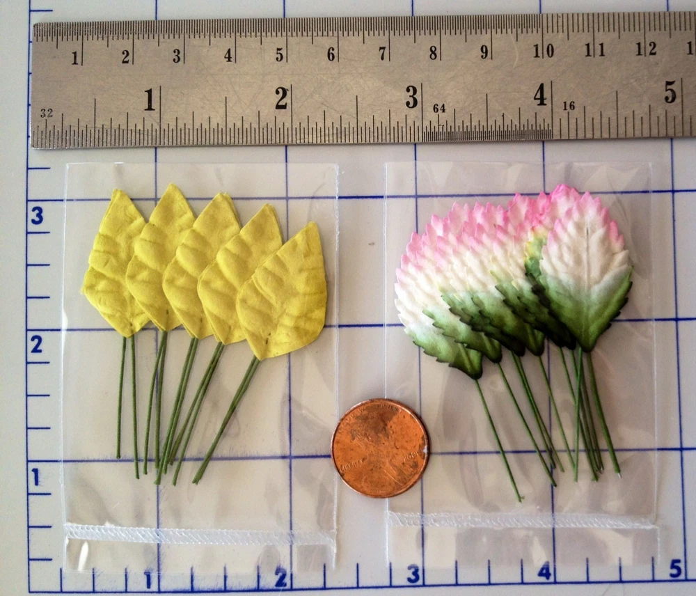 138-140 handmade mulberry paper colored flower petals and leaves. There are 10-20 flowers individually packaged by style. (**The packs may have a few over or under the numbers listed below.) The flowers range in size from approximately 3/4"-2" in size. Color may vary slightly on computer monitor and handheld devices to actual product. Mulberry paper is acid and lignin free and suitable for long lasting projects. Photo 2- Left quantity 10, diameter 1 1/2". Right quantity both 20 each, diameter 1 1/8". Photo 3- Left quantity 10, 2" wide. Right quantity 10, 1 7/8" wide. Photo 4- Left quantity 20, diameter about 1". Center quantity 10, 1 1/8" wide. Right quantity 20, 1" wide. Photo 5- Left quantity 10, 1 1/8" long leaf. Right quantity 10, about 1 1/4" long leaf.