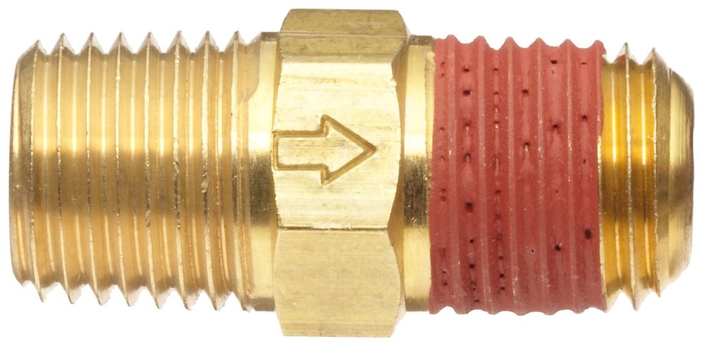 The ball-type check valve provides tight sealing, and can be used as a tank check valve for small compressors or as a component in pneumatic circuits. The valve body is made of brass for corrosion resistance, ductility at high temperatures, and low magnetic permeability. Brass can be connected to copper, brass, plastic, aluminum, and welded steel. Fluorocarbon O-rings provide higher temperature and chemical resistance. It has female National Pipe Taper (NPT) threads on one end and male NPT threads on the other for connecting a male and a female threaded pipe. The NPT threads create a tighter seal than straight threads. The maximum pressure rating is 250 pounds per square inch (psi), and the maximum temperature is 250 degrees Fahrenheit. Check valves have two ports and restrict the flow of fluids and other loose materials through a pipe or passageway to one direction. Flow enters through one port and exits through the other, closing when flow reverses or stops. Two common types of check valves are ball cone valves and swing check valves. A ball cone valve utilizes a spring-loaded ball seated against a cone-shaped interior surface to stop the flow of fluid in a forward direction, and a swing check valve has a movable disc on a hinge to block reverse flow. Check valves are rated by their cracking pressure (the minimum upstream pressure required for the valve to operate), and they are used in various water, gas, air, and steam lines. manufactures specialty valves, nozzles, and condensate traps. The company, founded in 1963 and headquartered in Fenton, MI, meets ASME standards. Can be used as a tank check valve for small compressors or as a component in pneumatic circuits Brass for corrosion resistance, ductility at high temperatures, and low magnetic permeability Fluorocarbon O-rings for higher temperature and chemical resistance Female and male NPT threads for connecting pipes with different ends Maximum pressure rating of 250 psi and maximum working temperature of 250 degrees Fahrenheit