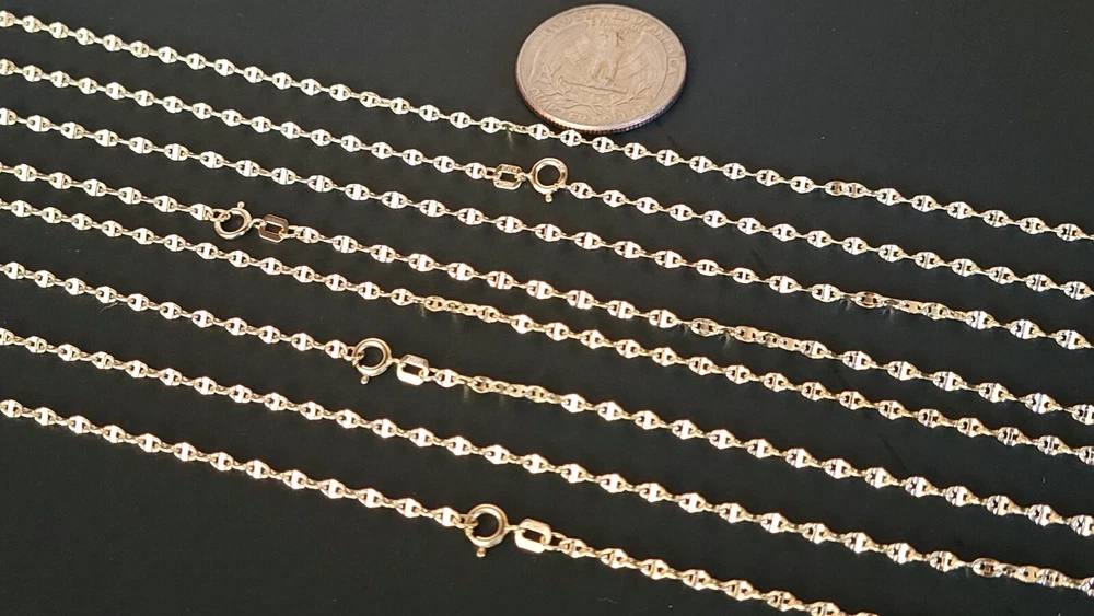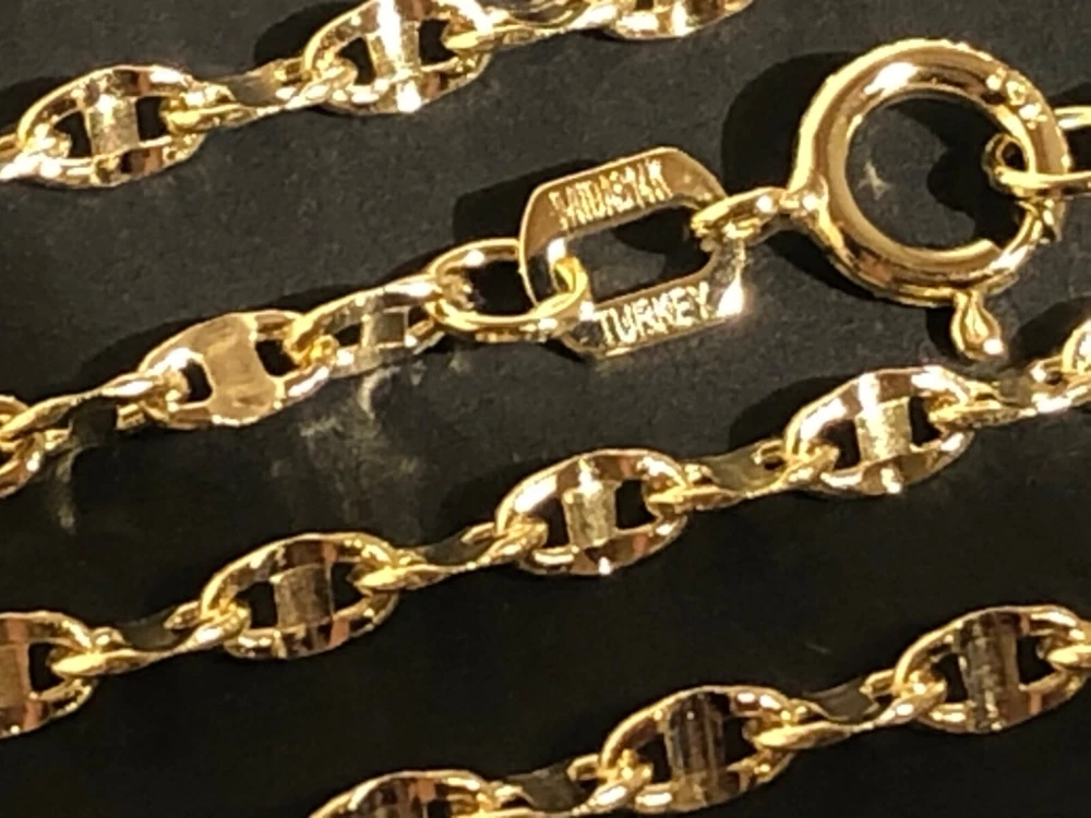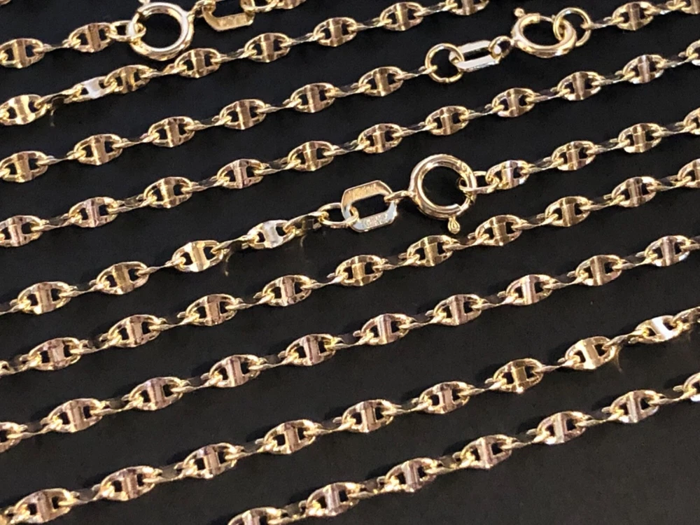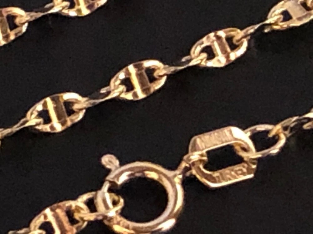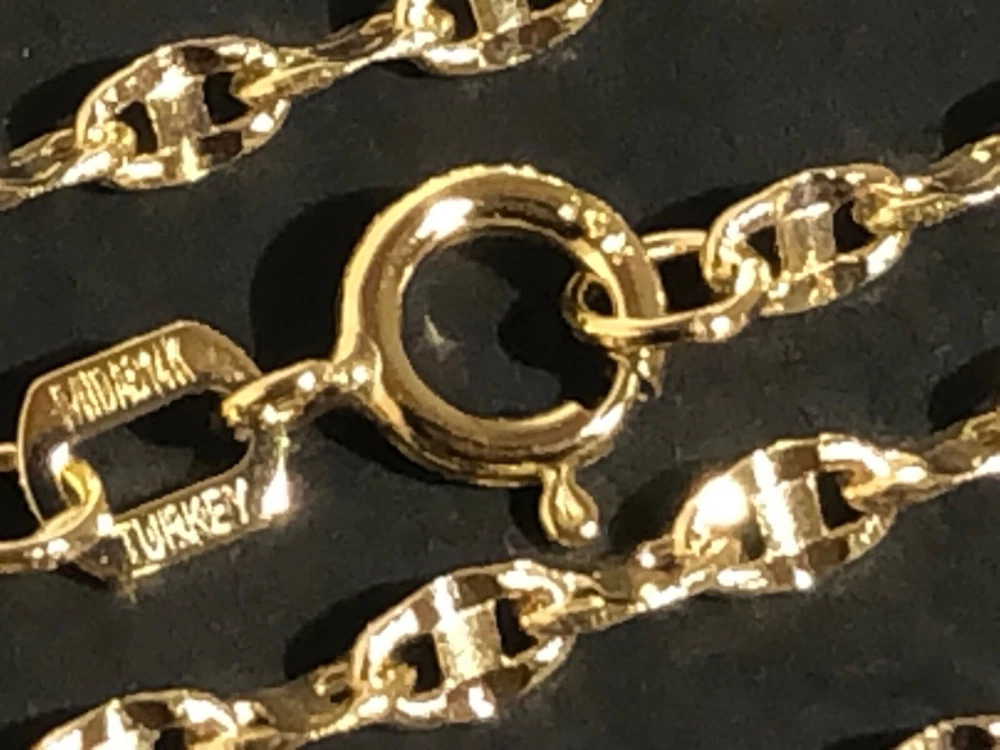 14k Solid Yellow Gold 2.05mm Stamped Mariner Chain Necklace 16", 18", 20", 22", 24". All our items manufactured by One of the Famous Manufacturer in USA, Turkey and Worldwide. Metal Type - Yellow Gold. Metal Purity - 14k. Stamped for Authenticity - 14 k., Midas Lock Type - Spring Ring Clasp; Length: 16”,18”,20”,22”,24” Some pictures are enlarged for more details. Average Weight: 16” -1.55 grams; 18" - 1.75 grams; 20" - 1.94 grams; 22” -2.07 grams; 24"-2.22 grams. Disclaimer: Please allow +/-0.05 gr weight may difference; Width: 2.05 mm. Some pictures are enlarged for more details. Free Gift box included. All domestic orders come with free shipping. We accept returns within 30 days. 100 % money back Guarantee. Immediate payment required. ABOUT US: We have an established business since 1990. We have been importing fine gold jewelry from Italian, Turkey, USA factories directly. And successfully selling our beautiful pieces in our retail Jewelry Store and distributors. We are newcomers on eBay. We are offering the public chance to buy our high quality necklaces at bargain price. We hope our necklaces will meet your expectations. Your feedback will be appreciated and helpful. Thanks.