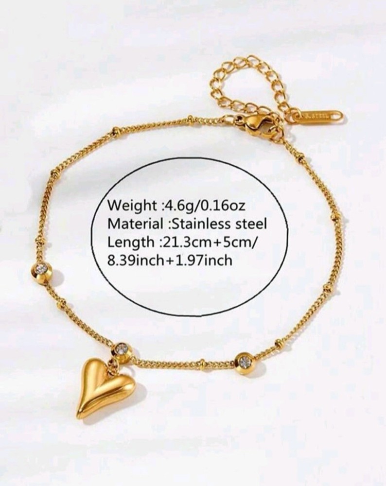Add a romantic shimmer to your step with this 14K Gold Plated Heart Anklet, designed to express love and elegance with every movement. Featuring a sleek gold chain adorned with tiny bezel-set cubic zirconia stones and a dangling polished heart charm, this anklet is a dainty yet eye-catching piece perfect for summer, date nights, or daily wear. Made with a durable stainless steel base and finished in rich 14K gold plating, this anklet is non-tarnish, waterproof, and hypoallergenic, ensuring long-lasting shine and comfort even in warm weather. The adjustable clasp allows for a custom fit, making it a lovely and thoughtful gift for women of all ages. Whether you're shopping for a birthday, anniversary, or just because, this heart anklet makes a meaningful and stylish addition to any jewelry collection.
