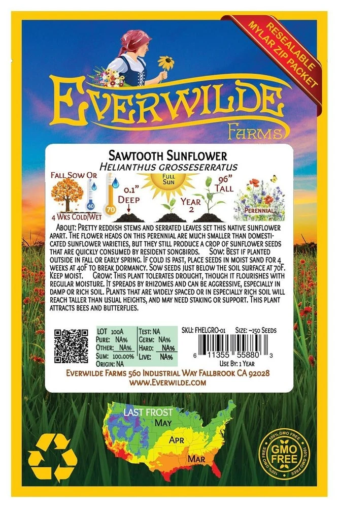 XL Mylar Packet - Sawtooth Sunflower Seeds Gold Vault Mylar Zip Packet Sunflowers were named for their habit of turning their faces to the sun. At the beginning of the development they exhibit heliotropism, or following the sun in its course from east to west, though the mature blossoms usually end up facing straight east. These are said to be the happiest of flowers, and in the language of flowers they symbolize loyalty and constancy. Direct sow in late fall, planting the seeds 1/2" deep. For spring planting, mix the seed with moist sand and store it in the refrigerator for 30 days before direct sowing. To start indoors, sow seeds in a flat or individual peat pots, keeping the soil lightly moist and at a temperature of 65-70 degrees F until germination, which usually occurs within 10-20 days. Keep the seedlings moist. When the weather has warmed and the seedlings are well established, transplant outdoors. These seeds are non-GMO (Genetically Modified Organisms), and are also free from all Neonicotinoids . They are packaged in our superb Gold Mylar Mylar Zip Packaging, which gives the seeds the best storage possible, and allows you to reseal the bag for later use. The artwork and labels on the packet are loaded with information - many people comment that it is the most beautiful packet that they have ever seen. If you have never tried out our seeds before, this is your chance to experience something special!