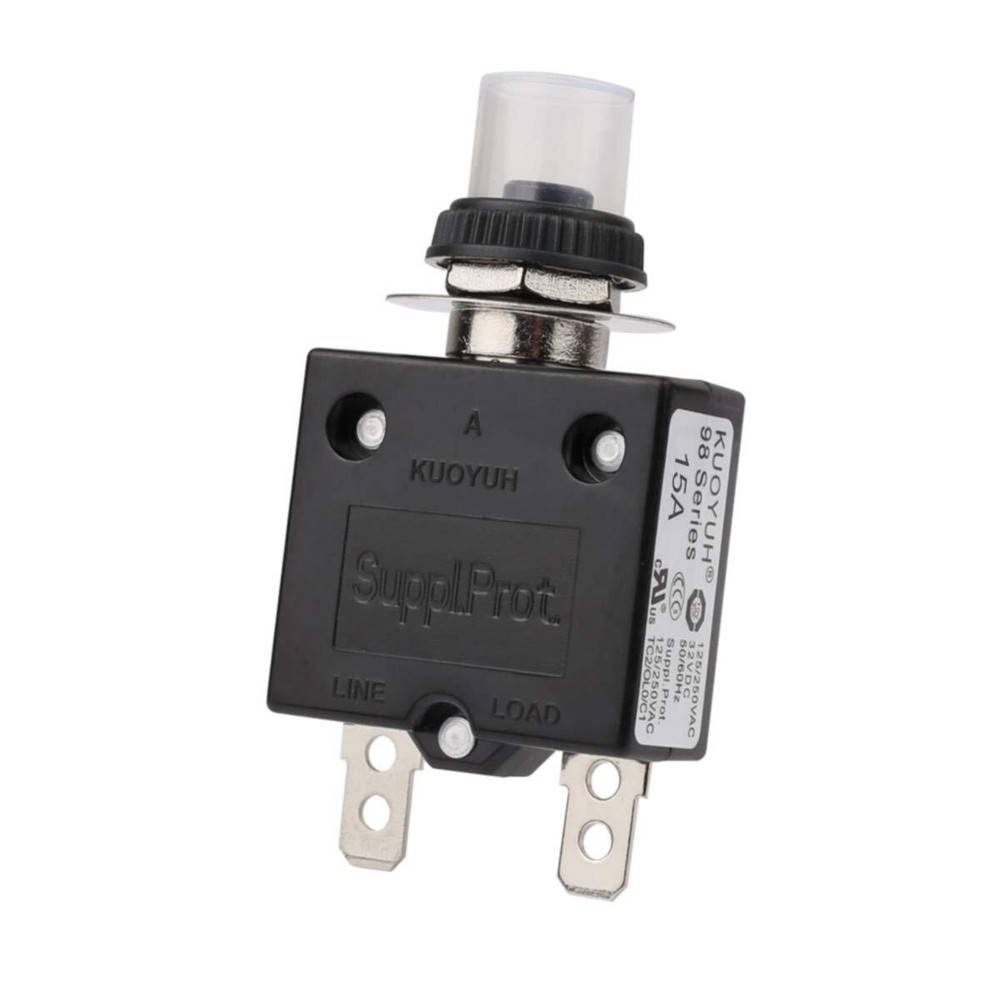 98-15A Overload Protector 15Amp Push Button Manual Reset Circuit Breaker 32V - Quick connect terminals - Terminal type: Male - Housing material: Black Plastic - Switch type: Push-button reset - Push-to-Reset Operation,with a waterproof button clear cap to protect from bad weather For operation up to 32 volts DC or 250 volts AC. Power rating: 15A (amp) Includes waterproof button cover for protection from the elements Not designed for push on / push off manual switch operation, but the button pops out at overload and is reset by pushing back in Great for For Automotive / Industrial / Marine And Many Other applications Product description Push Button Reset Circuit Breakers with Quick Connect Terminals and Waterproof Button Transparent Cap Description: This replacement circuit reset breaker can be used in a variety of applications requiring protection. With a plastic housing, and the included waterproof button cover, you can use this breaker in areas where it may be exposed to moisture without worry. We manufacturer this breaker with Quick Connect terminals so you can get the job done quicker. For operation up to 32 volts DC or 250 volts AC. Not designed for push on / push off manual switch operation, but the button pops out at overload and is reset by pushing back in. Specifications: - Power rating: 15A (amp) Package Includes: 2 x 15Amp Thermal Circuit Breaker Shipping We offer FREE shipping on all orders! We ship within Three business days of payment, usually sooner. We use a selection of shipping services such as UPS, FedEx, USPS etc. We only ship to the lower 48 states, no APO/FPO addresses or PO Boxes allowed. Local pickups and combined shipping options are not provided at this time. Return You can return a product for up to 30 days from the date you purchased it. Any product you return must be in the same condition you received it and in the original packaging. Please keep the receipt. Payment We accept payment by any of the following methods: PayPal Please pay as soon as possible after winning an auction, as that will allow us to post your item to you sooner! Feedback Customer satisfaction is very important to us. If you have any problem with your order, please contact us and we will do our best to make you satisfied. Contact Us If you have any queries, please contact us via ebay. We usually respond within 24 hours on weekdays. Please visit our eBay store to check out other items for sale! Thank you for shopping at our store.