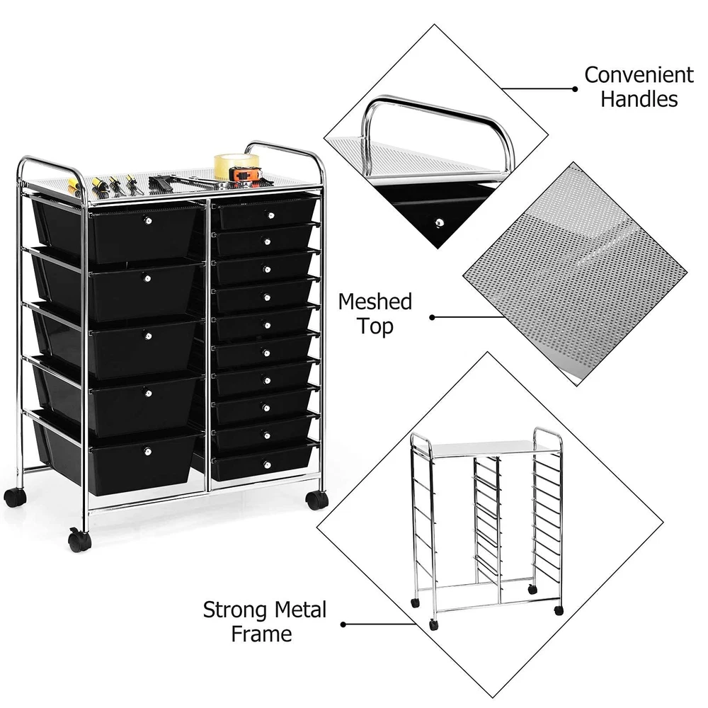 Description: Is there too many small things in your house and no place to put them? Is it difficult for you to move the items in the cabinet to another place? Have a look at this 15 drawerrolling storage cart organizer. With this multipurposemobiletrolley, your problem would definitely be easily solved. 5 big drawers and 10 small drawers satisfy your different storage needs. And the four universal wheels make the moving process more convenient and easy. Besides, the interlock systemhelp you stop the mobiletrolley at any time. And it equips a electroplated steelframe, which make the rolling storage cart durable and sturdy for long term use. Moreover, the stylish appearance could easily match your home decoration and make your space charming. Take it home and enjoy a convenience lifestyle. Features: Colorful design make your space stylish Tall handles make it easy to push and pull The interlock systembrings more convenience Detailed instruction make assembly procesee easy The electroplated steelframe ensure the durability Big and small drawers meet your different storage needs Four universal wheels allow you to easily change the direction of movement Specification: Color: As the picture shows Material: Steel, PP Dimension: 25”x 14.5”x 34.5”(L x W x H) Net Weight: 17 lbs Package Included: 1 x 15 DrawerRolling Storage Cart Sturdy and Firm Structure: The frame of this storage drawer cart is constructed of high-quality steel for bearing more weight not wobbly and processed with smooth chrome finish for long-lasting use. And 15 craft drawers are made of superior odorless PP material for wear-resistant and lightweight. Large Storage Space: Measuring 25inch x 14.5inch x 34.5inch(L x W x D) in dimension, the organizer cart provides plenty of space to different belongings, such as kitchen supplies, cosmetics and more. And the organizer top offers extra storage space. Flexibility and Useful Design: The art drawers slide unattached through metal channels easily and smoothly. Besides, the knob of drawers also offer much convenience for taking your stuff when you need it. The four universal wheels (locking) can swivel 360 degree and this feature will help you convenient move it. Easy for Installation and Maintenance: This rolling cart is convenient to assemble with the clear and easy to understand instruction. And the smooth surface is easy to clean with a damp cloth. Beautiful Decoration: In addition to its practical storage use, these colorful boxes also work as a beautiful decoration item in your living space, bathroom, school, garage, office. Different colors offer you much convenience to classify your stuff.