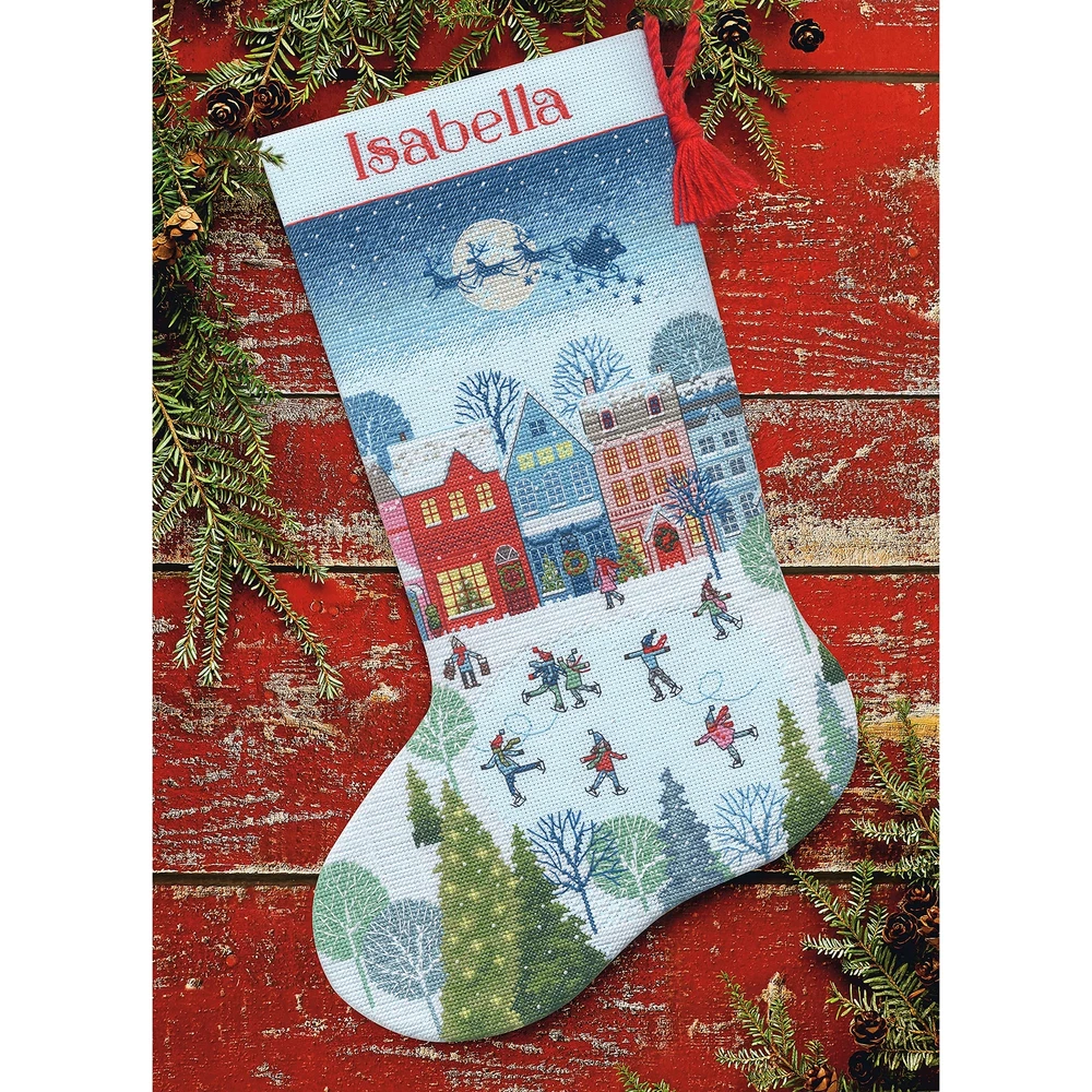 As Santa and his reindeer traverse the sky, a group of skaters enjoys some winter fun in the village in this fun cross stitch stocking! This Christmas counted cross stitch pattern features a beautiful array of thread colors that will add a personalized, festive touch to your Christmas decorations. Our needlepoint stocking kit also allows for personalization using the alphabet included in the instructions. Stocking finishing information also included. Completed cross stitch stocking pattern measures 16" long. Kit comes with presorted thread, 14 count light blue Aida cloth, felt for stocking back, 100% wool yarn for stocking hanger, needle, and instructions with an alphabet for personalizing. Design copyright of Jo Cave, courtesy of Advocate Art. This counted cross stitch kit comes with presorted thread, 14 count light blue Aida cloth, felt for stocking back, 100% wool yarn for stocking hanger, needle, and instructions with an alphabet for personalizing Completed Christmas cross stitch stocking measures 16" long This fun and festive counted cross stitch stocking pattern features a wintry village scene, complete with ice skaters and Santa's sleigh flying overhead! All of our stocking counted cross stitch sets include instructions with an easy-to-chart and key, detailed stitch diagrams, and steps for how to finish as a stocking - plus, the package includes a large color image of the finished design for reference Perfect as a fun and engaging Christmas craft activity for adults!