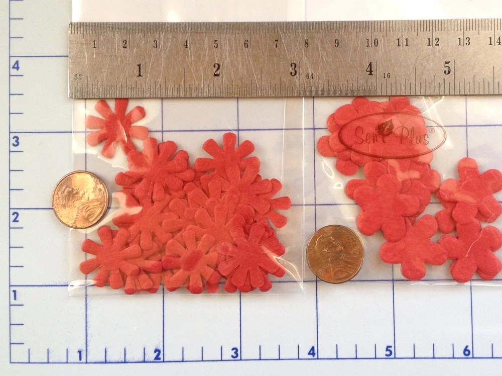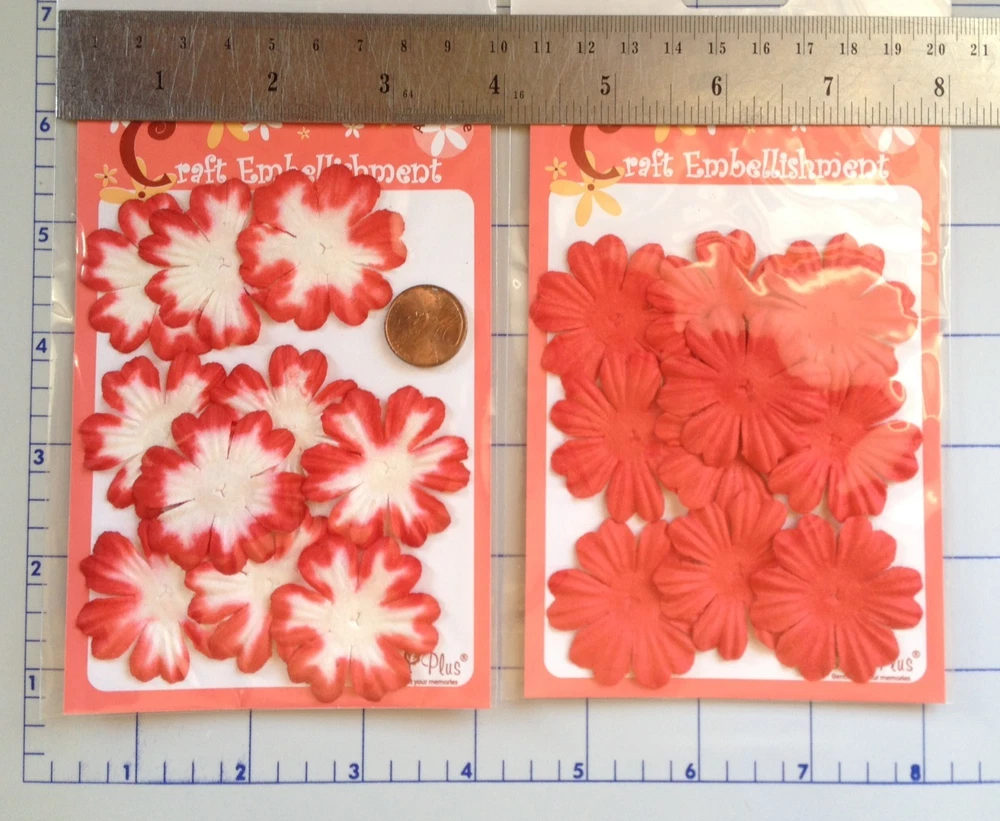 166-170 handmade mulberry paper, assorted shades of red colored flower petals.There are 10-20 flowers individually packaged by style. (**The packs may have a few over or under the numbers listed below.) The flowers range in size from approximately 3/4"-2" in size. Color may vary slightly on computer monitor and handheld devices to actual product. Mulberry paper is acid and lignin free and suitable for long lasting projects. Photo 3- Both quantity 10, diameter about 1 1/2". Photo 4- Both left quantity 20, 1" wide. Both right quantity 20, diameter 1 1/8". Photo 5- Left quantity 10, diameter 1 7/8". Right quantity 10, diameter 11/16" Photo 6- Left quantity 28-30, diameter 7/8" wide. Right quantity 18-20, diameter 7/8".