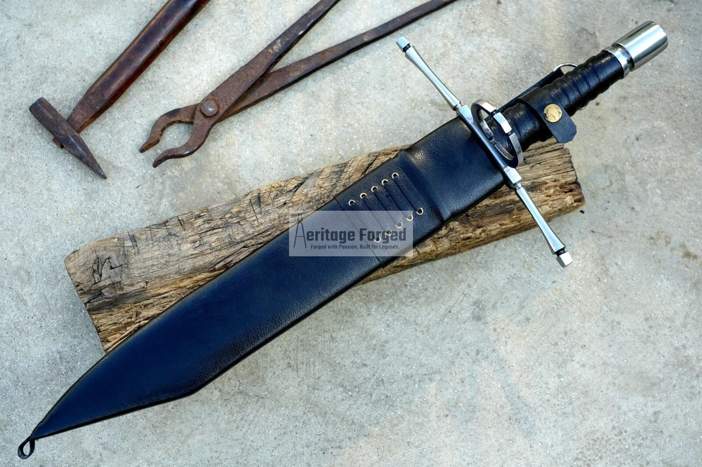 My blades are meticulously hand-forged from high-quality 5160 leaf spring steel, a material renowned for its durability and resilience. Using traditional forging techniques, each blade undergoes a rigorous crafting process that ensures both strength and precision. After shaping, the blades are tempered with water to achieve optimal hardness and flexibility. The final product is sharpened to a keen edge, making it ready use. This combination of traditional methods and modern steel technology results in blades that are both reliable and enduring, designed to perform exceptionally in a variety of tasks. Product Specifications: Blade Length: 16 inches Handle Length:7 inches Total Length: 23 inches Blade Weight:766 Grams Handle Material: Rosewood (leather Wrapped )