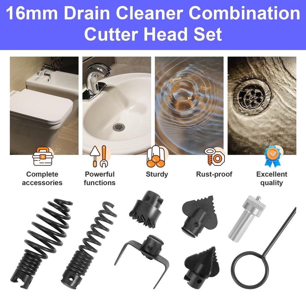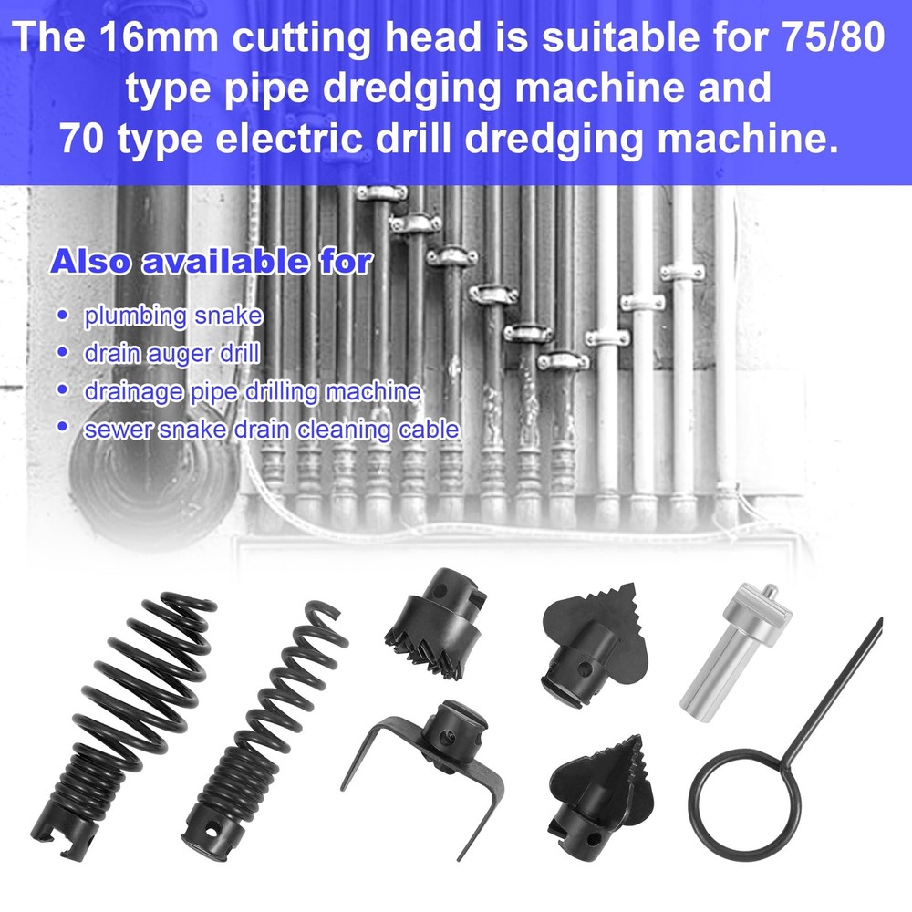 The set has a complete range of categories and focuses on solving various clogging problems. 【Function】Suitable for sewer snake drain cleaning cable with a diameter of 16mm(0.62in), cleaning various blockages such as tree roots, branches, hair, etc., breaking various greases and hard objects, and effectively expanding and clearing pipes. 【Applicability】Suitable for various brands of pipe dredging machines, plumbing snake and drainage pipe drilling machine .Can be used on various interior plumbing or septic systems, it is a good tool for regular cleaning of septic tank systems or internal pipes. 【High quality】The cutting head set is made of a heavy metal material for durability .The surface has been treated with anti-rust and the welding is firm,not easy to deform and wear-resistant, and the unique shape helps to grab or cut off things that are in the way. 【Easy and Quick Installation and Removal】 Press the spring and push it into the groove to install and fix it. The cutter head can be easily removed by inserting the key into the small hole and pushing out the groove. 【Service】Package includes 6 types *cutting head ,1*electric drill converter ,1*key. In order to protect the cutter head, a little oil is applied on the surface, please don't mind.One-year warranty, please feel free to contact us if you have any questions.