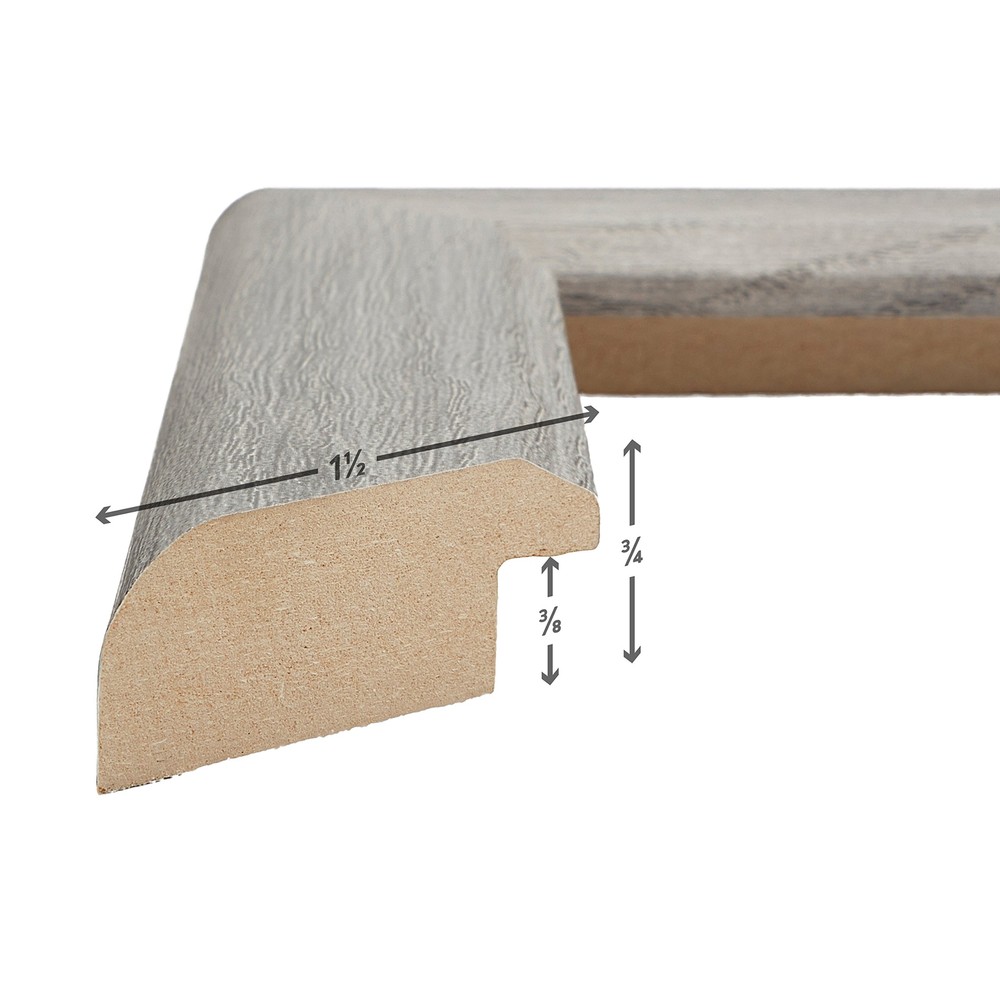Contemporary style; grey barnwood appearance; smooth laminate wrap finish (NOT ACTUAL BARNWOOD) Frame includes: clear acrylic facing, rigid cardboard backing and wire hanging hardware kit (some assembly required) Frame holds a 16 by 22-Inch photo/print/poster (viewable area reduced by .25" on each side due to frame lip) Frame moulding is 1.25 inches wide; solid MDF construction Frame is designed for WALL HANGING only (hanging hardware allows for portrait or landscape orientation)