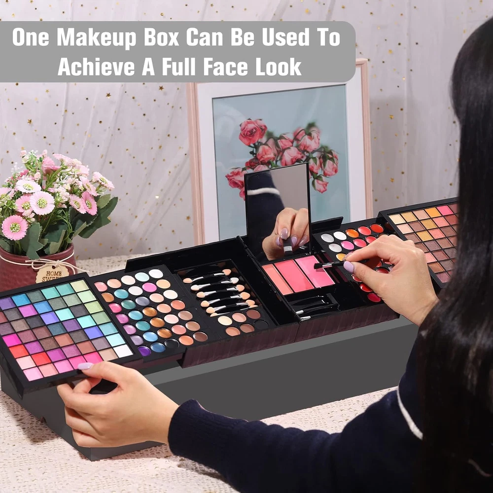 【Makeup Kit for Women Full Kit】This all-in-one makeup case contains 98 Matte Shimmer Eyeshadow Powder + 21 Eye shadow Gel + 35 Lip Glosses +14 Concealers + 6 Eyebrow Powder + 3 Blush Powder + 10 Mini Applicators + 1 Built-in Mirror. One makeup box can be used to achieve a full face look in a variety of styles. 【Vibrant Colors & Highly Pigmented】This set contains cool and warm-toned pigments and shades, has all outstanding matte, metallic, satin, shimmers and gel. Variety of highly pigmented colors you can get iconic effects and smoky natural look as well. 【Blendable & Long-lasting】 Ultra-soft & smooth powder texture is easy to apply and blend, you can create endless amounts of looks. No need to worry about water and sweat, your makeup will be kept in place all day long. 【Cruelty Free & Skin-friendly】The formula and ingredients are safe for all skin types. It matches most skin tone to make the makeup look brighter. This portable size travel kit is satisfied all your need, suitable for any occasion: work, casual, date, party, cosplay, wedding makeup etc. 【Great Gift For Your Lover】This full make up kit has everything you need to transform your face makeup, suiting both for professional makeup artists and beginners. It is a surprise and perfect gift for yourself, your family, lovers and friends on Christmas day, Birthday, Valentine's Day, Halloween, Thanksgiving, Mother’s Day and Women’s Day. Product description 177 Colors Professional Makeup Kit for Women Full Kit Gift Set Product Information Measures at 27.17x5.9x1.28 inches when open Net Weight: 772g Shelf Life:3 years All In One Make Up Kits For Women This make up set contains cool and warm-toned pigments and shades, has all outstanding matte, metallic, satin, shimmers and gel. Variety of highly pigmented colors you can get iconic effects and smoky natural look as well. What's in the Makeup case: 98 Eyeshadow Powder 21 Eyeshadow Gel 35 Lip Glosses & Lip Balm 14 Concealers 6 Eyebrow Powder 3 Blush Powder 10 Mini Applicators 1 Built-in Mirror 98 Eyeshadow Powder & 21 Eyeshadow Gel Vibrant highly pigmented colors are perfect for daily basic look , some of the glitters are great for party look. Bold and bright colors colors are perfect for many occasions. 35 Colors Lip Glosses & Lip Balm 35 matte and shimmer lip glosses are super-pigmented and long-lasting. Creamy and blendable shades for light, medium and dark skin tones 14 Colors Concealers Creamy & buildable formula easily neutralize skin tone issues and conceal imperfections, take the guesswork out of color correcting. 3 Colors Blush Powder The blush palette comes with 3 colors blush powder to create a perfect healthy glow. Fine powder can maintain makeup lasting nature, have good complexion. 6 Colors Eyebrow Powder It is made with a lightweight formula that blends seamlessly and is soft and kind on the skin. Fine powder eyebrow not only creates natural-looking brows, but can also be used to refine the eyes, nose, cheekbones and hairline. 10PCS Mini Applicators These mini applicators are great for eyeshadow apply, eyebrow drawing, face glitter apply, lip brush and blusher. HOW TO OPEN GREAT IDEAL GIFT This full make up kit has everything you need to transform your face makeup, suiting both for professional makeup artists and beginners. It is a surprise and perfect gift for yourself, your family, lovers and friends on Christmas day, Birthday, Valentine's Day, Halloween, Thanksgiving, Mother’s Day and Women’s Day.