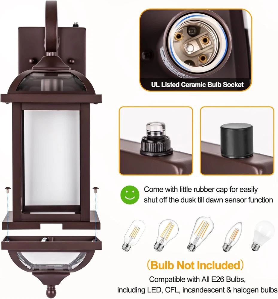 ๐๐ฆ๐๐ซ๐ญ ๐๐ฎ๐ฌ๐ค ๐ญ๐จ ๐๐๐ฐ๐ง ๐๐ซ๐จ๐ง๐ณ๐ ๐๐ฎ๐ญ๐๐จ๐จ๐ซ ๐๐๐จ๐ง๐๐๐ฌ ๐๐จ๐ซ ๐๐๐ฌ๐ฒ ๐๐ข๐๐: Built in sensitive photocell sensor, 2 pack dusk till dawn brown outdoor lightings could automatically turn on at night and off at the daytime, bringing you cool convenience. Not only about nice lighting appearance to ornament your house, but also an easier and more enjoyable lifestyle from now on. โ Comes with little rubber cap to shut down dawn to dawn sensor function when needed. ๐๐" ๐๐๐ซ๐ ๐ ๐๐ง๐ญ๐ข-๐๐ฎ๐ฌ๐ญ ๐๐ฅ๐ฎ๐ฆ๐ข๐ง๐ฎ๐ฆ ๐๐ฑ๐ญ๐๐ซ๐ข๐จ๐ซ ๐๐ข๐ ๐ก๐ญ๐ข๐ง๐ ๐ ๐ข๐ฑ๐ญ๐ฎ๐ซ๐๐ฌ ๐๐จ๐ซ ๐๐จ๐ง๐ ๐๐ซ ๐๐ฌ๐: Crafted with highly quality aluminum and iron, Roravilila oil rubbed bronze fully enclosed vintage outdoor sconces dusk to dawn sensor feature excellent corrosion resistance and longer life span. Even after years, its gorgeous beauty and durability are still lasting. That touch of elegance and notability from these dawn till dawn sensor outside sconces could always quietly stay and ornament your house or hotel. ๐ ๐ฎ๐ฅ๐ฅ๐ฒ ๐๐ง๐๐ฅ๐จ๐ฌ๐๐ ๐๐จ๐ญ๐ญ๐จ๐ฆ ๐๐๐ฌ๐ข๐ ๐ง ๐๐จ๐ซ ๐๐ซ๐๐๐ญ ๐๐๐ญ๐๐ซ๐ฉ๐ซ๐จ๐จ๐ ๐๐ง๐ ๐๐ง๐ญ๐ข-๐๐ฎ๐ฌ๐ญ: Large outdoor lanterns with dusk to dawn sensor are totally distinctive from others. With cambered glass design at its top and bottom, these fancy large bronze dawn to dawn outside lanterns for house could easily make a great impression. IP65 waterproof enclosed wall mounted lamps relieve your frequent cleaning duties and no fear about terrible weather conditions such as heave rain, storm, high wind or hot sun. ๐๐-๐๐ข๐๐ ๐๐ซ๐๐ง๐ฌ๐ฉ๐๐ซ๐๐ง๐ญ ๐๐๐ฆ๐ฉ๐๐ซ๐๐ ๐๐ฅ๐๐ฌ๐ฌ ๐๐ฎ๐ญ๐๐จ๐จ๐ซ ๐๐๐ฅ๐ฅ ๐๐๐ง๐ญ๐๐ซ๐ง๐ฌ: 18โ(H)*6โ(L)*6โ(W) Clear tempered glass helps large brown exterior wall mount lights dawn to dawn emit ample illumination and beautiful light effect, which is more alluring. 12-Side glass design lets people see its beauty from different angles. UL Listed E26 ceramic bulb socket is compatible with any E26 LED, incandescent, Edison, halogen or CFL bulb. (Bulb Not Included) ๐๐๐ฌ๐ฒ ๐๐ง๐ฌ๐ญ๐๐ฅ๐ฅ๐๐ญ๐ข๐จ๐ง ๐๐ง๐ ๐ ๐ซ๐ข๐๐ง๐๐ฅ๐ฒ ๐๐๐ญ๐๐ซ-๐๐๐ฅ๐ ๐๐๐ซ๐ฏ๐ข๐๐: Well-protected & packed parcel comes with user-friendly manual and accessory kit. Directly msg Roravilila team if you have any further question or issue with our dusk to dawn exterior lightings large size for house, we would reply within 24h and offer satisfying solution at our best. Product Description Anti-Aust Aluminum & IP65 Waterproof -- 18 Inch Large Size High quality and dedicated craftmanship together make sure their longer use. No fear about those tough weather conditions any more. Ideal to set them as: Bronze Front Porch Lights Garage Wall Light Fixtures Entryway Outdoor Sconces Backyard Exterior Lightings Fully Enclosed Bottom Design Tired of dust cleaning or hate insect flying inside and blot out lights? Relax, our fully enclosed bottom relieves such worries. Keep inside cleaning and enjoy your wonderful leisure time. Even on the daytime, they are still good decoration for your home. Dusk to Dawn Outdoor Lighting Always forget to turn off the switch of outside lights? Maybe dusk to dawn bronze outdoor sconces 2 pack is your better choice. Set your hands free and let them level up your daily life. Atuomatically turn on at dusk and off at dawn, create an easy life for yourself. Sturdy & Long-term Use Qualified anti-corrosion aluminum together with sophisticated workmanship highlight these 2 set dusk to dawn outdoor wall lanterns. Universal E26 Bulb Base Choose ceramic bulb socket to make sure better heat resistance. With 100 Max Wattage, you have a wider choice of illumination. (Bulb not included) Alluring Curve Handle Stable mounted plate and charming curve handle bring your house vibes of elegance and high class. Good choice for leaving guests deep impression. Cambered Glass Head Outdoor brown sconces fixture dusk till dawn feature such elegance cambered tempered glass at the top and bottom to make light effect more charmful. 1 Vintage Front Porch Light 2 Entryway Wall Lights 3 Patio Lights for House Outdoor Wall Lights Similar Types for Choice 2-Pack Quantity 2-Pack 18 Inch Height 15 Inch Dusk to Dawn Sensor Function Dusk to Dawn Sensor IP 65 Waterproof Anti-rust Aluminum 12-Side Clear Tempered Glass 8-Side Fully Enclosed Bottom Open 2-Pack Quantity 1-Pack 18 Inch Height 59 Inch Max Dusk to Dawn Sensor Function No Sensor IP 65 Waterproof Anti-rust Aluminum 12-Side Clear Tempered Glass 12-Side Fully Enclosed Bottom Fully Enclosed 2-Pack Quantity 2-Pack 18 Inch Height 15 Inch Dusk to Dawn Sensor Function Dusk to Dawn Sensor IP 65 Waterproof Anti-rust Aluminum 12-Side Clear Tempered Glass 8-Side Fully Enclosed Bottom Open 2-Pack Quantity 2-Pack 18 Inch Height 15 Inch Dusk to Dawn Sensor Function Dusk to Dawn Sensor IP 65 Waterproof Anti-rust Aluminum 12-Side Clear Tempered Glass 8-Side Fully Enclosed Bottom Open Outdoor Wall Lights Black Pendant Light Outdoor Wall Lights Outdoor Wall Lights