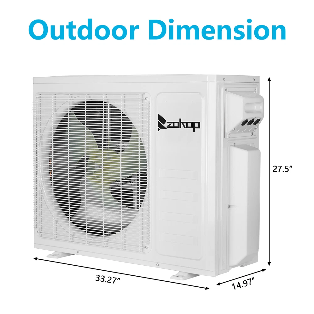 listing template Visit our store Sigh up for email 18000 BTU Ductless Split Air Conditioner W/ Heating 2 Zone 9000 + 9000 BTU WIFI ZOKOP Dual 2 Zone Ductless Mini Split Air Conditioner Heat Pump System, 19 SEER2 Ductless AC with 2 Indoor Air Handlers, 1 Outdoor Condenser, 25ft Installation Kit (9K+9K) Introductions: ZOKOP smart Split Type Type Inverter Air Conditioners with heating function are made with high quality compressor, high speed pure copper motor & inner spiral copper tube which are powerful to quickly cool down / warm your home, office, garage or apartment for maximum comfort in quiet operation, perfect appliance in hot Summer or cold Winter. Comparing with others, machine featured with high SEER grade, which means that it is more energy efficient and much money saving! This unit also has Sleep, Turbo, ECO, Mute and Timer functions. These functions help you enjoy the true individual comfort. Let the ZOKOP Mini Split Air Conditioner 2-Zone be the solution to your home's heating and cooling needs. Features: [MULTIPLE ROOMS] Comes with 2 indoor air handlers 9,000 BTU + 9,000 BTU with separate controller for individual rooms and 1 outdoor condenser. Enjoy individual temperature controls in each room for ideal climate control. This unit provides cooling and heating for up to 800 Sq.Ft (each indoor unit recommended area 400 Sq. Ft) and able to work in environments as low as 5 degrees Fahrenheit. 2 pcs 24.6ft copper pipes (Standard size 1/4" & 3/8" outer dimension) and 2 installation kits included. The length for drain pipe is 78.7". Featured with Cooling, Heating, Dehumidifying and Fan only modes in one compact unit. It is ideal for using in home's bedroom, living roo, kitchen, office, apartment, garage and so on. [Energy Saving] ZOKOP the speed of the air conditioner equipped with frequency converter directly affects the service efficiency of the air conditioner. The frequency converter is a control system used to control & adjust the speed of the compressor to make it always in the best speed state, so as to improve the energy efficiency ratio (at least 30% more energy-saving than the conventional air conditioner). This 19 SEER2, 2*9000BTU, 208/230V~60Hz, AHRI Certified AC unit with a heat pump(up to 5℉/-15℃) is featured high quality compressor for more efficient cooling and longer working life; Higher SEER grade & Eco-friendly design which leads you for money saving ( please confirm voltage before making purchase) . [Quiet Cooler & Heater] Ultra Silent at only 27-42 dB(A) and beautifully built adds a touch of elegant charm to your room.In sleeping & mute mode, It's able to maintain the temperature while you are sleeping. And you can use the 24-hour timer in combination to free you from additional worries. Featured with 4-way swing function, unit provides scientific airflow in your room to suit your comforts in just a few minutes.Best choice to decorate your home. [Smart Operation] Operating this conditioner is an easy-understanding and enjoyable cooling experience (61-88degree Fahrenheit ). We can set all functions on remote control (Fan Speed Selection, Sleep Mode, 24 Hour Timer, ECO Mode, Turbo Mode, and Mute Mode). Built-in microprocessor chip & sensor in the remote controller makes it more convenient to operate the air conditioner from a distance. Digital LED display controls offer precise temperature adjustments and the remote control lets you control the air conditioner from across the room. [Washable Air Filter] This indoor AC machine comes with a permanently washable and easy cleaning air filter. Keep your air conditioner running more efficiently by cleaning the filter once a month. Specifications : 2*I ndoo r Unit : 1. Color: White 2. Power Supply: 208/230V, 60Hz 3. Cooling : Rated Capacity: 9000Btu/h Rated SEER2: 19Btu/W.h Rated EER2: 10Btu/W.h 4. Heating: Rated Capacity: 10000Btu/h HSPF2 Rating (Region IV): 8.5Btu/W.h 5. Operation temperature: (16~31)degree Celsius/(61~88)degree Fahrenheit 6. Use the air conditioner in the following temperature conditions. Indoor(cooling/heating): 17 ~32degree Celsius(63 ~90degree Fahrenheit)/0 ~27degree Celsius(32 ~80degree Fahrenheit) Outdoor(cooling/heating): 15 ~55degree Celsius(59 ~131degree Fahrenheit)/-15 ~24degree Celsius(5 ~75 degree Fahrenheit) 7. Moisture removal: 1.1L/h 8. Indoor air circulation/Hi : 600m³/h 9. Indoor noise level at cooling(Turbo/High/Med./Low/Mute): 42/39/34/29/27dB(A) 10. Application Area: Up to 400 sq.ft 11. Certificate : AHRI, ETL 12. Indoor Dimensions: 81.1x29.2x20.5cm(31.9x11.5x8.1inch) 13. Indoor Package dimensions: 88.5x36.6x27.8cm(34.8x14.4x10.9inch) 14. Indoor Net weight: 9.5kg/20.9Ibs 15. Indoor Gross weight: 12.7kg/28Ibs 1* Outdoor Unit : 1. Cooling Capacity: 18000BTU/h 2. Heating Capacity: 20000BTU/h 3. SEER2: 20.0BTU/h.W 4. Rated Voltage: 208/230V~ 5. Rated Frequency: 60Hz 6. Refrigerant type: R410A/1850g/65.3ozs 7. Outdoor Dimensions: 84.5×38×69.9cm(33.27x14.97x27.5inch) 8. Outdoor Package dimensions: 96×43×75cm(37.79x16.92x29.53inch) 9. Outdoor Net weight: 44kg/97lbs 10. Outdoor Gross weight: 47.5kg/104.7lbs 2*Copper pipes : 1. Connecting Pipe: Gas 3/8''-24.6FT/7.5M Liquid 1/4''-24.6FT/7.5M 2. Signal Cable Length: 24.6FT/7.5M 3. Drain Hose:6.6FT/2M Package Includes : 2* Indoor box includes : 1 x Indoor Unit 1 x Remote Control 1 x Screw Pack 1* Outdoor box includes: 1 x Outdoor Unit 4 x outdoor feet rubber 2*Copper pipes box includes: 1 x Copper pipes set(24.6FT) 1 x Signal Cable(24.6FT/7.5M) 1 x Drain pipe(6.6FT) 1 x Drain pipe adapter 2 x Sealant 2 x Wall sleeve cover 2 x Pipe tape 1 x Insulation pipe 1 x Wall sleeve You might like this more>> 6-Tier Bamboo Bookshelf Adjustable Storage Shelf Rack $49.99 Professional Cello 4/4 Full Size BassWood Set with Bag $148.99 Stainless Steel 4 Tier Steamer Cooker Steam Pot Kitchen Food $39.29 110 LB x 0.1oz All-In-One Digital Postal Shipping Scale 50kg $22.79 2Pack 10000LM LED Zoomable Flashlight Torch Lamp Light $9.99 Mini Exercise Bike Des