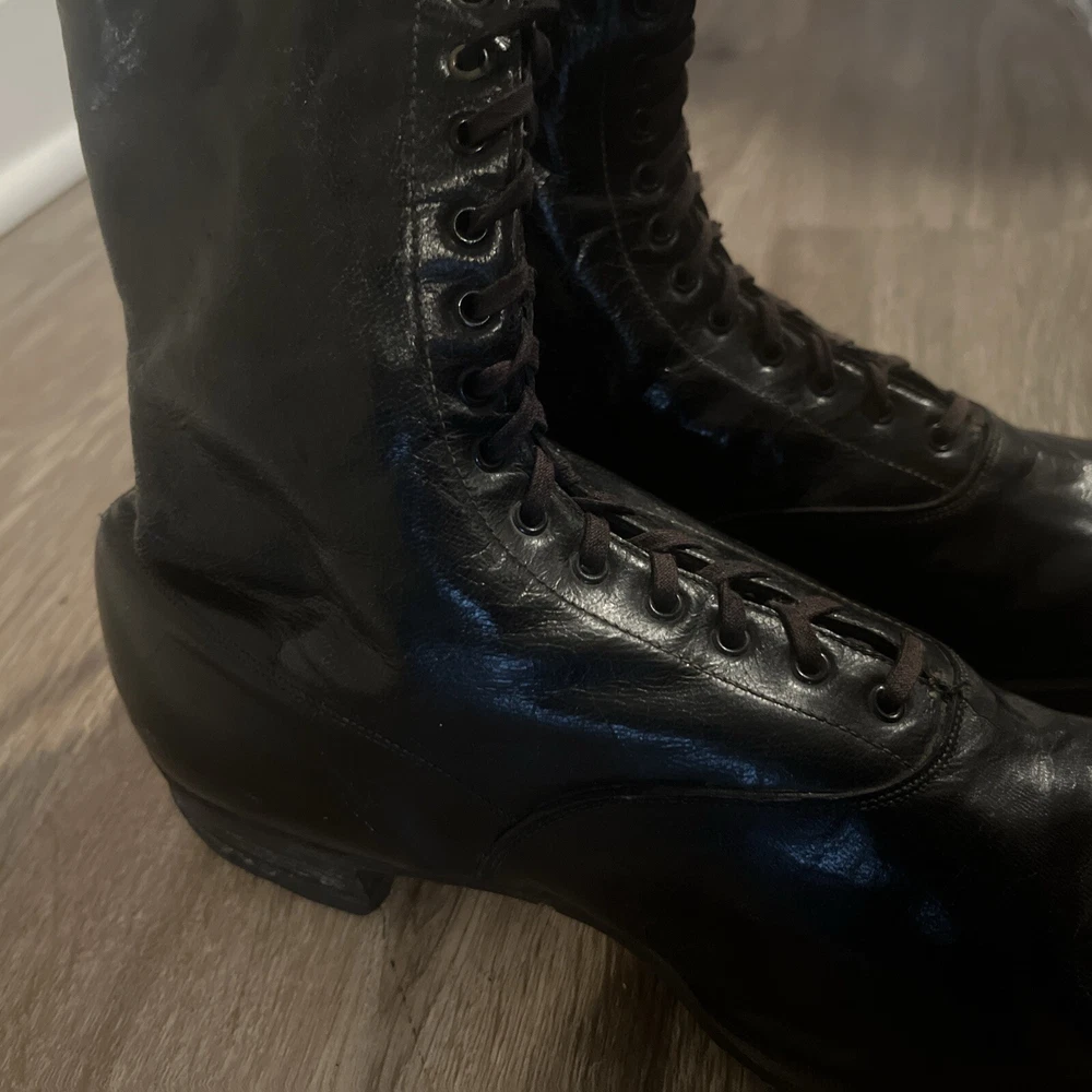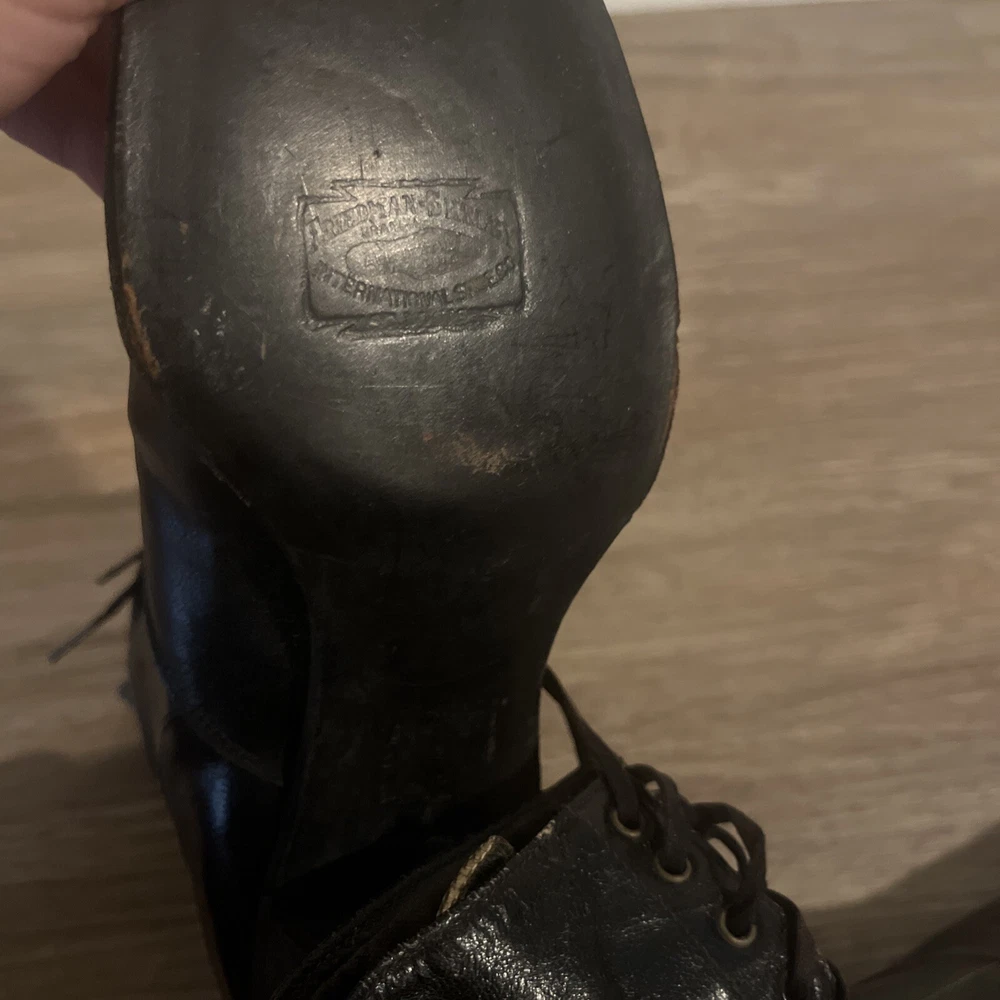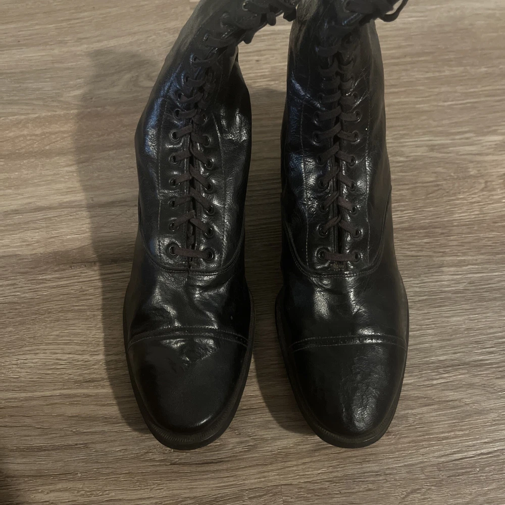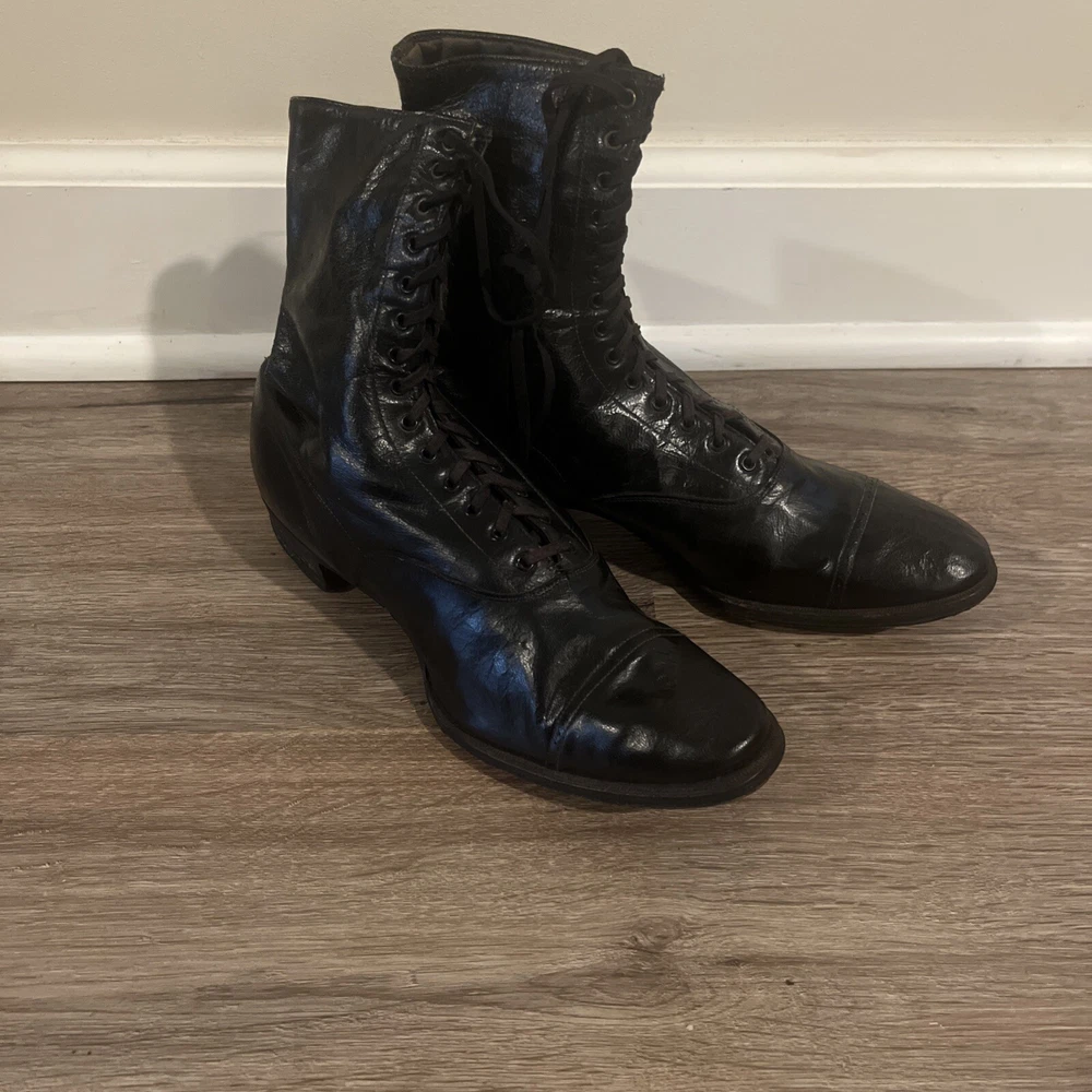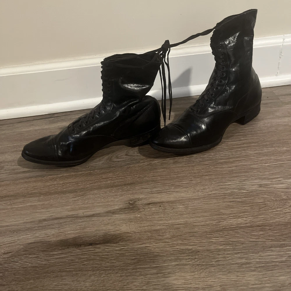 These are ladies Victorian boots from the 1890s, black in color with a lace-up design. Made of leather by Friedman Shelby International Shoe Co., they are original and have a Victorian look. These boots are in a witch or shabby style, perfect for an Edwardian occasion. The US shoe size is 8. This pair of shoes contains solid leather outsole insoles heels and counters.