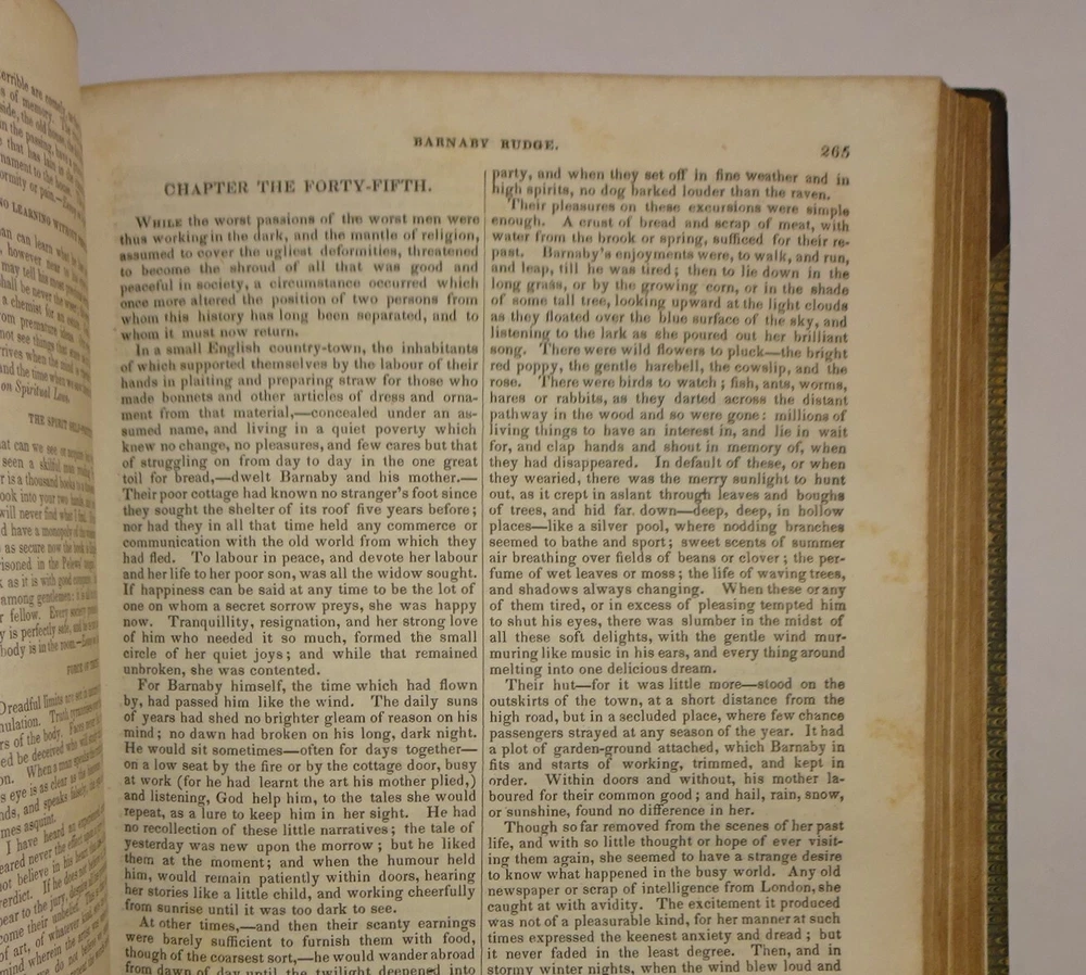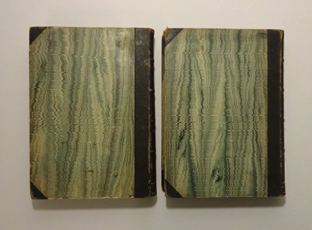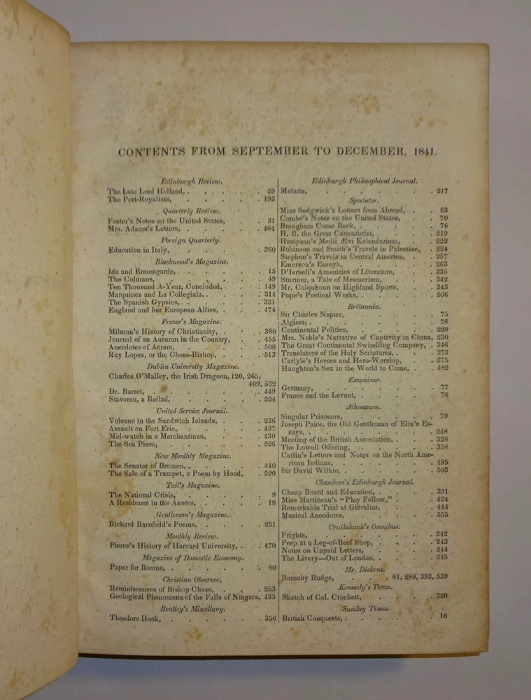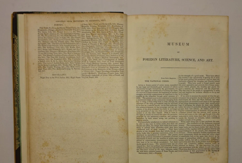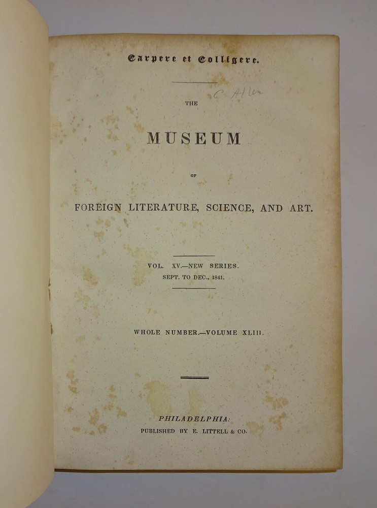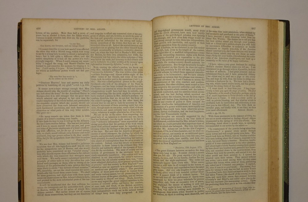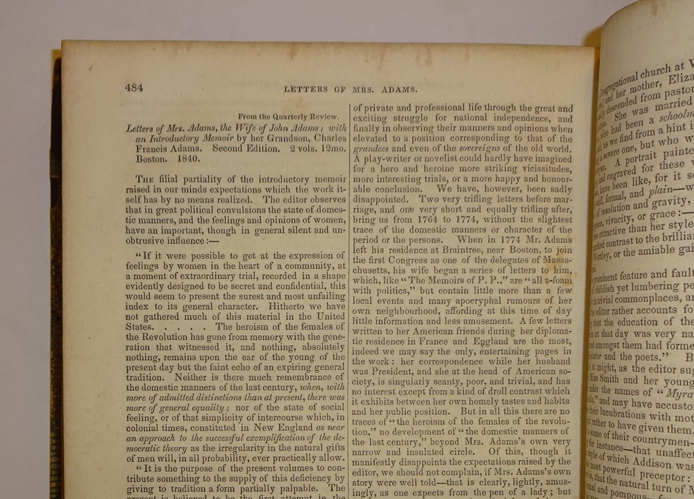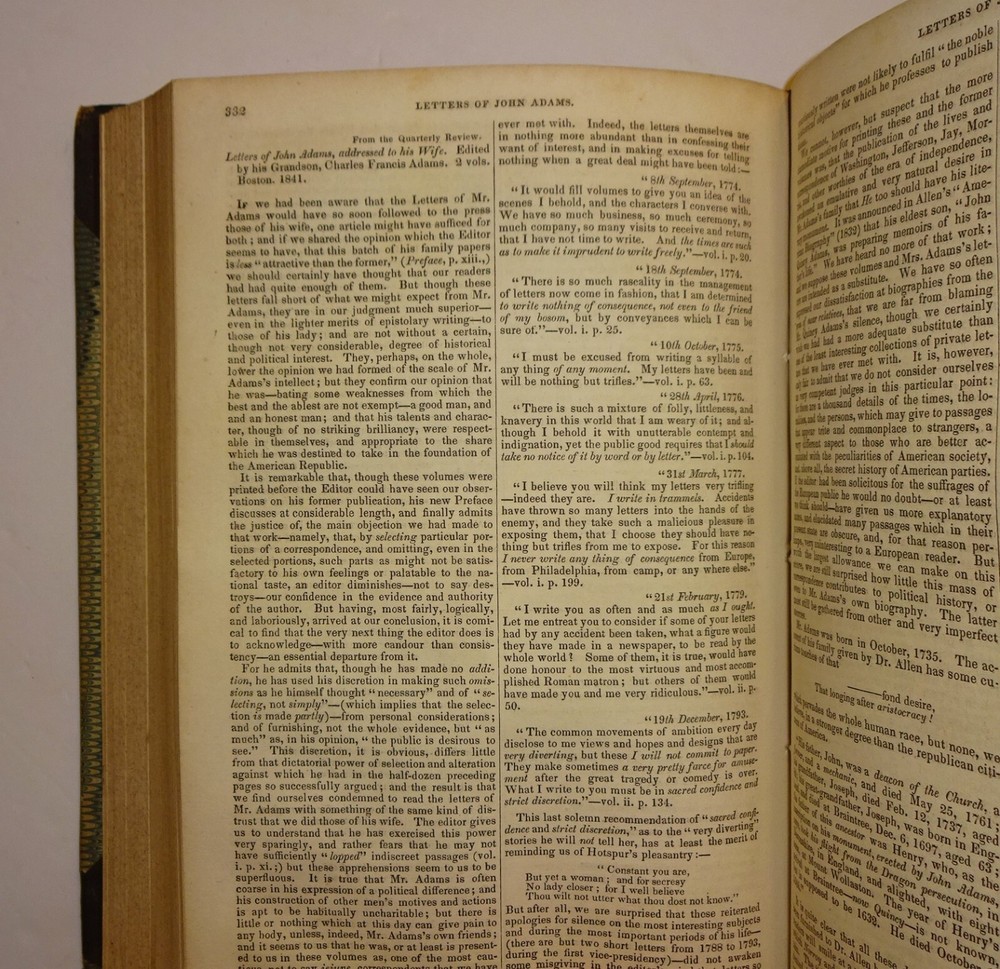 This is a collection of two volumes of the publication "The Museum of Foreign Literature, Science, and Art" from 1841 and 1842. Each volume contains four issues, as follows: 1841 - September to December; 1842 - January to April. The highlights of these volumes are reviews of the publication of the letters of JOHN and ABIGAIL ADAMS. The 1841 volume contains an 11 page review of the book "Letters of Mrs. Adams, the Wife of John Adams; with an Introductory Memoir by her Grandson, Charles Francis Adams." The 1842 volume contains a 14 page review of the book "Letters of John Adams, addressed to his Wife. Edited by his Grandson, Charles Francis Adams." The reviews contains excerpts of letters from each book. The volumes are bound in three-quarter leather with marbled covers and four raised bands on the spines. Other interesting content includes Barnaby Rudge and Master Humphrey's Clock (both incomplete) by Charles Dickens; Foster's Notes on the United States; The Spanish Gypsies; Anatomy of Suicide; King Arthur; Journal of an Autumn in the Country; Anecdotes of Actors; Pierce's History of Harvard University; Malaria; Geological Phenomena of the Falls of Niagara; Robinson and Smith's Travels in Palestine; Emerson's Essays; Sturmer, a Tale of Mesmerism; Mrs. Noble's Narrative of Captivity in China; Haughton's Sex in the World to Come; Catlin's Letters and Notes on the North American Indians; George Cruikshank's Omnibus; British Field Sports; Tower of London; Antiquities of Egypt; City of the Mormons; Letters of David Hume...and much more. Please see the photos for the complete list of contents.