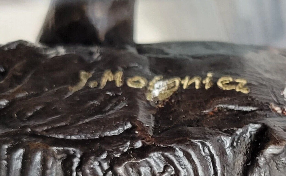 18LBS Signed ART Statue Bronze Marble wild boar Wild Pig & hunting dog WAR Art 18LBS Signed ART Statue Bronze Marble wild boar Wild Pig & hunting dog WAR Art Condition : This sculpture is in perfect condition Bronze Dimensions with Marble Base: Height 9 1/2" X Width 12" Marble Dimensions:12" X 7" Height without base:8 1/2" Weight:18 LBS Inventory:27-9944926572 Witness the captivating presence of the wild boar as it emerges from the forest's edge, exuding strength and defiance. This remarkable bronze sculpture captures the essence of this powerful creature with exceptional detail and artistry. From its alert gaze to the texture of its fur, every aspect of the boar has been meticulously crafted. Symbolizing warrior spirit, courage, and leadership in Celtic beliefs, the wild boar stands as a testament to bravery and perseverance. Its noble and fierce nature is beautifully portrayed in this handmade bronze sculpture, created using the ancient technique of lost-wax casting. The brown patina finish adds depth and character to the sculpture, highlighting the intricate details of the boar's form. Mounted on a black marble base, this sculpture becomes a striking focal point, whether displayed in a home, office, or gallery. The artist Moigniez's signature further enhances its quality and artistic value. Invite the spirit of the wild boar into your space and embrace the symbolism of strength and determination that it embodies. Wild Boar Pig Feral Hog Bronze Statue Sculpture Figure on Marble Base J. Moigniez 94492M Video will open in a new window Using the eBay App? Paste link into a browser window: [isdntekvideo] Shipping Terms : Most of our items are shipped via USPS (United States Postal Service) mail or UPS. Most orders are shipped within 24-48 hours of purchase. Please be aware that not all items are available for USPS shipping due to size and weight. We do ship to Hawaii, Alaska, Canada, Puerto Rico, APO/AE, and U.S. Virgin Islands, however, an additional charge may be required. Please contact us before making any purchases in these areas. For Non-USA customers, you may be responsible for all duty, tax, brokerage fees that may be due upon delivery (shipping costs cover freight charges only). We also ship internationally. Please refer to the "Shipping and Handling" chart for the rates for each area. Payment : We accept just about any form of payment. PayPal, Master Card, Visa or American Express credit cards. Money orders, cashiers checks, and even personal or business checks. For governmental institutions, we will also accept a purchase order. Please understand that for personal or business checks we have to wait for the check to clear (usually 7 days) before shipping. Condition : New Detailed Hand Crafted Hot Cast Bronze Satisfaction Guaranteed. This is Stock Photo, Slight Color Variation!! Listing and template services provided by inkFrog