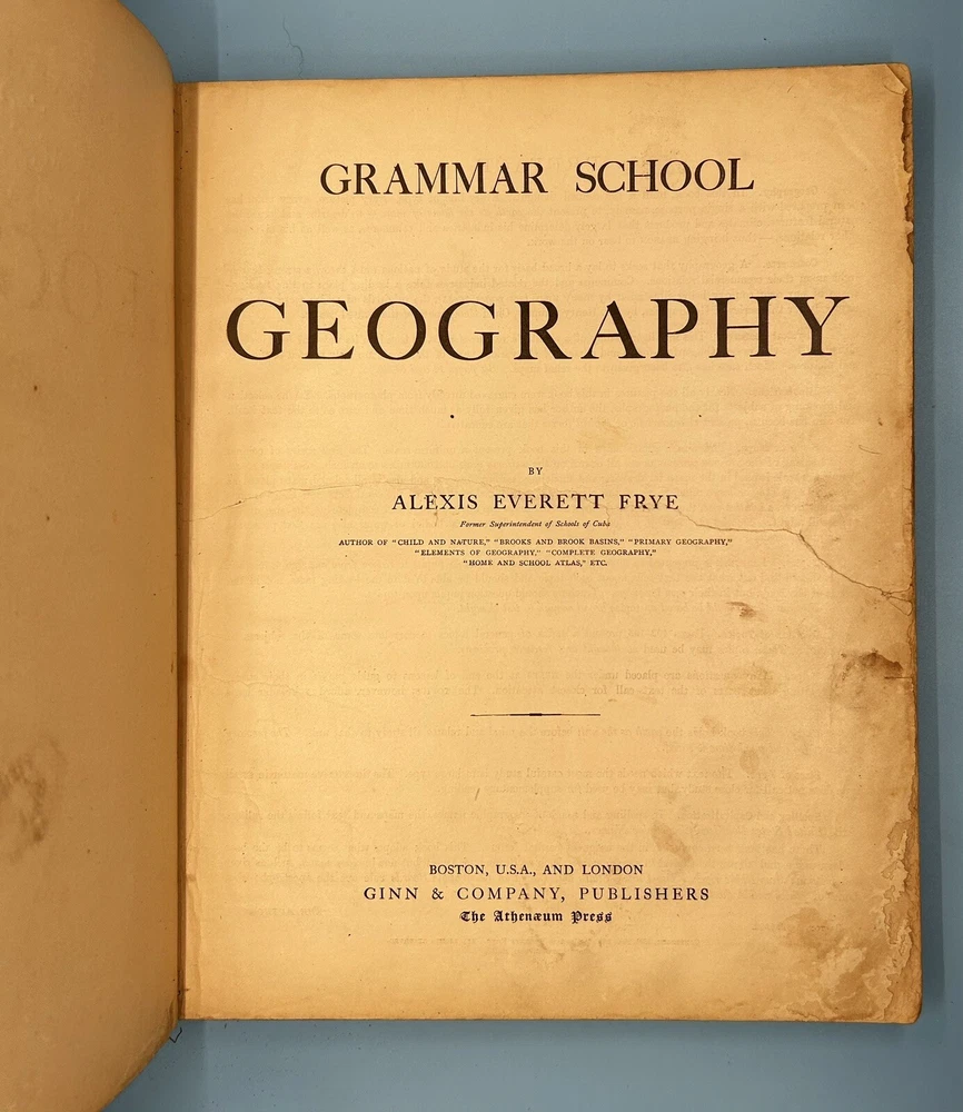 1902 Frye’s Grammar School Geography Harcover Book New Jersey Edition Ginn & Co. This is a pre owned item which has various cosmetic blemishes, including signs of wear, tears, markings and imperfections due to its previous use, age, movement, and storage. It should also be noted that color may vary from photos due to camera flash or/and computer monitor color variations. If condition concerns you, please review the images closely before purchasing, zooming in as necessary. Questions are also welcomed. SKU DL/30/3/23