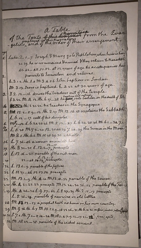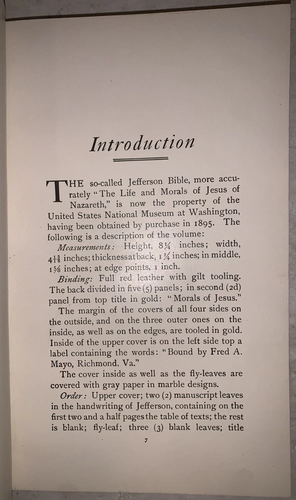 The Life and Morals of Jesus of Nazareth Extracted textually from the Gospel in Greek, Latin, French, and English by Thomas Jefferson With an Introduction Washington: Government Printing Office 1904 First Edition Limited Edition, intended primarily for members of Congress. With an ink stamp that reads "With the Compliments of J. A. Goulden," indicating that this copy was distributed by United States House of Representatives member Joseph Aloysius Goulden of New York. Octavo, 19 pages, followed by a facsimile of the Jefferson Bible. Bound in the original full red leather with ornate gilt decoration to boards and spine. Marbled endpapers. Some rubbing and wear, hinges cracking, discoloration to leather, damage to spine, else in good + condition. The Life and Morals of Jesus of Nazareth, often referred to as the "Jefferson Bible," is a unique work created by Thomas Jefferson around 1820. Compiled for his personal study, Jefferson meticulously cut and pasted passages from the Gospels of Matthew, Mark, Luke, and John to produce a chronological account of Jesus’ teachings and actions, focusing exclusively on his moral philosophy. Omitting miracles, references to divinity, and the Resurrection, Jefferson sought to present Jesus as a moral teacher rather than a divine figure. Originally unpublished during Jefferson’s lifetime, the manuscript was rediscovered by the Smithsonian Institution in 1895 and first published in 1904 by the U.S. Government Printing Office. Initially distributed to members of Congress, the book gained wider recognition over time and remains a significant reflection of Jefferson’s Enlightenment-era skepticism toward organized religion and his admiration for ethical teachings. If you have any questions, feel free to ask, and don't forget to check out my other listings.