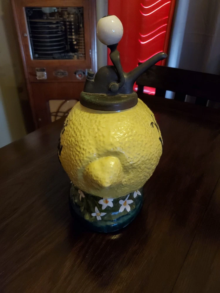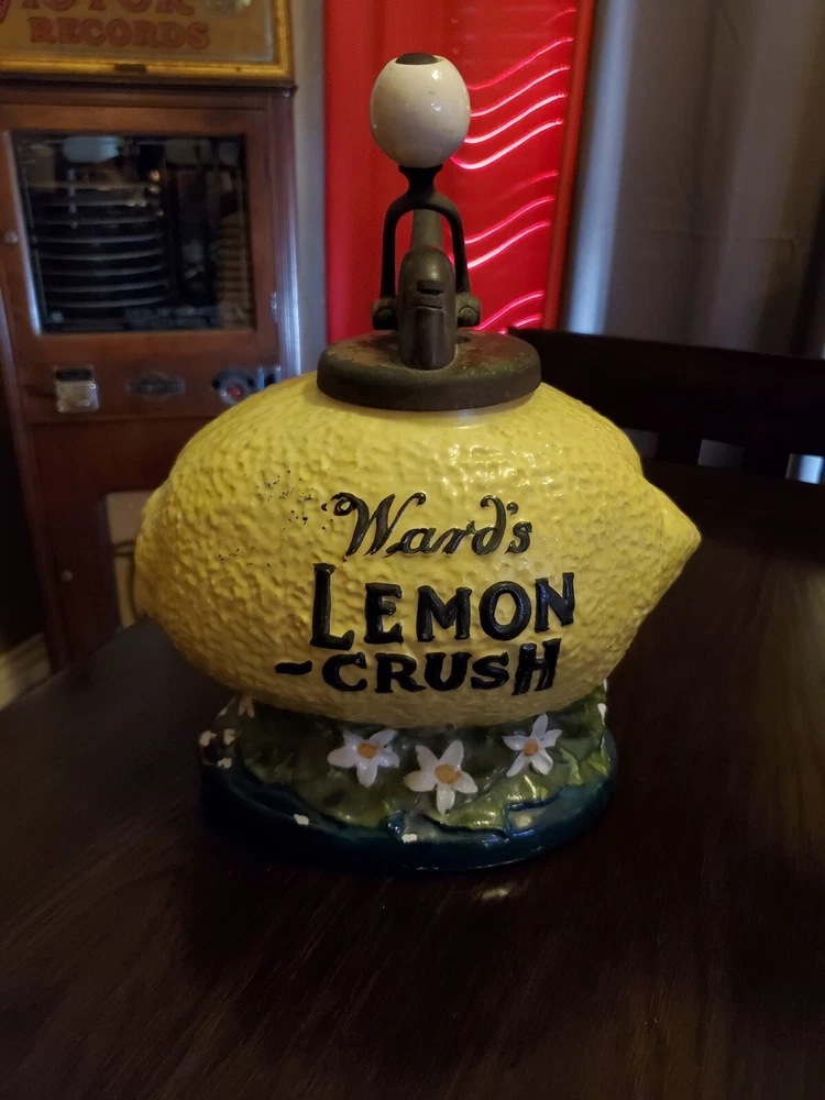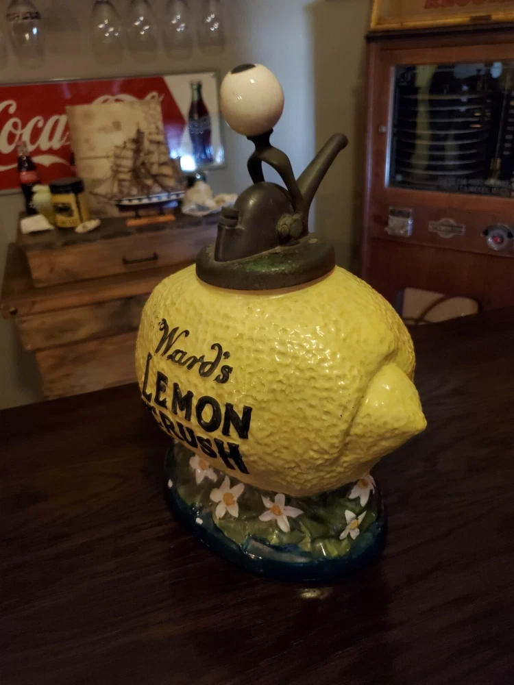 1918 Vintage WARD'S Lemon Crush Counter Top Soda Ceramic Syrup Dispenser. Beautiful amazing condition! Nothing really to speak of besides it being beautiful. See pictures for condition. Unfortunately shipping won't be cheap because of insurance and me paying them to professionally pack it. Last picture under Thomas flooring for serious questions