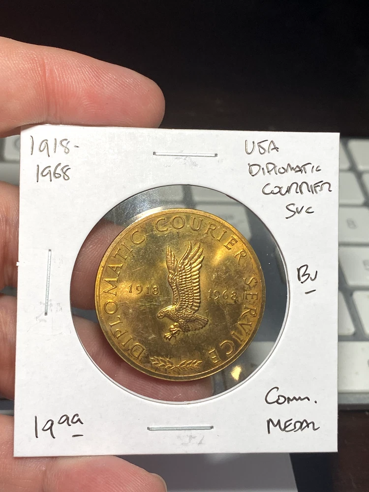 1918-1968 US Diplomatic Courrier Service Commemorative Medal This sale is for the item as pictured, but returns are welcome. I do not apply or use any filters or photography effects. Shipping for 1-3 items will be provided by USPS First Class Mail; Combined shipping via tracked USPS Priority Mail will be provided for all purchases of 4 items or above. Good luck, and happy buying!