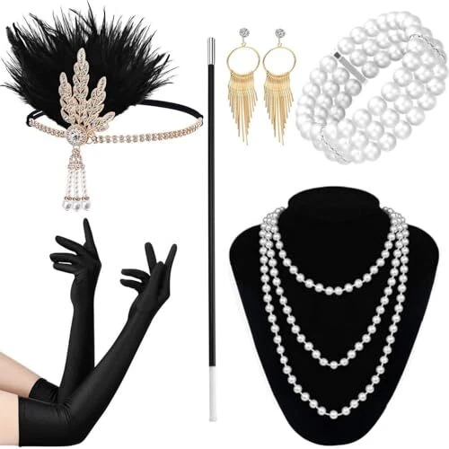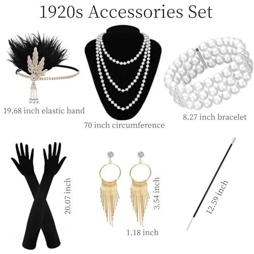 Return Policy Fast Delivery Trusted seller 1920s Accessories for Women Flapper Accessories Set Roaring 20s Flapper Headband, Earrings, Pearl Necklace, Bracelet, Gloves, Holder (Black) Product Description 20s Accessories for Women: Package includes 1 pcs black flapper headband, 1 pair of gold vintage earrings, 1 pcs faux pearl necklace, 1 pcs faux pearl Bracelet, 1 pair of long gloves, 1 pcs handheld prop 1920s Flapper Headband: The 1920s headpiece for women comes with elastic and the size fits most teens and adults, very comfortable to wear and take off. The 1920s headband is uniquely designed with sparkling crystals and feathers to match, which perfectly combines with your flapper dress and makes you stand out at the party Features of 1920s Accessories: The classic faux pearl necklace can be wrapped multiple times to add layers to the necklace. Unique vintage long gloves with stretchy, easy to wear and show elegance. The whole 20s accessories set complement each other and show the atmosp of 20s together. It can enhance your temperament and show your fashionable, elegant and beautiful features Occasions: Roaring 20s accessories for women are perfect for cocktai, prom, evening, event, dance and 1920s party, homecoming, masquerade parties, gifts, performances, cos-play costume, theme party or any other special occasion Size: Flapper headpiece set comes with 19.68 in elastic band, 20.07 in gloves, 12.59 in plastic holder, 3.54*1.18 in earring, 70in circumference necklace, 8.27in bracelet. Perfect 1920s flapper accessories set fits most teens and adults. (Tips: pearl necklace and bracelet needs to be ventilated for 1-2 days to disperse the smell) Shipping Returns Payment Shipping Shipping is FREE to all addresses other than APO/PO boxes in the lower 48 states. All our stock ships from US-based warehouses. Shipped via USPS or UPS (depending on location and package weight) Unless stated otherwise, all orders will ship within 24-72 hours of your payment being processed. Check our feedback to see the great reviews of FAST shipping we offer. Returns Seller does not accept returns Payment We currently accept payment via eBay managed payments only. Once payment is cleared, we will dispatch your shipment within 1-3 business days. Please refer to the "Shipping" tab for more information regarding shipping speed to your destination.