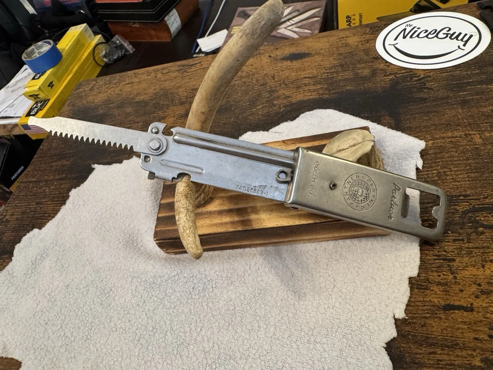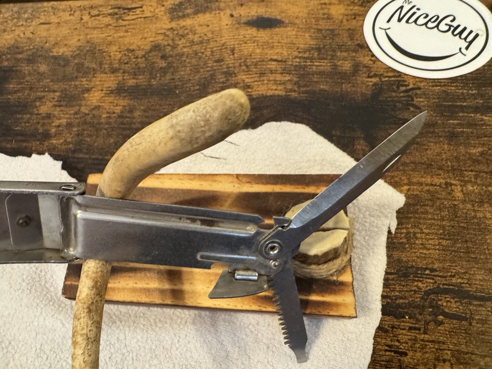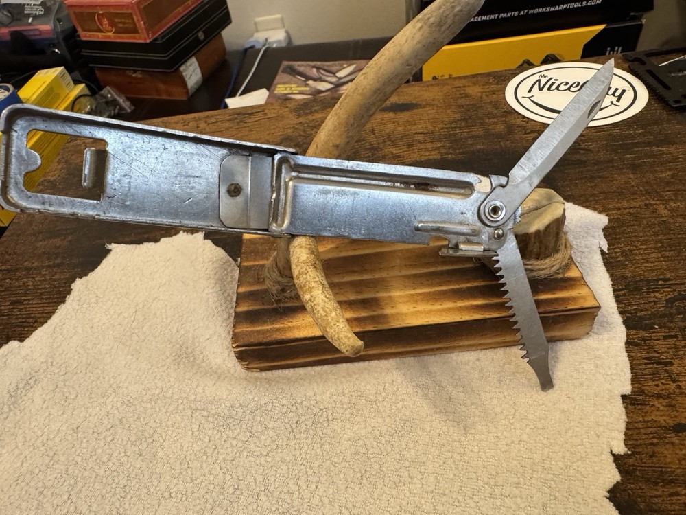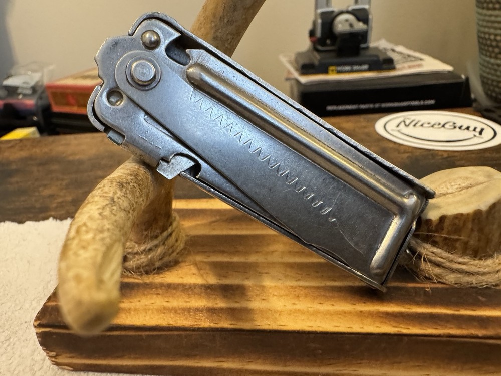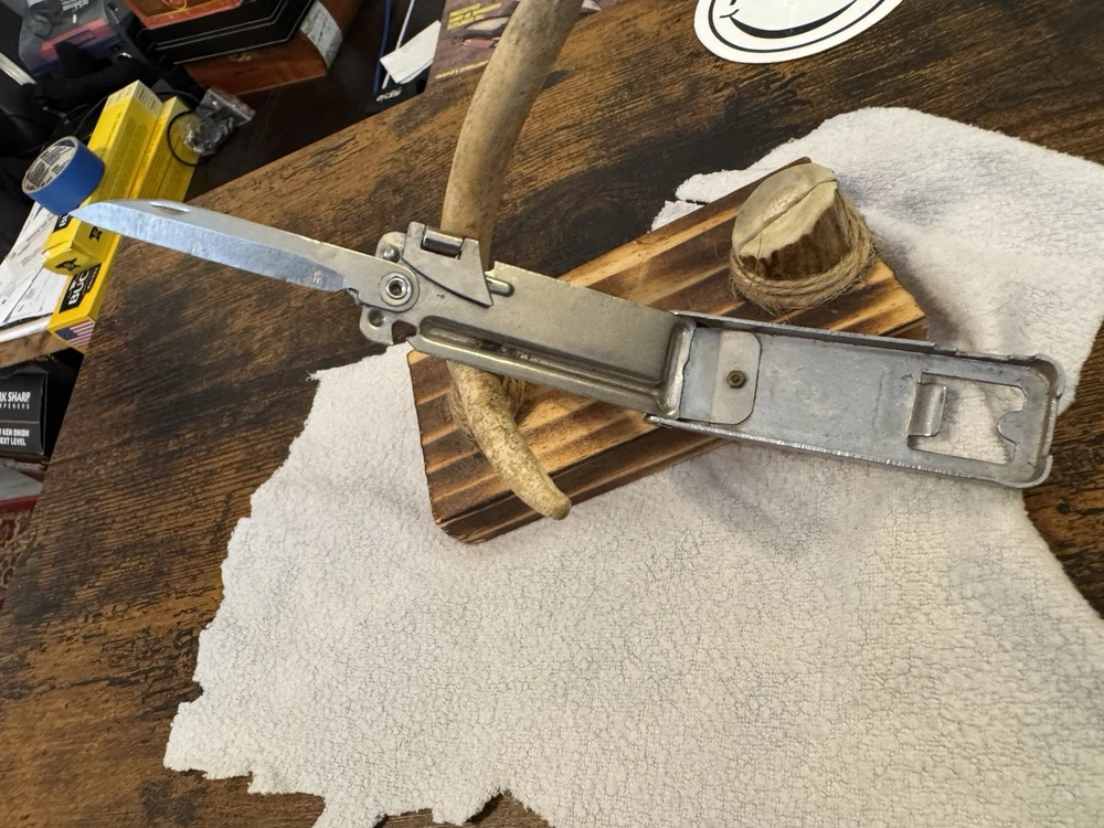This vintage multi-tool knife from the 1920s features three blades and a bottle opener. It is an original United States manufactured item with a stainless steel handle. The item is believed to be a manufacturer's sample due to its unique design and vintage nature.