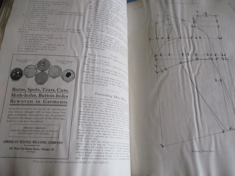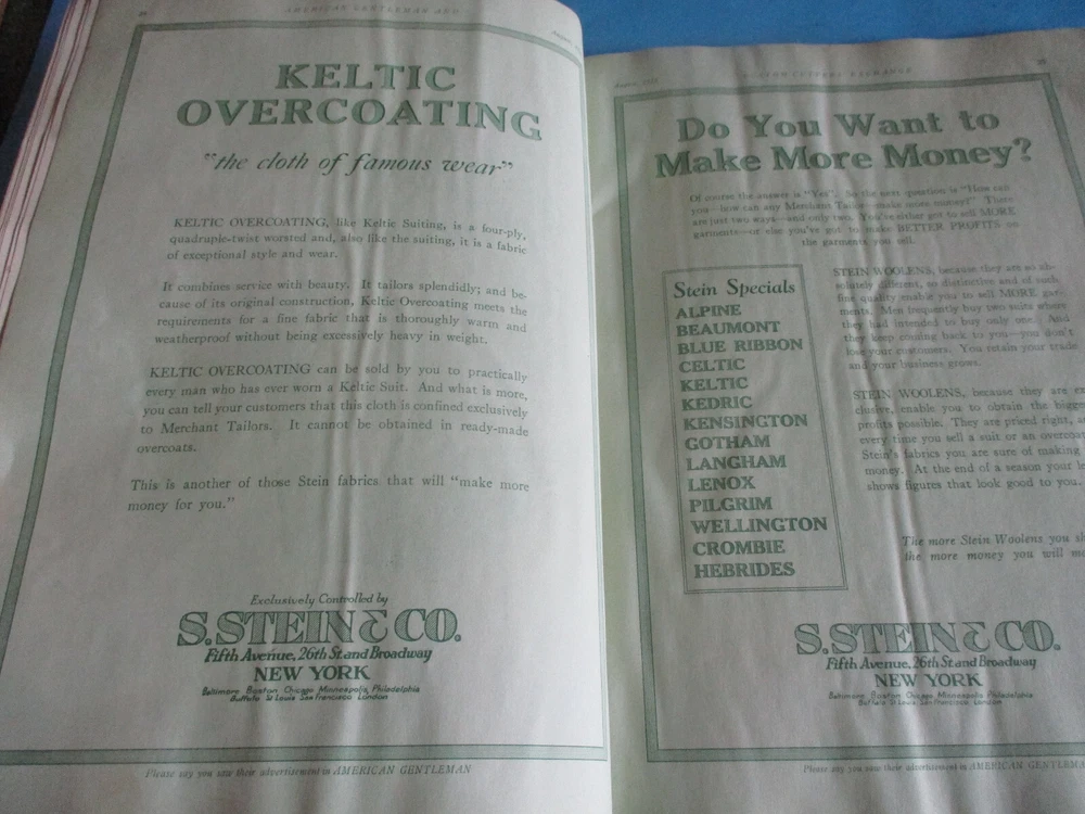 ANTIQUE AMERICAN GENTLEMAN FASHION JOURNAL OF THE CUSTOM TAILORING TRADE DATED 1925 PUBLISHED BY AMERICAN FASHION CO., NEW YORK CITY, N.Y., U.S.A. IT MEASURES 14" LONG & 10" WIDE COVER ON FRONT HAS A FEW SMALL TEARS & SMUDGING; BACK COVER GOT WET AND SOME PAGES ARE STICKING TOGETHER; 68 PAGES ARE IN PRETTY FAIR CONDITION - BUYING "AS FOUND" NO RETURNS WE SHIP QUICKLY!!