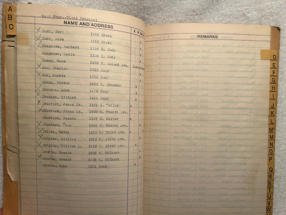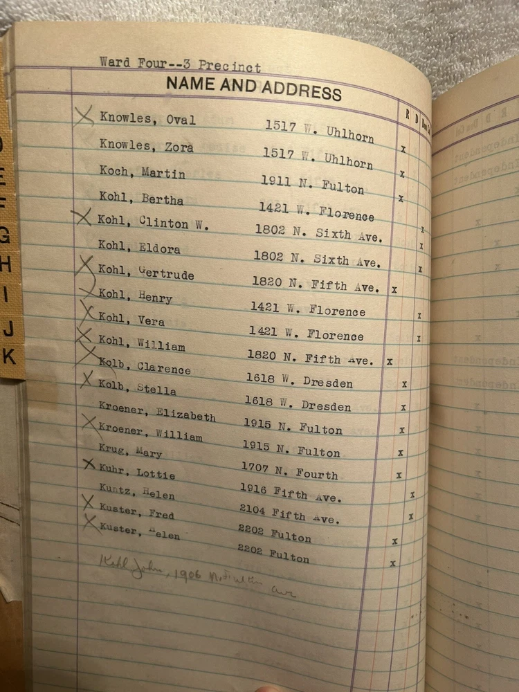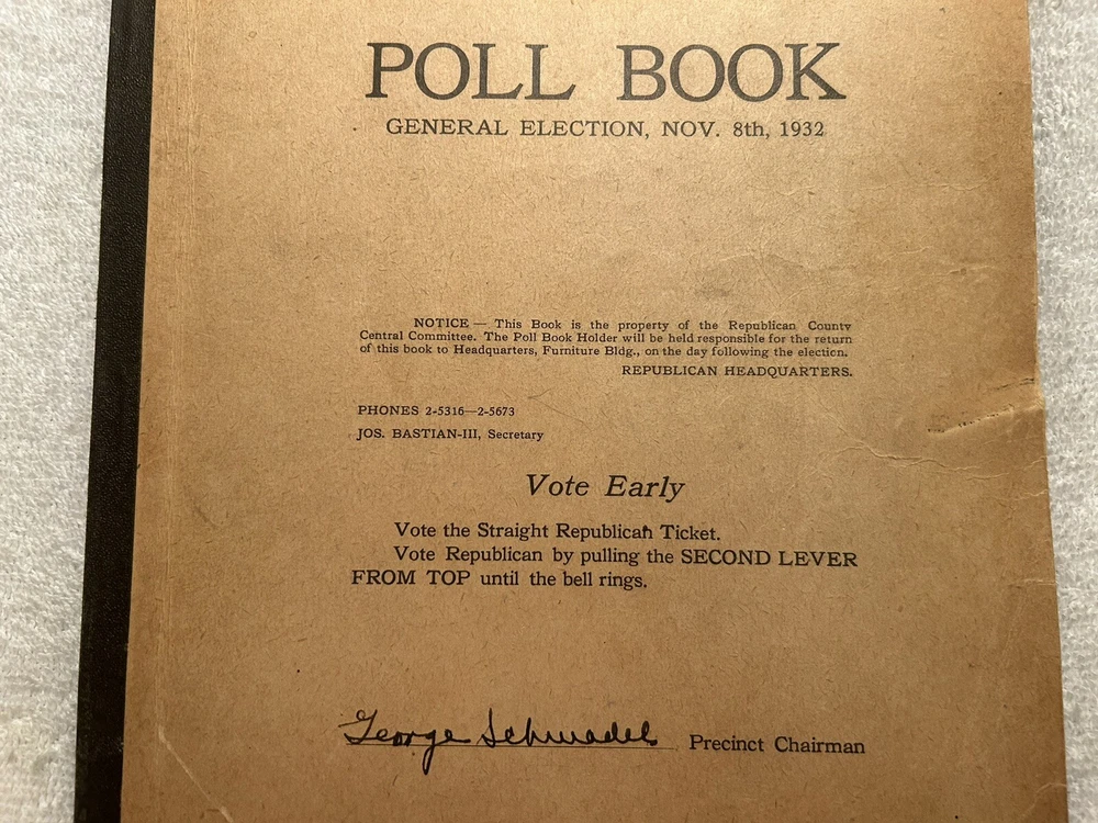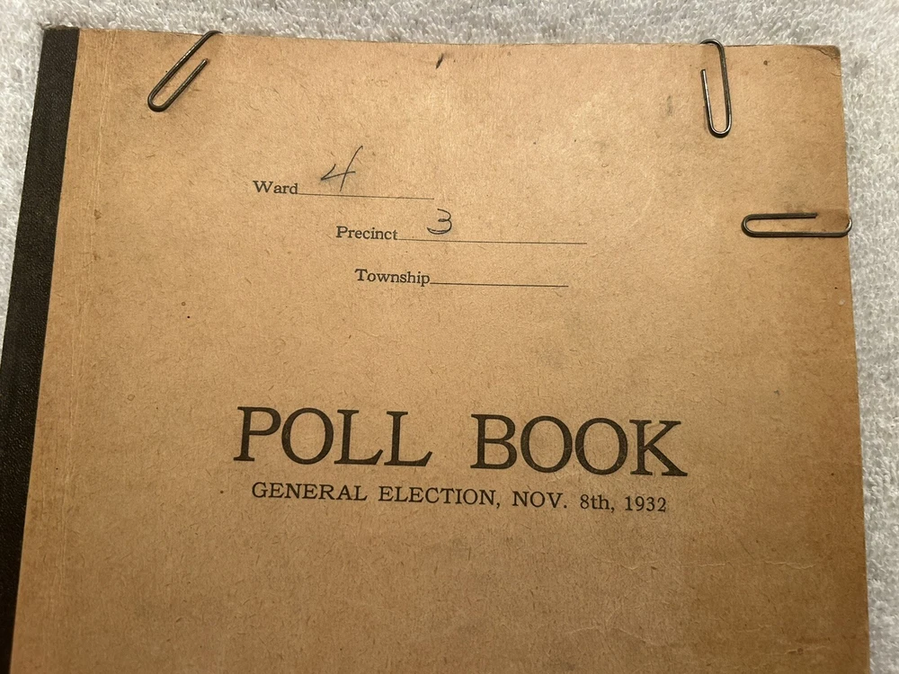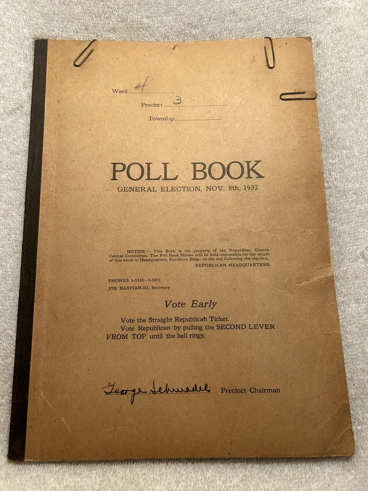 For sale is an original poll book that was used in the November 1932 general election in Evansville, Indiana. Issued by the Republican County Central Committee, it contains an alphabetical list of names of eligible voters, and their addresses, in Ward 4, 3rd Precinct. It is signed on the front cover by precinct chairman George Schmadel. This softcover book measures 8 by 11 inches and is in very good condition. It is a one of a kind item and would be a wonderful addition to any collection of Evansville or political memorabilia. See my listings for other items, including similar books. I gladly combine shipping fees for multiple purchases when they can be packaged together, and I do ship internationally. Please contact me with any questions, and thanks for looking!