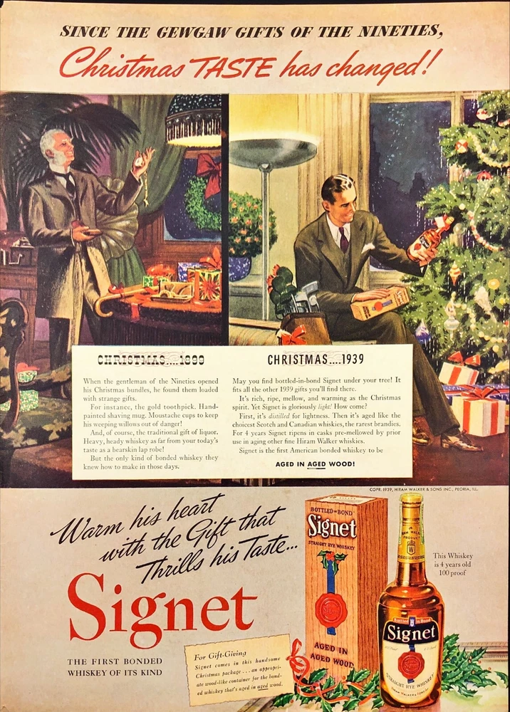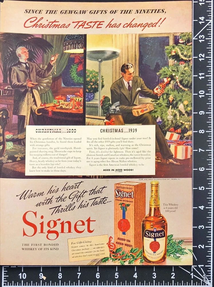1939 Signet Whiskey Gentlemen Christmas Tree Vintage Print Ad Full Page Advertisement Original advertisement taken from a magazine published in Dec 1939 **See Photos for dimensions of the Advertisement. ------- Thanks for checking out this item. Please carefully view all of the photos for this listing - they are an important part of the description . I don't use stock photos or pictures sourced from third parties. The pictures you see are taken by me and show the product you're buying. Depending on the light, the pictures may not reflect the true color. If color is an issue, please message me and I can check for you. Any questions you might have about items in my store are always welcome. I'm happy to combine shipping when you purchase multiple items. Just buy the items, and then wait until you are invoiced to pay (within one business day). Unless noted above, all of my ephemera products are Original and free of rips or tears. Vintage print ads invariably have some degree of wear, especially near the binding. Also, some fading is possible, as is the smudge or run of inks during production. If it's obvious that color has bled due to exposure to humidity or water exposure, you will see a ***CONDITION NOTE*** above. The small holes resulting from saddle-stitch (staple binding) may or may not be present on the piece. They will NOT be noted unless they're abnormal in some way. If their presence might affect your decision to purchase, or your satisfaction upon receipt, please feel free to ask first. I'm happy to provide additional details. As always, and as stated above, my pictures are your best source of information about this piece. As expected with vintage paper, there may be some natural darkening, and foxing may be present. I do not sell ephemera with evidence of mold, mildew, odor, or pest damage. Generally speaking, I will not offer for sale an item with any substantial condition issues unless it's of great quality, scarcity, or it has some other exceptional characteristic, and the issues would be described in detail. Thanks for stopping by Back Yonder Pickers. I'm a part-time reseller of vintage, retro, and quaint items of good quality. Check out more of the items in this store for awesome examples of ORIGINAL, beautiful, interesting advertising from bygone days. Don't forget to add my store to your "favorites" if you like what you see. Then you'll be notified of new items, discounts, and special offers.