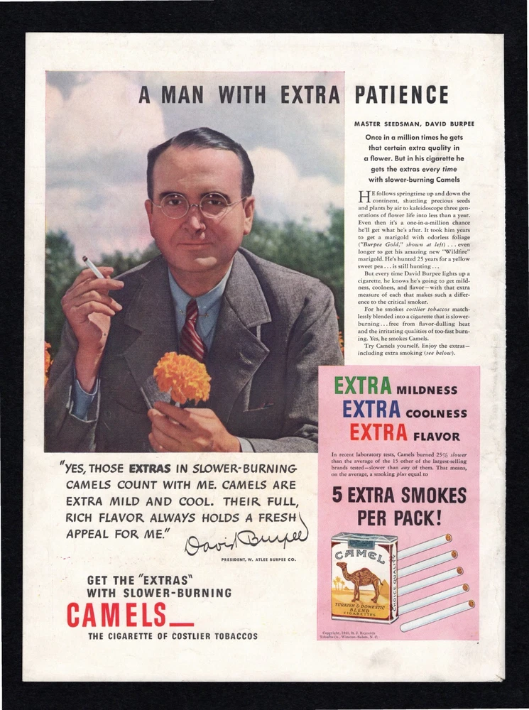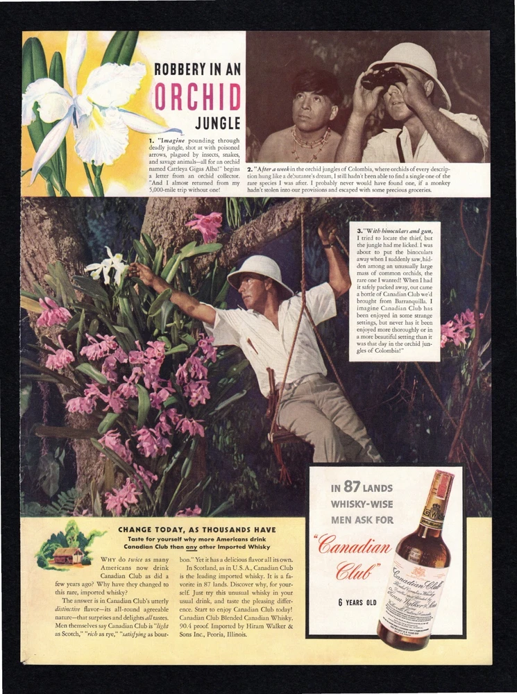 1940 Canadian Club Whisky Camel Cigarettes David Burpee Life Magazine Print Ad Original Advertisement Page Placement: Exterior Page, back of magazine A single page, with both sides scanned and described. Suitable for Framing Ad Description/Company Name: Side 1: Full Page, Color Canadian Club 6 Years Old Blended Whisky in 87 Lands Whisky-Wise Men Ask for Canadian Club Robber in an Orchid Jungle Side 2: Full Page, Color Camel Turkish and Domestic Blend Cigarettes A Man With Extra Patience Master Seedsman, David Burpee 5 Extra Smokes per packaging Extra Mildness Extra Coolness Extra Flavor Get the “Extras” with Slower-Burning Camels The cigarette of costlier tobaccos Note: Bottom corner is torn (see image). Also, the Camels side is the outside back of the magazine and is dirtier than an inside page would be. Ad Type: Full Page Publication Date: Oct. 28, 1940 Publication Name: Life Magazine Size: Approx 10.5 x 14” (May be slightly smaller after pages are trimmed from magazine) Condition: Used. These are very old magazines, some in better condition than others. Foxing, fading, and discoloration may be present with older paper items. Minor corner damage and slight ripples may be present. These are original pages taken from their original magazines, and the original owners may not have stored them optimally. Often these pages are brittle; please handle with great care when taking out of their packaging. The photos are scanned on a Black background. The pictures I show are the Exact same ad being sold . I take detailed scans of each one, please examine and make your own judgment. Your satisfaction guaranteed! Special Note for this ad: Bottom corner is torn (see image). Also, being the outer side of the back page, the Camels side is dirtier than an inside page would be. Ideal for: Collectors Historians Gifts Themed decoration for home or business Museums Magazine ads are shipped in: 2-mil Clear Polypropylene Magazine Bags with a white backer board, in a Rigid Mailer, in a sealed Poly Mailer, marked "Handle With Care, Do not Bend" and shipped USPS. We DO combine shipping for multiple purchases!