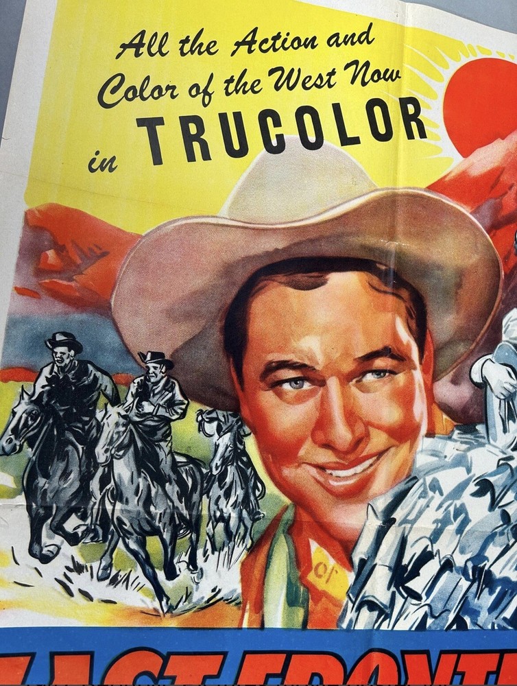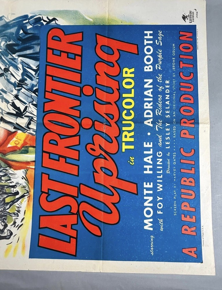 The vintage movie poster from 1947 titled "Last Frontier Uprising" features actors Monte Hale and Adrian Booth. This original 27" x 41" poster was produced in the United States during the 1940s. As a piece of entertainment memorabilia, this very rare poster captures the essence of classic movies from that era, making it a valuable collectible for fans of vintage films and Hollywood history. No others available on the internet. If you find one cheaper I’ll match the price and subtract % Some wear and a few small tears as seen in photos. Returns are accepted up to 30 days no questions asked, as long as it’s in the same or similar condition as when shipped. Thank you, Knows Picker