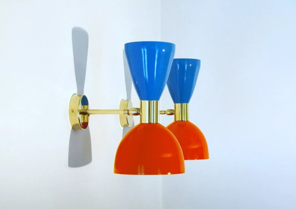 PRODUCTS DESCRIPTION 1950's Mid Century Brass Italian Diabolo Wall Sconce Light -Fixture 2 Bulb Pair We recommend 15W to 40W max. Light bulbs are not included. We hand craft all of our light fixtures. Wall Scones Table Light and chandelier has been made with brass & Metal minor variations in finish are an inherent characteristic of such material and add to the beauty and uniqueness of the product. - Measurements is : Height 10.4" inches - Diameter 5.6'' inches - Road Space From Wall 6" Inches Wall Canopy Dia 4.5Inches Color:AS Show Material: brass & Metal Size: Height 26 Cm - Diameter 14 Cm - Note : All color are available in this light at request if you want to change color please contact US -Wall Fixture used standard candelabra E-12 light bulbs. For USA and E-14 Bulb Holder For Europe