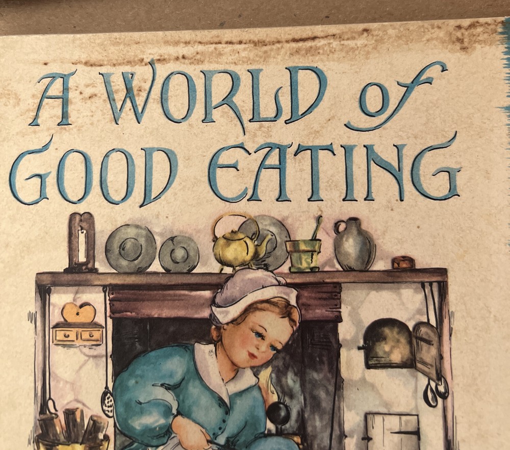 1951 A World of Good Eating Cook Book Spiral International Recipes Color Pages. Neat old book. Some staining primarily on top of front cover, at tops of some pages and back cover. Light wear at edges and corner. Front cover torn off spirals bottom two inches. Free media mail domestic shipping.