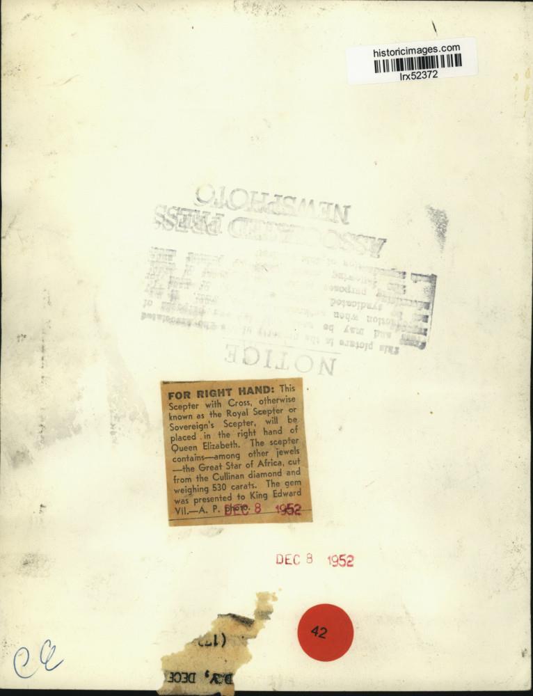 ebay template Note: Please study the images carefully to determine the condition of this vintage photograph, as it may not be in perfect condition. It may contain wrinkles, cracks, and possibly even tears due to its age and how it was handled before it got to us. A scanner may interpret colors and contrast differently than human eyes will, so it is possible that the actual photograph may be slightly darker or lighter in person. This vintage photograph is offered for sale as a collectible item and conveys no transfer of copyright. 1952 Press Photo Royal Scepter to be Placed in Right Hand of Queen Elizabeth This is an original press photo. This Scepter with Cross, otherwise known as the Royal Scepter or Sovereign's Scepter, will be placed in the right hand of Queen Elizabeth. The scepter contains--among other jewels--the Great Star of Africa, cut from the Cullinan diamond and weight 530 carats. The gem was presented to King Edward VII. Photo measures 7 x 9.25inches. Photo is dated 12-8-1952. PHOTO FRONT PHOTO BACK Historic Images Part Number: lrx52372 FAQs Q: Can I just download a digital version instead? A: No, we sell only vintage originals and do not make or distribute any copies, including digital ones. Q: Do you combine shipping and invoices? A: Multiple photos won on the same seller ID combine automatically through the eBay checkout process. If you encounter problems with this, send us a message via eBay messaging and we will send you an invoice. Due to eBay limitations, we cannot combine items won on our different seller IDs for a single shipping charge. Q: How quickly do you ship the items once paid? A: We ship within one business day after your payment clears. If you do not receive an "order shipped" email from us by the close of the second business day from submitting payment, please e-mail us via eBay messaging. Q: How do you make sure my photograph arrives safely? A: We package each order between two cross-corrugated pieces of cardboard to ensure that the package is as difficult to bend as possible. We then wrap each order in a plastic sheet to help protect against moisture. We want you to rest assured that we take every precaution to ensure that the photograph you receive will be in the same condition in your care as it was in ours. Q: Will the "Historic Images" watermark be on my photo when I receive it? A: No. This is a digital watermark we use to protect our images. It is not printed on the photo. Q: What are your office hours? A: eBay for us is a business, and a very fun one to be in! We are open M-F 9 to 5 (CST). Therefore, we do not return e-mails and phone calls over the weekend. We observe the following holidays: New Years Day, Memorial Day, Fourth of July, Labor Day, Thanksgiving and the day after Thanksgiving, Christmas Eve and Christmas Day. Q: Where did all these vintage photos come from? A: These original vintage photographs are from various news service and newspaper photo archives from locations around the country including: Boston, Detroit, Tampa, Chicago, Denver, Seattle, New Orleans, Milwaukee, Portland, Spokane, and more. We do not copy or reproduce any photographs -- every item is a unique vintage piece that was housed in a news archive. Q: Can I use this photograph in my book/blog/website? A: The short answer is no. There is no transfer of copyright for republication or reproduction with these photographs when you purchase them, and only photographs taken before 1923 are currently automatically in the public domain. Permission from the copyright holder, which usually can be identified from the back of each photo, must be sought to republish or reproduce the image for any purpose. Q: Do you relist items (in case I miss an auction ending)? A: Auction items that receive no bids are relisted in our store (historicimages-store on eBay) as a fixed-price item and at a higher price than the starting auction price. Q: Do you leave feedback? A: Yes, we always leave feedback for buyers. Our software monitors when our buyers leave us feedback, then notifies us that we can leave feedback for the buyer. Rest assured, if you leave feedback, we will do the same! Check out our family of eBay IDs: historicimages01 Sports Photos historicimages02 Entertainment Photos historicimages03 Americana Photos historicimages04 International & War Photos historicimages05 Transportation Photos historicimages06 Photos of All Subjects historicimages07 Entertainment Photos historicimages08 Newsworthy Photos historicimages09 Entertainment Photos historicimages10 Sports Photos historicimages-store Our largest fixed-price selection historicimages-gallery Hand-picked photos Saturday night auctions About Us Historic Images was formed in September 2009, with a handful of scanners working out of a basement to digitize newspaper photo archives. We have since moved out of the basement, and we can now archive thousands of photos per day. Our company has worked with magazines and newspapers from Detroit, Boston, Denver, Seattle, Tampa, Chicago, and New Orleans, just to name a few. We are constantly adding to our inventory, and have assembled an archive of millions of photos to date. As our company evolved, we began our eBay business, which brings thousands of fresh auctions per week to the world's largest online auction marketplace. Our custom software systems and team of great employees allow us to efficiently scan and sell large photo archives online. At the very core of our company's DNA is a strong commitment to customer satisfaction and strict integrity for our product. Our promise to you is that we will do everything in our power to provide you a great buying experience. Copyright 2009 - Present, Historic Images, Inc. Sell Smarter with Kyozou. Inventory and Ecommerce Management
