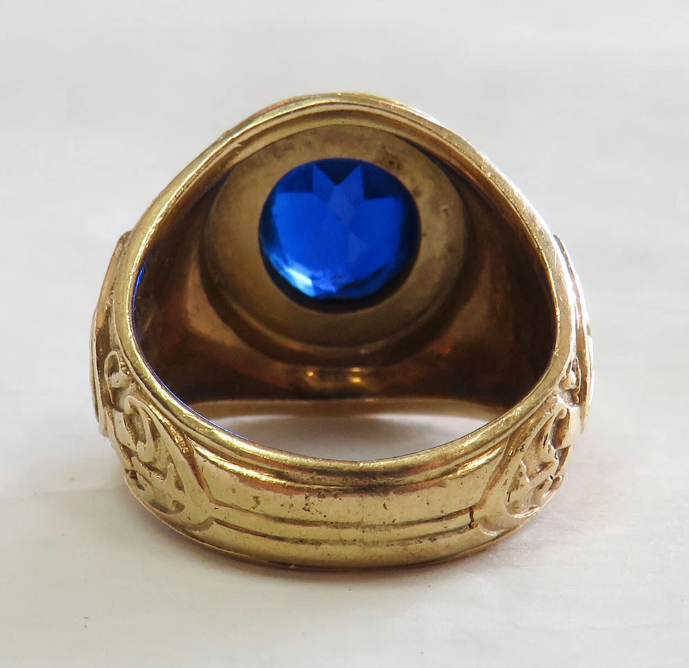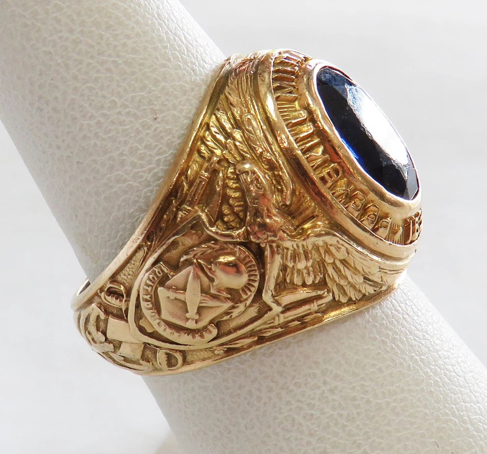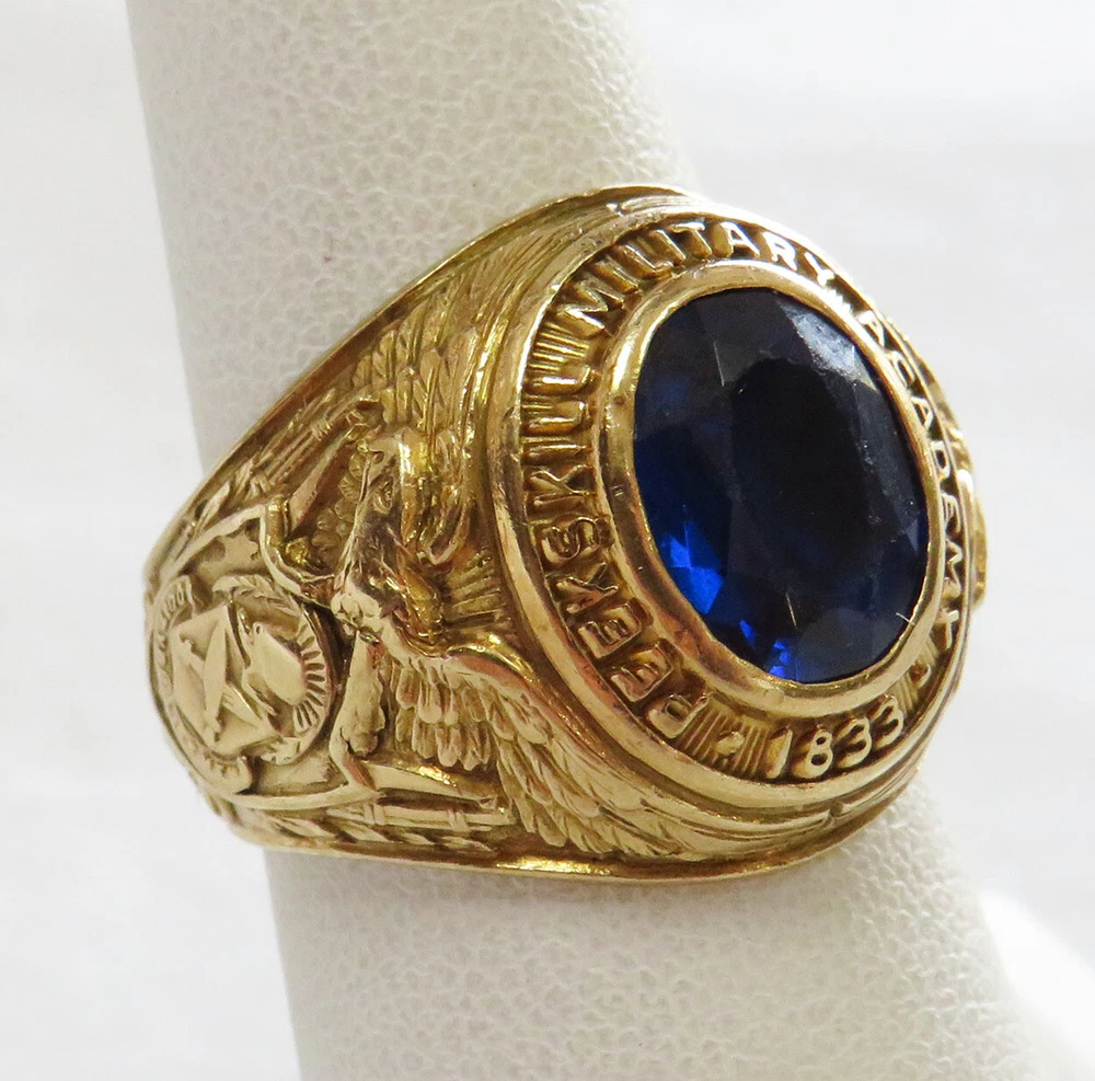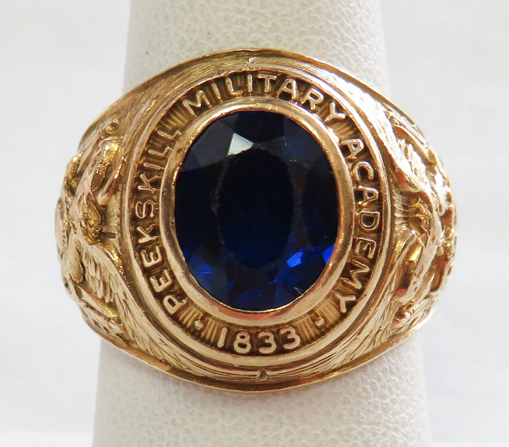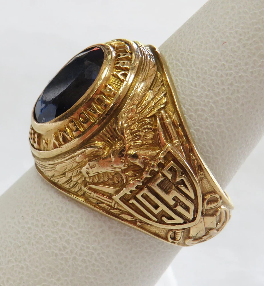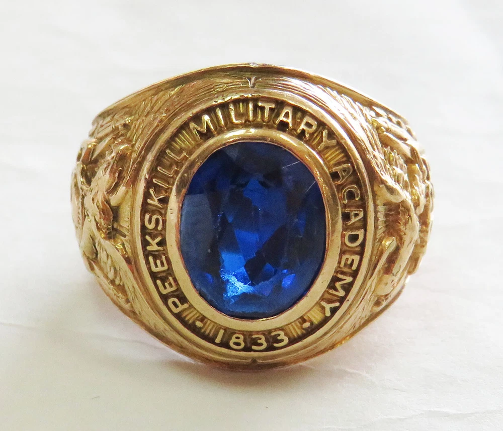 GOLD MEN’S 10 KARAT GOLD SCHOOL RING GRADUATING CLASS OF 1953 PEEKSKILL MILITARY ACADEMY ESTATE OF EDWARD JAMES MARKO , ESQ . PROMINENT FT. LAUDERDALE LAWYER THIS 10 KARAT GOLD CLASS RING IS WITH A FACETED BLUE SYNTHETIC STONE INSET INTO THE CROWN (CHIPPING FROM WEAR); ONE SHANK BEARS THE AMERICAN EAGLE CLUTCHING SHIELD WITH THE YEAR 1953; THE OTHER SHANK BEARS THE ARMS OF PEEKSKILL MILITARY ACADEMY; THE CROWN IS ENCIRCLED BY THE SCHOOL NAME AND THE YEAR OF IT’S FOUNDING; INSIDE IS INSCRIBED THE NAME OF THE GRADUATE, EDWARD MARKO. THIS CLASS RING BELONGED TO: EDWARD JAMES MARKO, ESQ. (B. FLUSHING, NY IN 1934 – D. FT. LAUDERDALE, FL IN 2017), MARKO WAS A PROMINENT LONG-TIME FORT LAUDERDALE ATTORNEY AND GENERAL COUNSEL FOR THE BROWARD COUNTY SCHOOL BOARD FOR 42 YEARS, MARKO GRADUATED PEEKSKILL MILITARY ACADEMY 1953, UNIVERSITY OF MIAMI 1957, AND MIAMI SCHOOL OF LAW 1962. THROUGHOUT HIS LONG LEGAL CAREER HE RECEIVED COUNTLESS AWARDS AND HONORS. THE RING IS FROM THE GRADUATING CLASS OF 1953 OF THE PEEKSKILL MILITARY ACADEMY . PEEKSKILL WAS A MILITARY ACADEMY FOR YOUNG MEN AND WOMEN, FOUNDED IN 1833 AND WAS LOCATED IN PEEKSKILL, NEW YORK. THE ACADEMY WAS BUILT BY A HANGING TREE WHERE A BRITISH SPY WAS EXECUTED IN 1777. DURING THE 1960S, THE NEW YORK JETS FOOTBALL TEAM USED THE ACADEMY AND ITS PLAYING FIELD AS A SUMMER TRAINING CAMP. AMONG ITS NOTABLE GRADUATES WAS FRANK L. BAUM, AUTHOR OF THE WIZARD OF OZ , AND ACTOR LEE MARVIN. WEIGHS 12.5 GRAMS 1OK GOLD SIZE 7 1/2