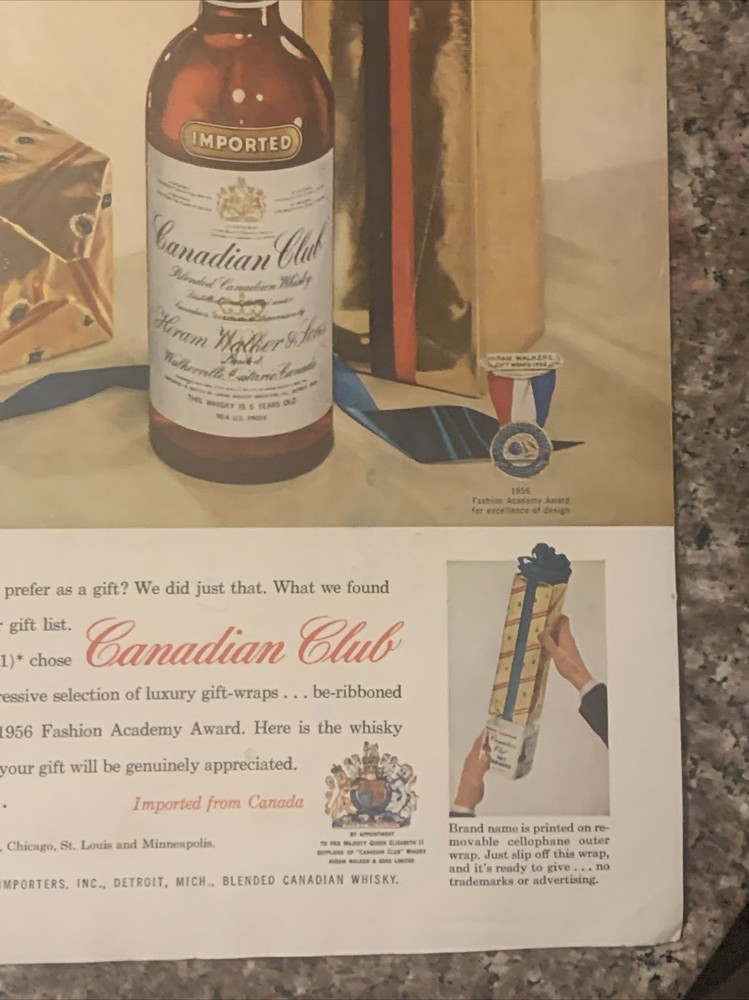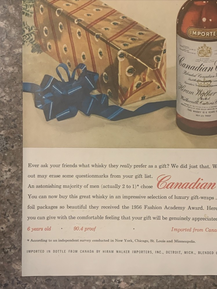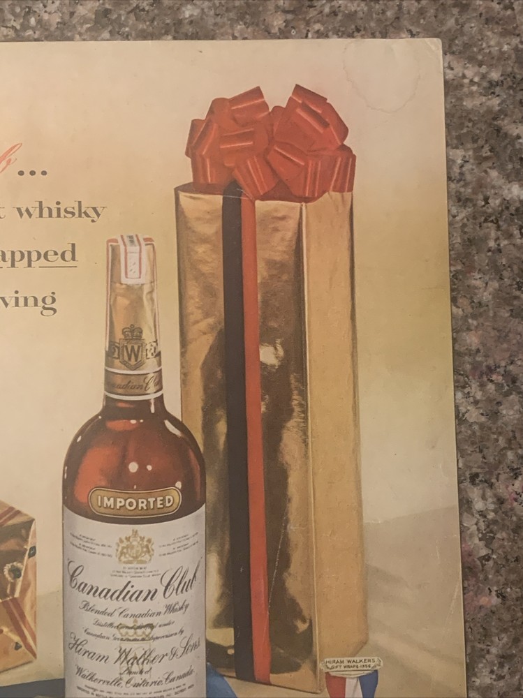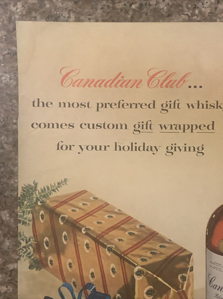 This vintage 1956 Canadian Club Whisky Christmas print ad is a perfect addition to any collection. The colorful multi-color design features the iconic Canadian Club brand and makes for a great gift or display piece. The ad is an original from the 1950s and was created in the United States, adding to its unique history and charm. Original approximate 10”x13” vintage magazine print ad.