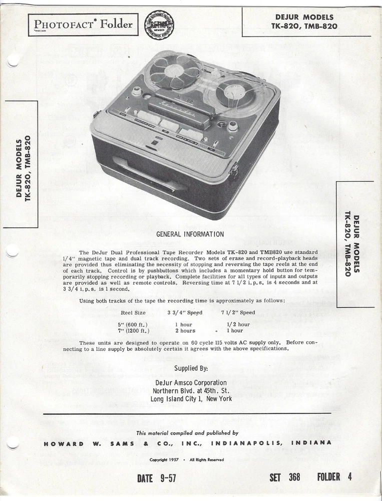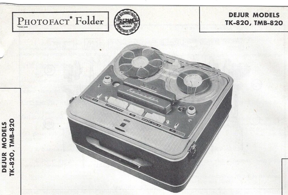 1957 DEJUR TK TMB-820 REEL To REEL Tape Recorder Photofact MANUAL Player Sams - 14 pages, with instructions, photos, parts list, schematics, etc. Condition: - Good used condition, with minor storage wear. - Please see all photos, thanks.