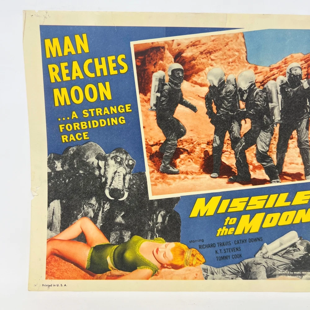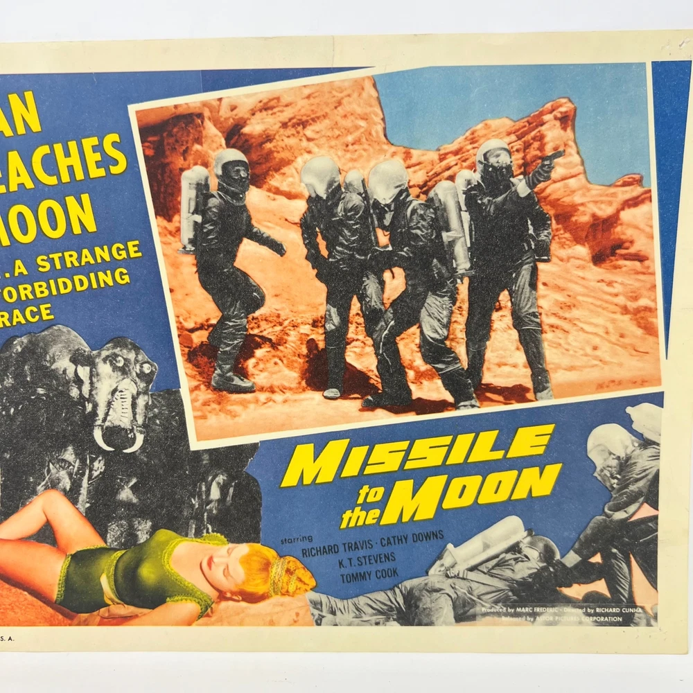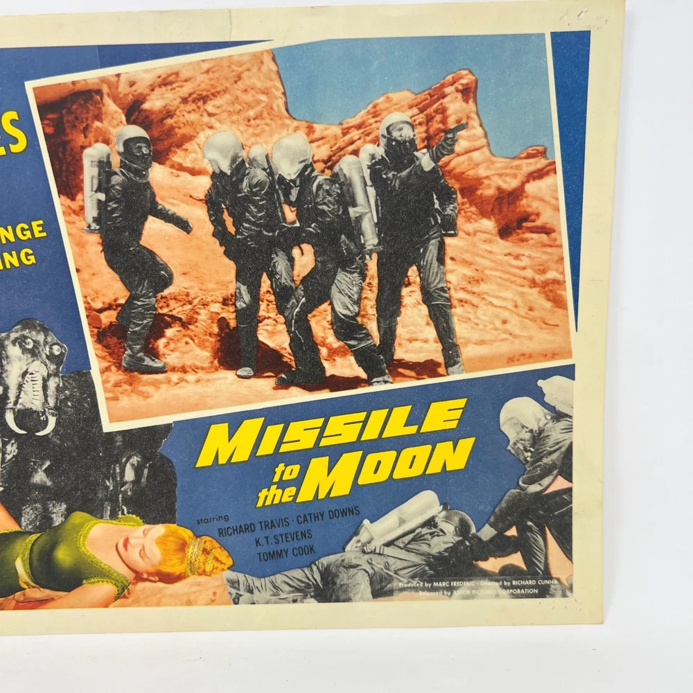 Missile to the Moon Man Reaches te Moom Collectible Movie Lobby Card Cards reflect some wear The cards can have pinholes, writing, and tape on them. See photos for details Choking Hazard Ages 4+ Product is intended for the Adult Collector Product may contain Sharp Points, Small Parts, and other elements not suitable for children