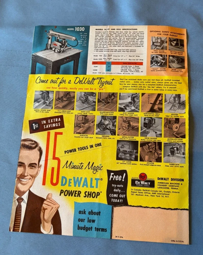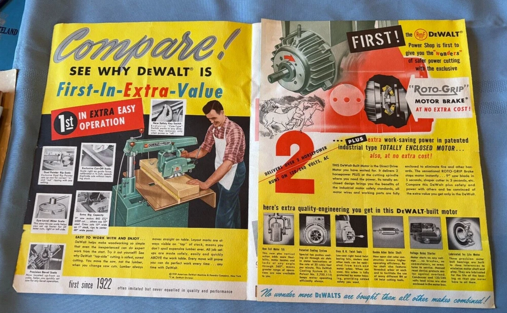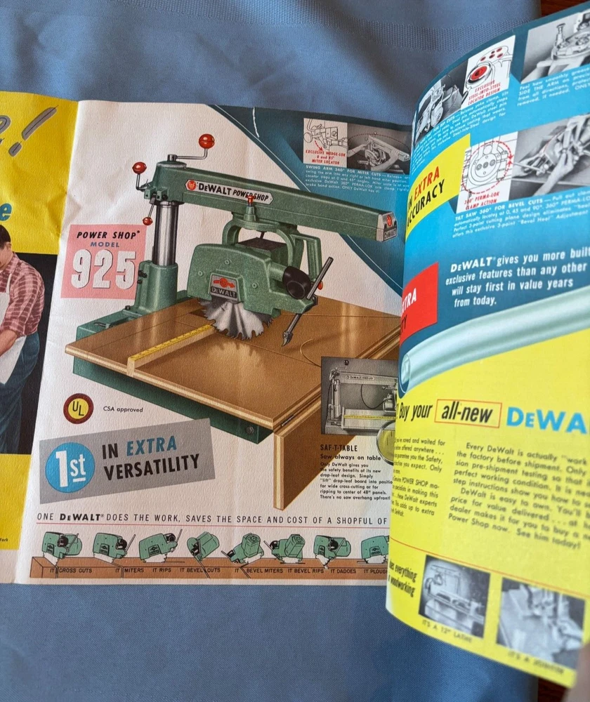 This interesting brochure was published in 1959 by DeWalt Power Tools. Titled, A DeWalt Power Shop. The brochure measures 11" by 8-1/2" & folds out into 3 panels. In good condition. Shows light wear along with small edge & corner chips Please see photos & description for details. Nice for the collector! Please check the shipping fee to your area, using the shipping calculator on this listing. Returns accepted within 30 days of purchase. Please contact me before returning. I strive for 5 star ratings & will do my best to make my customers happy!